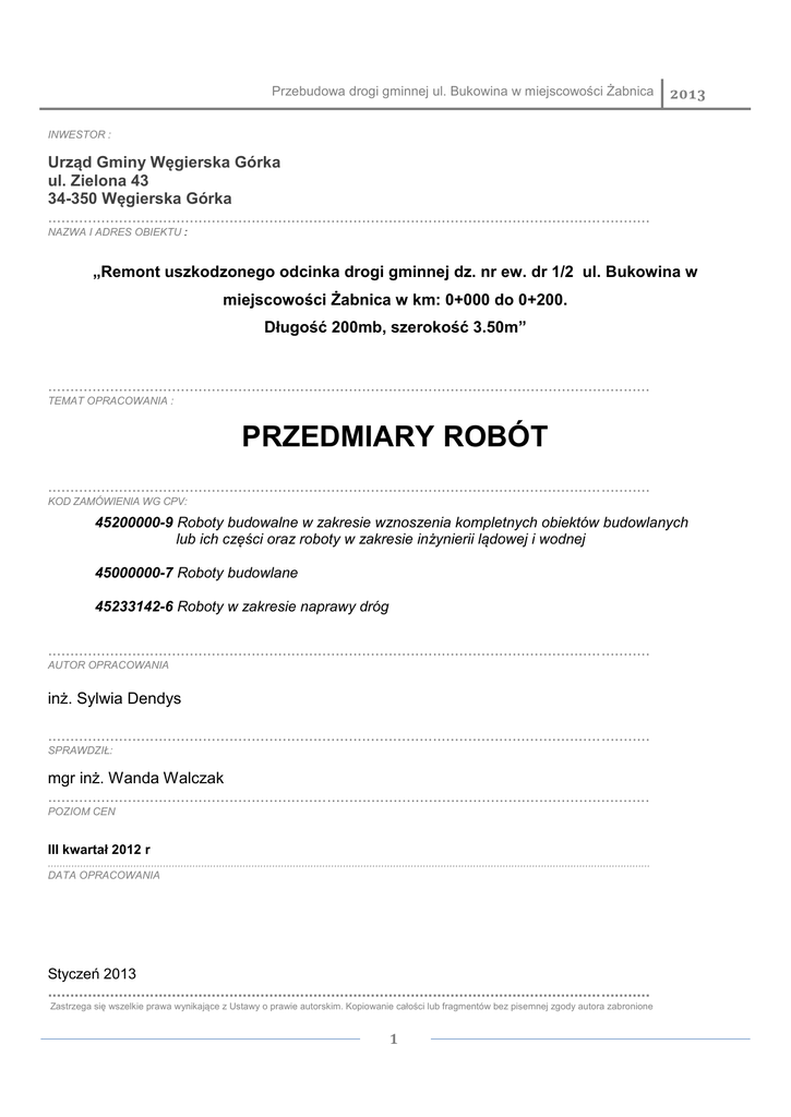 Przebudowa drogi gminnej ul. Bukowina w miejscowości Żabnica 2013 INWESTOR : Urząd Gminy Węgierska Górka ul. Zielona 43 34-350 Węgierska Górka ........................................................................................................................................ NAZWA I ADRES OBIEKTU : „Remont uszkodzonego odcinka drogi gminnej dz. nr ew. dr 1/2 ul. Bukowina w miejscowości Żabnica w km: 0+000 do 0+200. Długość 200mb, szerokość 3.50m” ........................................................................................................................................ TEMAT OPRACOWANIA : PRZEDMIARY ROBÓT ........................................................................................................................................ KOD ZAMÓWIENIA WG CPV: 45200000-9 Roboty budowalne w zakresie wznoszenia kompletnych obiektów budowlanych lub ich części oraz roboty w zakresie inżynierii lądowej i wodnej 45000000-7 Roboty budowlane 45233142-6 Roboty w zakresie naprawy dróg ........................................................................................................................................ AUTOR OPRACOWANIA inż. Sylwia Dendys ........................................................................................................................................ SPRAWDZIŁ: mgr inż. Wanda Walczak ........................................................................................................................................ POZIOM CEN III kwartał 2012 r ............................................................................................................................................................................................................ DATA OPRACOWANIA Styczeń 2013 ........................................................................................................................................ Zastrzega się wszelkie prawa wynikające z Ustawy o prawie autorskim. Kopiowanie całości lub fragmentów bez pisemnej zgody autora zabronione 1 Przebudowa drogi gminnej ul. Bukowina w miejscowości Żabnica Zawartość opracowania: 1) Ogólna charakterystyka robót 2) Założenia wyjściowe do przedmiaru. 3) Tabela elementów scalonych 4) Przedmiary robót 2 2013 Przebudowa drogi gminnej ul. Bukowina w miejscowości Żabnica 2013 1. Ogólna charakterystyka robót Temat obejmuje roboty ogólnobudowlane, drogowe i instalacyjne dla zadania „Remont uszkodzonego odcinka drogi gminnej dz. nr ew. dr 1/2 ul. Bukowina w miejscowości Żabnica w km: 0+000 do 0+200. Długość 200mb, szerokość 3.50m” Zakres prac obejmuje: A. Organizacja placu budowy B. Roboty instalacyjno- budowlane Mechaniczne frezowanie nawierzchni asfaltowej na zimno Wykonanie nakładki z warstw bitumicznych na istniejącej jezdni; Ścieki z elementów betonowych- typ korytkowy płytki Regulacje wysokościową pobocza oraz utwardzenie pobocza; Plantowanie skarp, dna rowów oraz skarp i korony nasypów Regulacja pionowa studzienek dla urządzeń podziemnych; C. Zakres prac końcowych: jest związany z likwidacją placu budowy i przekazaniem obiektu do użytkowania.. 2. Założenia wyjściowe do kosztorysu. a) Dane techniczne, technologiczne i organizacyjne mające wpływ na cenę: plac budowy zorganizowany w obrębie działek objętych zadaniem wraz z jego wydzieleniem poprzez ogrodzenie, odpowiednie oznakowanie i organizację ruchu z uwzględnieniem lokalnych warunków ( czynne obiekty wokół placu). zaplecze socjalne wykonawcy w ramach wydzielonego placu- pakamery przenośne wraz z niezbędnymi mediami. roboty prowadzone przy czynnych obiektach przyległych plac składowy materiałów bez ograniczeń w ramach przekazanego placu budowy dojazd możliwy samochodami do 12 t. roboty prowadzone dowolnymi jednostkami sprzętowymi. b) Dane metodologiczne tyczące wyceny. Metoda opracowania zgodnie z Rozporządzeniem Ministra Infrastruktury z dnia 18 maja 2004 r.uproszczona wg formuły CK =Σ L x Cj +Pv gdzie : CK- cena kosztorysowa, L- ilość ustalonych jednostek przedmiarowych, 3 Przebudowa drogi gminnej ul. Bukowina w miejscowości Żabnica 2013 Cj – cena jednostkowa dla ustalonej jednostki przedmiarowej, PV – Podatek towarów i usług VAT. ceny jednostkowe ustalone na podstawie danych wynikowych i analiz własnych wykonawcy. Uwagi: Składniki ceny jednostkowej. Cena jednostkowa i ceny umieszczone przy poszczególnych pozycjach kosztorysu inwestorskiego obejmują: : Wszystkie koszty niezbędne do wykonania robót wymaganej jakości , w wymaganym terminie, włączając w to : a) koszty bezpośrednie, w tym: - koszty wszelkiej robocizny obejmującą płace bezpośrednie, płace uzupełniające, , koszty ubezpieczeń społecznych i podatki od płac, - koszty zatrudnienia sprzętu budowlanego, niezbędnego do wykonania danej pozycji przedmiaru robót, obejmująca również koszty sprowadzenia sprzętu na plac budowy, jego montażu i demontażu po zakończeniu robót, - koszty materiałów podstawowych i pomocniczych do wykonania danej pozycji przedmiaru robót, obejmujące również koszty dostarczenia materiałów z miejsca ich zakupu bezpośrednio na stanowisko robocze lub na miejsce składowania na placu budowy, b) koszty ogólne budowy w tym; - koszty zatrudnienia przez wykonawcę personelu kierowniczego, technicznego i administracyjnego budowy, obejmujące wynagrodzenie tych pracowników nie zaliczane do płac bezpośrednich, wynagrodzenia uzupełniające, koszty ubezpieczeń społecznych i podatki od wynagrodzeń, - wynagrodzenia bezosobowe, które wg wykonawcy obciążają daną budowę, - koszty montażu i demontażu obiektów zaplecza tymczasowego oraz koszty amortyzacji lub zużycia tych obiektów, - koszt wyposażenia zaplecza tymczasowego w urządzenia placu budowy, obejmujące drogi tymczasowe, tymczasowe sieci elektryczne, energetyczne, wodociągowe, kanalizacyjne, oświetlenie placu budowy, zastępcze źródła ciepła do 