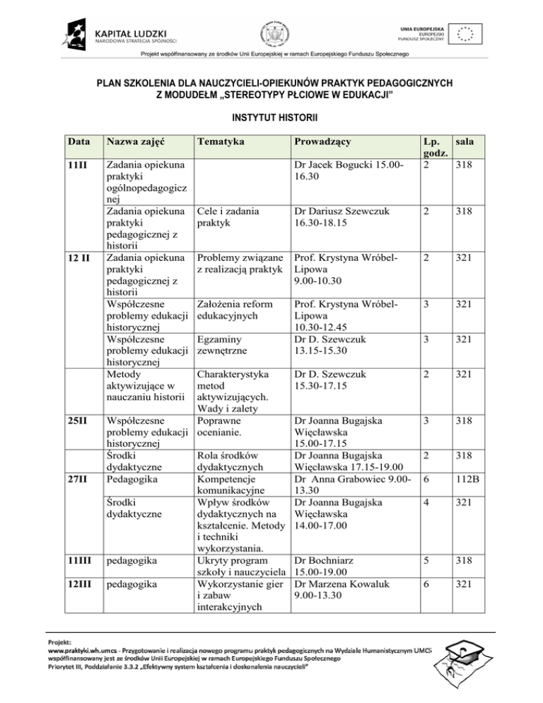 PLAN SZKOLENIA DLA NAUCZYCIELI-OPIEKUNÓW PRAKTYK PEDAGOGICZNYCH Z MODUDEŁM „STEREOTYPY PŁCIOWE W EDUKACJI” INSTYTUT HISTORII Data Nazwa zajęć 11II Zadania opiekuna praktyki ogólnopedagogicz nej Zadania opiekuna praktyki pedagogicznej z historii Zadania opiekuna praktyki pedagogicznej z historii Współczesne problemy edukacji historycznej Współczesne problemy edukacji historycznej Metody aktywizujące w nauczaniu historii 12 II 25II 27II 11III 12III Tematyka Prowadzący Dr Jacek Bogucki 15.0016.30 Lp. sala godz. 2 318 Cele i zadania praktyk Dr Dariusz Szewczuk 16.30-18.15 2 318 Problemy związane z realizacją praktyk Prof. Krystyna WróbelLipowa 9.00-10.30 2 321 ZałoŜenia reform edukacyjnych Prof. Krystyna WróbelLipowa 10.30-12.45 Dr D. Szewczuk 13.15-15.30 3 321 3 321 Dr D. Szewczuk 15.30-17.15 2 321 Dr Joanna Bugajska Więcławska 15.00-17.15 Dr Joanna Bugajska Więcławska 17.15-19.00 Dr Anna Grabowiec 9.0013.30 Dr Joanna Bugajska Więcławska 14.00-17.00 3 318 2 318 6 112B 4 321 5 318 6 321 Egzaminy zewnętrzne Charakterystyka metod aktywizujących. Wady i zalety Współczesne Poprawne problemy edukacji ocenianie. historycznej Środki Rola środków dydaktyczne dydaktycznych Pedagogika Kompetencje komunikacyjne Środki Wpływ środków dydaktyczne dydaktycznych na kształcenie. Metody i techniki wykorzystania. pedagogika Ukryty program szkoły i nauczyciela pedagogika Wykorzystanie gier i zabaw interakcyjnych Dr Bochniarz 15.00-19.00 Dr Marzena Kowaluk 9.00-13.30 25III 26III 1 IV 2 IV 15 IV 16IV Środki dydaktyczne Środki dydaktyczne pedagogika Metody aktywizujące w nauczaniu historii Metody aktywizujące w nauczaniu historii Metody aktywizujące w nauczaniu historii pedagogika Karykatura warsztaty Metody aktywizujące w pracy nauczyciela Wybrane metody. Warsztaty Warsztaty Role rodzajowe a edukacja Technologia Programy informacyjna w uŜytkowe. Internet edukacji w nauczaniu. historycznej Projektowanie rozwiązań metodycznych z zastosowaniem TI. Współczesne Rola historii w problemy edukacji kształtowaniu historycznej poglądów i postaw uczniów Pozalekcyjne Uwarunkowania formy nauczania edukacji historii pozaszkolnej Pozalekcyjne Edukacja muzealna formy nauczania a edukacja szkolna historii – róŜnice i podobieństwa. Analiza moŜliwości edukacji muzealnej. Pozalekcyjne Zajęcia muzealne. formy nauczania Przykłady historii praktycznych rozwiązań – scenariusze lekcji muzealnych, warsztatów. Mgr Lucyna Kujawa 14.00-16.15 Dr Joanna Bugajska Więcławska 16.30 – 17.15 Dr Anna Grabowiec 15.00-19.30 3 321 1 321 6 318 Dr D. Szewczuk 9.00-12.00 4 321 Mgr Antonina TelickaBonecka 12.15-14.30 Mgr Lucyna Kujawa 14.45-17.15 3 321 3 321 Dr Barbara Smoczyńska 15.00-19.00 Dr Dariusz Szewczuk 9.00 – 17.00 5 318 10 111 b Prof. Krystyna WróbelLipowa 15.00 – 17.15 3 318 Prof. Krystyna WróbelLipowa 17.30 – 19.00 Dr Halina Stachyra 2 318 3 9.00 – 11.00 Mgr Marzena Bury 11.00 – 13.15 3 Pozalekcyjne formy nauczania historii Edukacja muzealna mgr Grzegorz jako narzędzie Miliszkiewicz wspomagające 13.15 – 17.00 nauczanie historii w szkole. Zasady organizacji zajęć w placówkach muzealnych. 4
