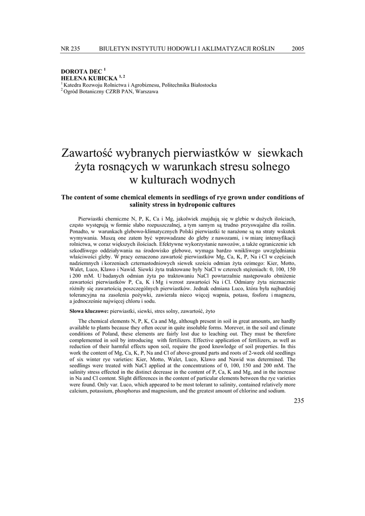 NR 235 BIULETYN INSTYTUTU HODOWLI I AKLIMATYZACJI ROŚLIN 2005 DOROTA DEC 1 HELENA KUBICKA 1, 2 1 2 Katedra Rozwoju Rolnictwa i Agrobiznesu, Politechnika Białostocka Ogród Botaniczny CZRB PAN, Warszawa Zawartość wybranych pierwiastków w siewkach żyta rosnących w warunkach stresu solnego w kulturach wodnych The content of some chemical elements in seedlings of rye grown under conditions of salinity stress in hydroponic cultures Pierwiastki chemiczne N, P, K, Ca i Mg, jakolwiek znajdują się w glebie w dużych ilościach, często występują w formie słabo rozpuszczalnej, a tym samym są trudno przyswajalne dla roślin. Ponadto, w warunkach glebowo-klimatycznych Polski pierwiastki te narażone są na straty wskutek wymywania. Muszą one zatem być wprowadzane do gleby z nawozami, i w miarę intensyfikacji rolnictwa, w coraz większych ilościach. Efektywne wykorzystanie nawozów, a także ograniczenie ich szkodliwego oddziaływania na środowisko glebowe, wymaga bardzo wnikliwego uwzględniania właściwości gleby. W pracy oznaczono zawartość pierwiastków Mg, Ca, K, P, Na i Cl w częściach nadziemnych i korzeniach czternastodniowych siewek sześciu odmian żyta ozimego: Kier, Motto, Walet, Luco, Klawo i Nawid. Siewki żyta traktowane były NaCl w czterech stężeniach: 0, 100, 150 i 200 mM. U badanych odmian żyta po traktowaniu NaCl powtarzalnie następowało obniżenie zawartości pierwiastków P, Ca, K i Mg i wzrost zawartości Na i Cl. Odmiany żyta nieznacznie różniły się zawartością poszczególnych pierwiastków. Jednak odmiana Luco, która była najbardziej tolerancyjna na zasolenia pożywki, zawierała nieco więcej wapnia, potasu, fosforu i magnezu, a jednocześnie najwięcej chloru i sodu. Słowa kluczowe: pierwiastki, siewki, stres solny, zawartość, żyto The chemical elements N, P, K, Ca and Mg, although present in soil in great amounts, are hardly available to plants because they often occur in quite insoluble forms. Morever, in the soil and climate conditions of Poland, these elements are fairly lost due to leaching out. They must be therefore complemented in soil by introducing with fertilizers. Effective application of fertilizers, as well as reduction of their harmful effects upon soil, require the good knowledge of soil properties. In this work the content of Mg, Ca, K, P, Na and Cl of above-ground parts and roots of 2-week old seedlings of six winter rye varieties: Kier, Motto, Walet, Luco, Klawo and Nawid was determined. The seedlings were treated with NaCl applied at the concentrations of 0, 100, 150 and 200 mM. The salinity stress effected in the distinct decrease in the content of P, Ca, K and Mg, and in the increase in Na and Cl content. Slight differences in the content of particular elements between the rye varieties were found. Only var. Luco, which appeared to be most tolerant to salinity, contained relatively more calcium, potassium, phosphorus and magnesium, and the greatest amount of chlorine and sodium. 235 Dorota Dec ... Key words: chemical elements, salinity stress, seedlings, winter rye WSTĘP Stężenie jonów w roztworze glebowym może wzrosnąć ponad normę w wyniku tzw. zjawiska podsiąkania, gdy uruchamiane są zasoby wody z głębszych warstw ziemi, co ma miejsce zwłaszcza w okresie przedłużającej się suszy (Sapek, 2003). Na wzrost zasolenia gleb wpływa również zmniejszenie ilości opadów. Powszechnie wiadomo, że zasolenia podłoża nie można wyeliminować całkowicie. Problem ten można rozwiązać, natomiast w następujący sposób: po pierwsze poprzez poszukiwanie roślin tolerancyjnych na działanie tego czynnika stresowego, a po drugie poprzez stosowanie związków chemicznych zwanych regulatorami wzrostu, które osłabiają działanie stresu solnego w roślinach (Kabata-Pendias i Pendias, 1999; Sadat Noori i McNeilly, 2000). Selekcja roślin tolerancyjnych na zasolenie prowadzona jest głównie w stadium kiełkowania nasion i młodych siewek. Uzasadnione jest to tym, że zdecydowana większość gatunków roślin jest najwrażliwsza na działanie stresu solnego w początkowej fazie wzrostu. Na przykład pszenica, sorgo, ryż i niektóre trawy (np. gatunek żyta Secale montanum) są mniej wrażliwe na zasolenie w fazie kiełkowania niż w stadium trzech liści (Noble, 1985). Natomiast inne gatunki roślin, takie jak: jęczmień i pomidor, wykazują zróżnicowaną reakcję na zasolenie w różnych fazach rozwojowych, dlatego pożądana jest ich ocena podczas całego cyklu rozwojowego. We wcześniejszych badaniach Dec i wsp. (2003) oraz Kubicka i Dec (2004) wykazały, że odmiany i linie wsobne żyta zróżnicowanie reagują na zasolenie podłoża. W związku z tym celowe było określenie zawartości pierwiastków w siewkach odmian żyta rosnących w warunkach stresu solnego. MATERIAŁ I METODY Doświadczenie przeprowadzono w kulturze hydroponicznej na pożywce Hoaglanda. Siewki żyta traktowano przez 14 dni chlorkiem sodu w czterech stężeniach (0, 100, 150 i 200 mM) w dwóch powtórzeniach, w pojemnikach o pojemności 1500 ml. W każdym pojemniku umieszczano po 30 siewek na siatkach pływających na powierzchni roztworów. Na 14 dniowych siewkach sześciu odmian (Kier, Motto, Walet, Luco, Klawo i Nawid) żyta ozimego oznaczono oddzielnie w części nadziemnej i korzeniach roślin następujące pierwiastki: Mg, Ca, K i Na w dwóch powtórzeniach za pomocą spektrofotometrii absorpcji atomowej przy użyciu aparatu 1000B, firmy Perkin Elmer. Natomiast P oznaczono metodą molibdenową a Cl przy pomocy elektrody jonoselektywnej. Uzyskane wyniki opracowano statystycznie. Wykonano trójczynnikową analizę wariancji w programie Stastistica, a istotności różnic weryfikowano testem Tukeya przy α = 0,05. WYNIKI Analizowano zawartość wybranych pierwiastków w korzeniach i częściach nadziemnych w sześciu odmianach żyta (Klawo, Luco, Nawid, Kier, Motto i Walet). 236 Dorota Dec ... Przeprowadzona trójczynnikowa