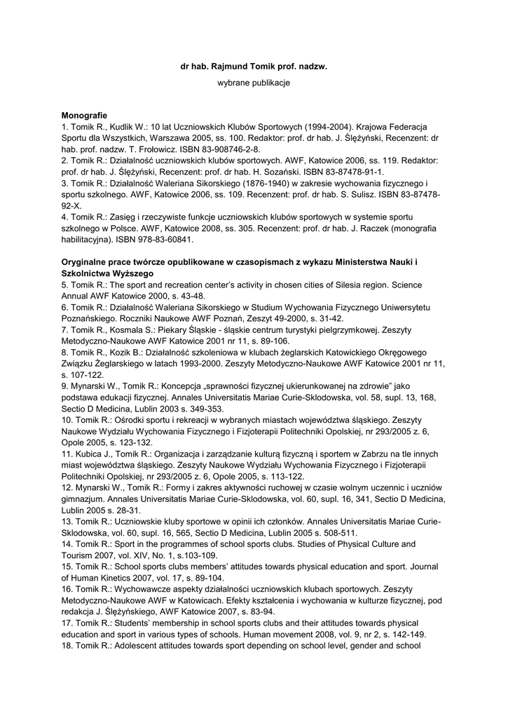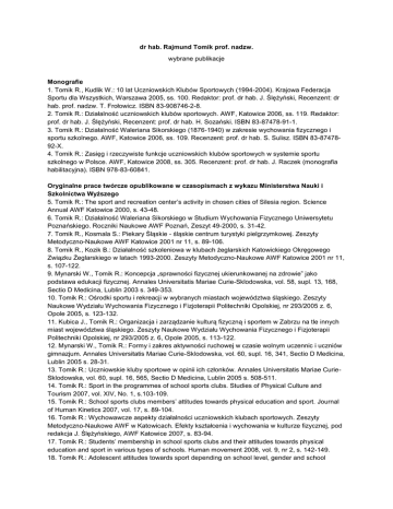 dr hab. Rajmund Tomik prof. nadzw. wybrane publikacje Monografie 1. Tomik R., Kudlik W.: 10 lat Uczniowskich Klubów Sportowych (1994-2004). Krajowa Federacja Sportu dla Wszystkich, Warszawa 2005, ss. 100. Redaktor: prof. dr hab. J. Ślężyński, Recenzent: dr hab. prof. nadzw. T. Frołowicz. ISBN 83-908746-2-8. 2. Tomik R.: Działalność uczniowskich klubów sportowych. AWF, Katowice 2006, ss. 119. Redaktor: prof. dr hab. J. Ślężyński, Recenzent: prof. dr hab. H. Sozański. ISBN 83-87478-91-1. 3. Tomik R.: Działalność Waleriana Sikorskiego (1876-1940) w zakresie wychowania fizycznego i sportu szkolnego. AWF, Katowice 2006, ss. 109. Recenzent: prof. dr hab. S. Sulisz. ISBN 83-8747892-X. 4. Tomik R.: Zasięg i rzeczywiste funkcje uczniowskich klubów sportowych w systemie sportu szkolnego w Polsce. AWF, Katowice 2008, ss. 305. Recenzent: prof. dr hab. J. Raczek (monografia habilitacyjna). ISBN 978-83-60841. Oryginalne prace twórcze opublikowane w czasopismach z wykazu Ministerstwa Nauki i Szkolnictwa Wyższego 5. Tomik R.: The sport and recreation center’s activity in chosen cities of Silesia region. Science Annual AWF Katowice 2000, s. 43-48. 6. Tomik R.: Działalność Waleriana Sikorskiego w Studium Wychowania Fizycznego Uniwersytetu Poznańskiego. Roczniki Naukowe AWF Poznań, Zeszyt 49-2000, s. 31-42. 7. Tomik R., Kosmala S.: Piekary Śląskie - śląskie centrum turystyki pielgrzymkowej. Zeszyty Metodyczno-Naukowe AWF Katowice 2001 nr 11, s. 89-106. 8. Tomik R., Kozik B.: Działalność szkoleniowa w klubach żeglarskich Katowickiego Okręgowego Związku Żeglarskiego w latach 1993-2000. Zeszyty Metodyczno-Naukowe AWF Katowice 2001 nr 11, s. 107-122. 9. Mynarski W., Tomik R.: Koncepcja „sprawności fizycznej ukierunkowanej na zdrowie” jako podstawa edukacji fizycznej. Annales Universitatis Mariae Curie-Sklodowska, vol. 58, supl. 13, 168, Sectio D Medicina, Lublin 2003 s. 349-353. 10. Tomik R.: Ośrodki sportu i rekreacji w wybranych miastach województwa śląskiego. Zeszyty Naukowe Wydziału Wychowania Fizycznego i Fizjoterapii Politechniki Opolskiej, nr 293/2005 z. 6, Opole 2005, s. 123-132. 11. Kubica J., Tomik R.: Organizacja i zarządzanie kulturą fizyczną i sportem w Zabrzu na tle innych miast województwa śląskiego. Zeszyty Naukowe Wydziału Wychowania Fizycznego i Fizjoterapii Politechniki Opolskiej, nr 293/2005 z. 6, Opole 2005, s. 113-122. 12. Mynarski W., Tomik R.: Formy i zakres aktywności ruchowej w czasie wolnym uczennic i uczniów gimnazjum. Annales Universitatis Mariae Curie-Sklodowska, vol. 60, supl. 16, 341, Sectio D Medicina, Lublin 2005 s. 28-31. 13. Tomik R.: Uczniowskie kluby sportowe w opinii ich członków. Annales Universitatis Mariae CurieSklodowska, vol. 60, supl. 16, 565, Sectio D Medicina, Lublin 2005 s. 508-511. 14. Tomik R.: Sport in the programmes of school sports clubs. Studies of Physical Culture and Tourism 2007, vol. XIV, No. 1, s.103-109. 15. Tomik R.: School sports clubs members’ attitudes towards physical education and sport. Journal of Human Kinetics 2007, vol. 17, s. 89-104. 16. Tomik R.: Wychowawcze aspekty działalności uczniowskich klubach sportowych. Zeszyty Metodyczno-Naukowe AWF w Katowicach. Efekty kształcenia i wychowania w kulturze fizycznej, pod redakcja J. Ślężyńskiego, AWF Katowice 2007, s. 83-94. 17. Tomik R.: Students’ membership in school sports clubs and their attitudes towards physical education and sport in various types of schools. Human movement 2008, vol. 9, nr 2, s. 142-149. 18. Tomik R.: Adolescent attitudes towards sport depending on school level, gender and school sports club membership. Journal of Human Kinetics 2008, vol. 20, s. 121-130. 19. Tomik R., Kudlik W.: The significance of school sports clubs for polpularization of sport as determined by a survey among activists of polish sports associations. Studies in Physical Culture and Tourism 2008, vol. XV, No. 3, s. 221-227. 20. Tomik R., Mynarski W.: School tourism and physical education in natural settings based on the principles and practices of outdoor education. Studies in Physical Culture and Tourism 2009, vol. XVI, No. 4, s. 421-430. 21. Tomik R.: Turystyka aktywna w kontakcie z przyrodą innowacyjnym produktem dla turystyki szkolnej. Acta Scientiarum Polonorum Oeconomia 9 (4) 2010, s. 567-576. 22. Hadzik A., Tomik R., Szromek A. R.: Characteristics of polish national football team fans as sports tourists. Studies in Physical Culture and Tourism 2011, vol. 18, No. 1, s. 51-58. Tomik R.: Zasięg i rodzaje pozalekcyjnych zajęć rekreacyjno-sportowych w polskich szkołach w świetle badań pilotażowych. Rozprawy Naukowe AWF we Wrocławiu, 35, Wrocław 2011, 175-179. 23. Tomik R. (red.): Rola Miejskiego Ośrodka Sportu i Rekreacji w Piekarach Śląskich w rozwoju kultury fizycznej i turystyki mieszkańców. Prasa i Książka, Katowice 2009, ss. 87, ISBN 978-83926442-3-1. 24. Tomik R., Fryc A. (red.): Z dziejów kultury fizycznej i turystyki w Piekarach Śląskich. AWF, Katowice 2009, ss. 176, ISBN 978-83-87478-41-9. 25. Tomik R., Pośpiech D.: Sport szkolny w wybranych krajach Europy. AWF, Katowice 2010, ss. 123, Recenzent: dr hab. prof. ndzw. T. Frołowicz, ISBN 978-83-60841-48-8.