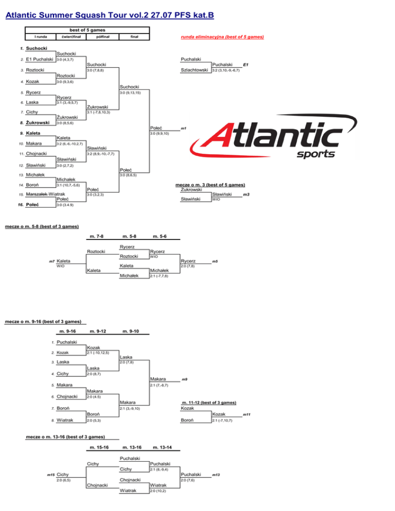 Atlantic Summer Squash Tour vol.2 27.07 PFS kat.B best of 5 games ćwierćfinał I runda półfinał runda eliminacyjna (best of 5 games) finał 1. Suchocki Suchocki 2. E1 Puchalski Puchalski 3:0 (4,3,7) Suchocki 3. Roztocki 4. Kozak 5. Rycerz 6. Laska 7. Cichy Puchalski Szlachtowski 3:0 (7,8,8) E1 3:2 (3,10,-9,-6,7) Roztocki 3:0 (9,3,6) Suchocki 3:0 (9,13,15) Rycerz 3:1 (3,-9,5,7) Żukrowski 3:1 (-7,8,10,3) Żukrowski 8. Żukrowski 3:0 (8,5,6) Połeć 9. Kaleta m1 3:0 (9,9,10) Kaleta 10. Makara 11. Chojnacki 3:2 (6,-6,-10,2,7) Sławiński 3:2 (8,9,-10,-7,7) Sławiński 12. Sławiński 13. Michałek 14. Boroń 3:0 (2,7,2) Połeć 3:0 (8,6,5) Michałek mecze o m. 3 (best of 5 games) Żukrowski Sławiński m3 Sławiński WIO 3:1 (10,7,-5,6) Połeć Marszałek Wiatrak Połeć 16. Połeć 3:0 (3.4.9) 15. 3:0 (3,2,3) mecze o m. 5-8 (best of 3 games) m. 7-8 m. 5-8 m. 5-6 Rycerz Roztocki Rycerz Roztocki m7 WIO Kaleta Rycerz Kaleta WIO Kaleta m5 2:0 (7,8) Michałek Michałek 2:1 (-7,7,8) mecze o m. 9-16 (best of 3 games) m. 9-16 1. m. 9-12 m. 9-10 Puchalski Kozak 2. Kozak 2:1 (-10,12,5) Laska 3. Laska 4. Cichy 2:0 (7,8) Laska 2:0 (8,7) Makara 5. Makara m9 2:1 (7,-8,7) Makara 6. Chojnacki 7. Boroń 8. Wiatrak 2:0 (4.5) Makara m. 11-12 (best of 3 games) Kozak 2:1 (3,-9,10) Boroń Kozak 2:0 (5,3) Boroń 2:1 (-7,10,7) Puchalski m13 mecze o m. 13-16 (best of 3 games) m. 15-16 m. 13-16 m. 13-14 Puchalski Cichy Puchalski Cichy m15 2:1 (8,-9,4) Cichy Chojnacki 2:0 (6,5) Chojnacki 2:0 (7,6) Wiatrak Wiatrak 2:0 (10,2) m11