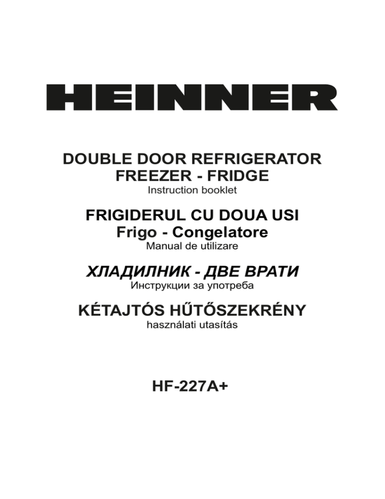 DOUBLE DOOR REFRIGERATOR FREEZER - FRIDGE Instruction booklet FRIGIDERUL CU DOUA USI Frigo - Congelatore Manual de utilizare ХЛАДИЛНИК - ДВЕ ВРАТИ Инструкции за употреба KÉTAJTÓS HŰTŐSZEKRÉNY használati utasítás HF-227A+ Index BEFORE USING THE APPLIANCE ........................................................ 2 General warnings ........................................................................................... Old and out-of-order fridges ............................................................................ Safety warnings ............................................................................................. Installing and operating your fridge ................................................................. Before Using your Fridge ................................................................................ 2 4 4 5 5 THE VARIOUS FUNCTION AND POSSIBILITIES .................................. 6 Thermostat Setting ........................................................................................ 6 Warnings for Temperature Settings ................................................................. 6 Accessories .................................................................................................. 7 Ice tray ........................................................................................................................... 7 ARRANGING FOOD IN THE APPLIANCE .............................................. 7 Refrigerator Compartment .............................................................................. 7 Freezer Compartment .................................................................................... 7 CLEANING AND MAINTENANCE ........................................................... 9 Defrosting ..................................................................................................... 10 Replacing The Light Bulb .............................................................................. 11 SHIPMENT AND REPOSITIONING ...................................................... 11 Repositioning the door .................................................................................. 11 BEFORE CALLING YOUR AFTER SALES SERVICE .......................... 12 Tips For Saving Energy ................................................................................. 13 THE PARTS OF THE APPLIANCE AND THE COMPARTMENTS ....... 14 EN - 1 - PART - 1. BEFORE USING THE APPLIANCE General warnings WARNING: Keep ventilation openings, in the appliance enclosure or in the built-in structure, clear of obstruction. WARNING: Do not use mechanical devices or other means to accelerate the defrosting process, other than those recommended by the manufacturer. WARNING: Do not use electrical appliances inside the food storage compartments of the appliance, unless they are of the type recommended by the manufacturer. WARNING: Do not damage the refrigerant circuit. WARNING: To avoid a hazard due to the instability of the appliance, it must be fixed in accordance with the instructions. • If your appliance uses R600a as a refrigerant – you can learn this information from the label on the cooler- you should be careful during shipment and installation to prevent your appliance’s cooler elements from being damaged. Although R600a is an environmentally friendly and natural gas. As it is explosive, in the event of a leak due to damage to the cooler elements, move your fridge from open flame or heat sources and ventilate the room where the appliance is located for a few minutes. • While carrying and positioning the fridge, do not damage the cooler gas circuit. • Do not store explosive substances such as aerosol cans with a flammable propellant in this appliance. • This appliance is intended to be used in household and similar applications such as; - staff kitchen areas in shops, offices and other working environments - farm houses and by clients in hotels, motels and other residential type environments EN - 2 - - bed and breakfast type environments; - catering and similar non-retail applications • If the socket does not match the refrigerator plug, it must be replaced by the manufacturer, its service agent or similarly qualified persons in order to avoid a hazard. • A specially grounded plug has been connected to the power cable of your refrigerator. This plug should be used with a specially grounded socket of 16 amperes. If there is no such socket in your house, please have it installed by an authorized electrician. • This appliance can be used by children aged from 8 years and above and persons with reduced physical, sensory or mental capabilities or lack of experience and knowledge if they have been given supervision or instruction concerning use of the appliance in a safe way and understand the hazard involved. Children shall not play with the appliance. Cleaning and user maintenance, shall not be made by children without supervision. • If the supply cord is damaged, it must be replaced by the manufacturer, its service agent or similar qualified persons in order to avoid a hazard. EN - 3 - Old and out-of-order fridges • If your old fridge has a lock, break or remove the lock before discarding it, because children may get trapped inside it and may cause an accident. • Old fridges and freezers contain isolation material and refrigerant with CFC. Therefore, take care not to harm environment when you are discarding your old fridges. Please ask your municipal authority about the disposal of the WEEE for the reuse, recycle and recovery purposes. Notes: • Please read the instruction manual carefully before installing and using your appliance. We are not responsible for the damage occurred due to misuse. • Follow all instructions on your appliance and instruction manual, and keep this manual in a safe place to resolve the problems that may occur in the future. • This appliance is produced t