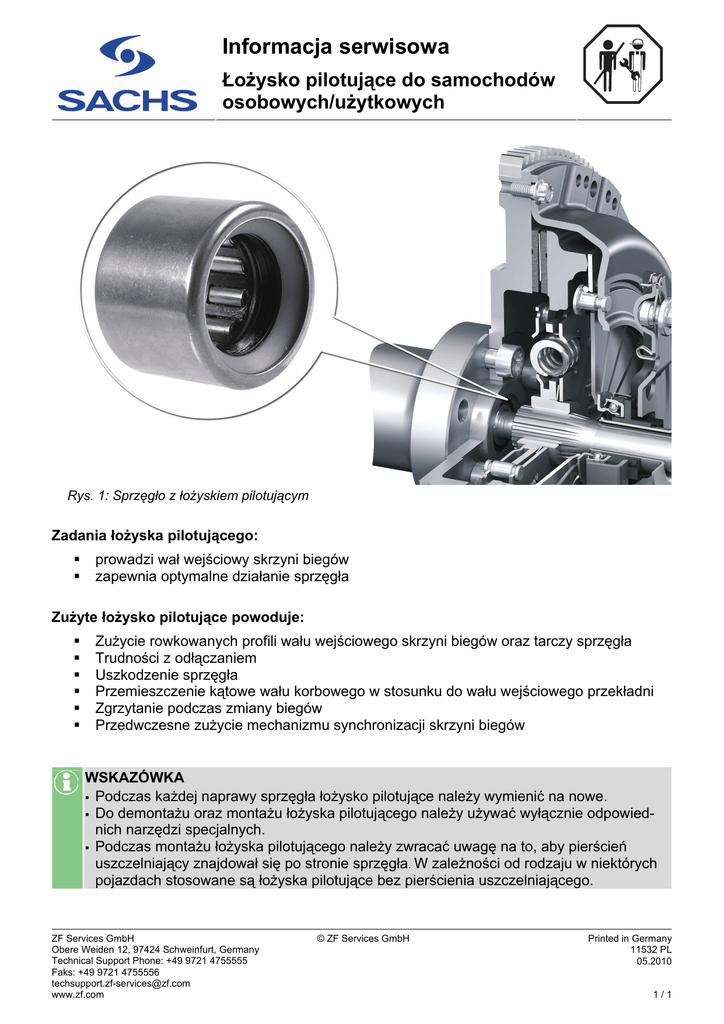 Informacja serwisowa Łożysko pilotujące do samochodów osobowych/użytkowych Rys. 1: Sprzęgło z łożyskiem pilotującym Zadania łożyska pilotującego: prowadzi wał wejściowy skrzyni biegów zapewnia optymalne działanie sprzęgła Zużyte łożysko pilotujące powoduje: Zużycie rowkowanych profili wału wejściowego skrzyni biegów oraz tarczy sprzęgła Trudności z odłączaniem Uszkodzenie sprzęgła Przemieszczenie kątowe wału korbowego w stosunku do wału wejściowego przekładni Zgrzytanie podczas zmiany biegów Przedwczesne zużycie mechanizmu synchronizacji skrzyni biegów WSKAZÓWKA Podczas każdej naprawy sprzęgła łożysko pilotujące należy wymienić na nowe. Do demontażu oraz montażu łożyska pilotującego należy używać wyłącznie odpowiednich narzędzi specjalnych. Podczas montażu łożyska pilotującego należy zwracać uwagę na to, aby pierścień uszczelniający znajdował się po stronie sprzęgła. W zależności od rodzaju w niektórych pojazdach stosowane są łożyska pilotujące bez pierścienia uszczelniającego. ZF Services GmbH Obere Weiden 12, 97424 Schweinfurt, Germany Technical Support Phone: +49 9721 4755555 Faks: +49 9721 4755556 [email protected] www.zf.com © ZF Services GmbH Printed in Germany 11532 PL 05.2010 1/1