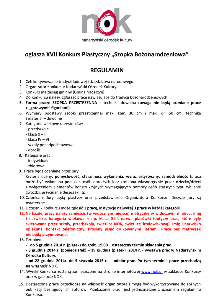 ogłasza XVII Konkurs Plastyczny „Szopka Bożonarodzeniowa” REGULAMIN 1. 2. 3. 4. 5. Cel: kultywowanie tradycji ludowej i dziedzictwa narodowego. Organizator Konkursu: Nadarzyński Ośrodek Kultury. Konkurs ma zasięg gminny (Gmina Nadarzyn). Do Konkursu należy zgłaszać prace nawiązujące do tradycji bożonarodzeniowych. Forma pracy: SZOPKA PRZESTRZENNA – technika dowolna (uwaga nie będą oceniane prace z „gotowymi” figurkami) 6. Wymiary podstawy szopki przestrzennej max. szer. 30 cm i max. dł. 50 cm, technika i materiał – dowolne 7. Kategorie wiekowe uczestników: - przedszkole - klasa 0 – III - klasa IV – VI - szkoły ponadpodstawowe - dorośli 8. Kategorie prac: - indywidualna - zbiorowa 9. Prace będą oceniane przez jury. Kryteria oceny: pomysłowość, staranność wykonania, wyraz artystyczny, samodzielność (praca może być wykonana pod kier. osób dorosłych lecz zrobiona własnoręcznie przez dziecko/dzieci z wyłączeniem elementów konstrukcyjnych wymagających pomocy osób starszych typu wbijanie gwoździ, przycinanie deseczek, itp.) 10. Członkami Jury będą plastycy oraz przedstawiciele Organizatora Konkursu. Decyzje jury są ostateczne. 11. Uczestnik Konkursu może zgłosić 1 pracę, instytucje najwyżej 3 prace w każdej kategorii. 12. Na każdej pracy należy zamieścić (w widocznym miejscu) metryczkę w widocznym miejscu: imię i nazwisko, kategoria wiekowa – np. klasa 0-III, nazwa placówki (dotyczy prac, które były skierowane przez szkoły, przedszkola, świetlice NOK, świetlicę środowiskową), imię i nazwisko opiekuna, kontakt telefoniczny. Prosimy pisać drukowanymi literami. Prace bez metryczek nie będą przyjmowane. 13. Terminy: - do 5 grudnia 2014 r. (piątek) do godz. 19.00 – ostateczny termin składania prac. - 8 grudnia 2014 r. (poniedziałek) – 19 grudnia (piątek) 2014 r. - wystawa prac w Nadarzyńskim Ośrodku Kultury. - od 22 grudnia 2014r. do 5 stycznia 2015 r. - odbiór prac. Po tym terminie prace przechodzą na własność NOK. 14. Wyniki Konkursu zostaną zamieszczone na stronie internetowej www.nok.pl w zakładce Konkursy oraz w gablocie NOK. 15. Dostarczone prace przechodzą na własność organizatora i mogą być wykorzystywane do różnych publikacji bez zgody ich autorów. Przekazanie prac jest jednoznaczne z uznaniem regulaminu Konkursu.