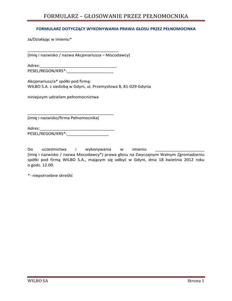 FORMULARZ – GŁOSOWANIE PRZEZ PEŁNOMOCNIKA FORMULARZ DOTYCZĄCY WYKONYWANIA PRAWA GŁOSU PRZEZ PEŁNOMOCINKA Ja/Działając w imieniu* _______________________________________ (Imię i nazwisko / nazwa Akcjonariusza – Mocodawcy) Adres:_________________________________ PESEL/REGON/KRS*:____________________ Akcjonariusz/a* spółki pod firmą: WILBO S.A. z siedzibą w Gdyni, ul. Przemysłowa 8, 81-029 Gdynia niniejszym udzielam pełnomocnictwa _____________________________________ (imię i nazwisko/firma Pełnomocnika) Adres:________________________________ PESEL/REGON/KRS*:__________________ Do uczestnictwa i wykonywania w imieniu _____________________ (imię i nazwisko / nazwa Mocodawcy*) prawa głosu na Zwyczajnym Walnym Zgromadzeniu spółki pod firmą WILBO S.A., mającym się odbyć w Gdyni, dnia 18 kwietnia 2012 roku o godz. 12.00. *- niepotrzebne skreślić WILBO SA Strona 1 FORMULARZ – GŁOSOWANIE PRZEZ PEŁNOMOCNIKA Za UCHWAŁA NR 1 ZWZA WILBO S.A. w sprawie wyboru Przewodniczącego Walnego Zgromadzenia Przeciw Wstrzymuję się Zgłoszenie sprzeciwu Liczba akcji:_____________ Liczba akcji:_____________ Liczba akcji:_____________ Inne (np. instrukcje Mocodawcy, sposób głosowania – za/przeciw/wstrzymuje się od głosu): Za UCHWAŁA NR 2 ZWZA WILBO S.A. w sprawie wyboru Komisji Skrutacyjnej Przeciw Wstrzymuję się Zgłoszenie sprzeciwu Liczba akcji:_____________ Liczba akcji:_____________ Liczba akcji:_____________ Inne (np. instrukcje Mocodawcy, sposób głosowania – za/przeciw/wstrzymuje się od głosu): Za UCHWAŁA NR 3 ZWZA WILBO S.A. w sprawie przyjęcia porządku obrad Przeciw Wstrzymuję się Zgłoszenie sprzeciwu Liczba akcji:_____________ Liczba akcji:_____________ Liczba akcji:_____________ Inne (np. instrukcje Mocodawcy, sposób głosowania – za/przeciw/wstrzymuje się od głosu): Za UCHWAŁA NR 4 ZWZA WILBO S.A. w sprawie zatwierdzenia sprawozdania finansowego WILBO S.A. za rok 2011 Przeciw Wstrzymuję się Zgłoszenie sprzeciwu Liczba akcji:_____________ Liczba akcji:_____________ Liczba akcji:_____________ Inne (np. instrukcje Mocodawcy, sposób głosowania – za/przeciw/wstrzymuje się od głosu): WILBO SA Strona 2 FORMULARZ – GŁOSOWANIE PRZEZ PEŁNOMOCNIKA UCHWAŁA NR 5 ZWZA WILBO S.A w sprawie zatwierdzenia sprawozdania Zarządu z działalności Spółki Wilbo SA za 2011 rok Za Przeciw Wstrzymuję się Zgłoszenie sprzeciwu Liczba akcji:_____________ Liczba akcji:_____________ Liczba akcji:_____________ Inne (np. instrukcje Mocodawcy, sposób głosowania – za/przeciw/wstrzymuje się od głosu): UCHWAŁA NR 6 ZWZA WILBO S.A. w sprawie udzielenia Panu Andrzejowi Luniak – Prezesowi Zarządu absolutorium z wykonywania obowiązków w roku 2011 Za Przeciw Wstrzymuję się Zgłoszenie sprzeciwu Liczba akcji:_____________ Liczba akcji:_____________ Liczba akcji:_____________ Inne (np. instrukcje Mocodawcy, sposób głosowania – za/przeciw/wstrzymuje się od głosu): UCHWAŁA NR 7 ZWZA WILBO S.A. w sprawie udzielenia Panu Piotrowi Kapinos – Wiceprezesowi Zarządu absolutorium z wykonywania obowiązków w roku 2011 Za Przeciw Wstrzymuję się Zgłoszenie sprzeciwu Liczba akcji:_____________ Liczba akcji:_____________ Liczba akcji:_____________ Inne (np. instrukcje Mocodawcy, sposób głosowania – za/przeciw/wstrzymuje się od głosu): UCHWAŁA NR 8 ZWZA WILBO S.A. w sprawie udzielenia Panu Grzegorzowi Nonna – Wiceprezesowi Zarządu absolutorium z wykonywania obowiązków w roku 2011 Za Przeciw Wstrzymuję się Zgłoszenie sprzeciwu WILBO SA Strona 3 FORMULARZ – GŁOSOWANIE PRZEZ PEŁNOMOCNIKA Liczba akcji:_____________ Liczba akcji:_____________ Liczba akcji:_____________ Inne (np. instrukcje Mocodawcy, sposób głosowania – za/przeciw/wstrzymuje się od głosu): UCHWAŁA NR 9 ZWZA WILBO S.A. w sprawie udzielenia Panu Tomaszowi Konewka – Prezesowi Zarządu absolutorium z wykonywania obowiązków w roku 2011 Za Przeciw Wstrzymuję się Zgłoszenie sprzeciwu Liczba akcji:_____________ Liczba akcji:_____________ Liczba akcji:_____________ UCHWAŁA NR 10 ZWZA WILBO S.A. w sprawie udzielenia Panu Jackowi Wilandt – Wiceprezesowi Zarządu absolutorium z wykonywania obowiązków w roku 2011 Za Przeciw Wstrzymuję się Zgłoszenie sprzeciwu Liczba akcji:_____________ Za Liczba akcji:_____________ Liczba akcji:_____________ UCHWAŁA NR 11 ZWZA WILBO S.A. w sprawie zatwierdzenia sprawozdania z działalności Rady Nadzorczej Wilbo SA w roku 2011 Przeciw Wstrzymuję się Zgłoszenie sprzeciwu Liczba akcji:_____________ Liczba akcji:_____________ Liczba akcji:_____________ Inne (np. instrukcje Mocodawcy, sposób głosowania – za/przeciw/wstrzymuje się od głosu): UCHWAŁA NR 12 ZWZA WILBO S.A. w sprawie udzielenia Panu Andrzejowi Zwara Przewodniczącemu Rady Nadzorczej absolutorium z wykonywania obowiązków w roku 2011 Za Przeciw Wstrzymuję się Zgłoszenie sprzeciwu Liczba akcji:_____________ Liczba akcji:_____________ Liczba akcji:_____________ Inne (np. instrukcje Mocodawcy, sposób głosowania – za/przeciw/wstrzymuje się od głosu): WILBO SA Strona 4 FORMULARZ – GŁOSOWANIE PRZEZ PEŁNOMOCNIKA UCHWAŁA NR 13 ZWZA WILBO S.A. w sprawie udzielenia Panu Stanisławowi Wójtowicz Wiceprzewodniczącemu Rady Nadzorczej absolutorium z wykonywania obowiązków w roku 2011 Za Przeciw Wstrzymuję się Zgłoszenie sprzeciwu Liczba akcji:_____________ Liczba akcji:_____________ Liczba akcji:_____________ Inne (np. instrukcje Mocodawcy, sposób głosowania – za/przeciw/wstrzymuje się od głosu): UCHWAŁA NR 14 ZWZA WILBO S.A. w sprawie udzielenia Pani Barbarze Kreft Członkowi Rady Nadzorczej absolutorium z wykonywania obowiązków w roku 2011 Za Przeciw Wstrzymuję się Zgłoszenie sprzeciwu Liczba akcji:_____________ Liczba akcji:_____________ Liczba akcji:_____________ Inne (np. instrukcje Mocodawcy, sposób głosowania – za/przeciw/wstrzymuje się od głosu): UCHWAŁA NR 15 ZWZA WILBO S.A. w sprawie udzielenia Pani Jerzemu Nacel Członkowi Rad