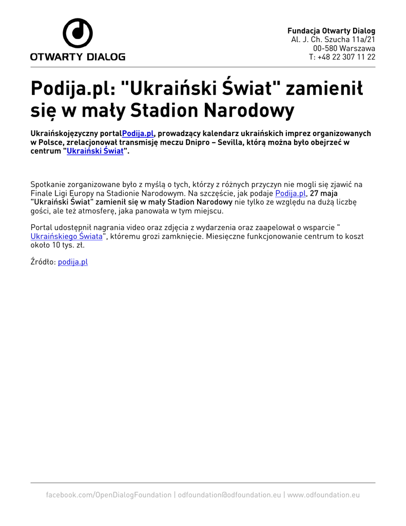 Fundacja Otwarty Dialog Al. J. Ch. Szucha 11a/21 00-580 Warszawa T: +48 22 307 11 22 Podija.pl: "Ukraiński Świat" zamienił się w mały Stadion Narodowy Ukraińskojęzyczny portalPodija.pl, prowadzący kalendarz ukraińskich imprez organizowanych w Polsce, zrelacjonował transmisję meczu Dnipro – Sevilla, którą można było obejrzeć w centrum "Ukraiński Świat". Spotkanie zorganizowane było z myślą o tych, którzy z różnych przyczyn nie mogli się zjawić na Finale Ligi Europy na Stadionie Narodowym. Na szczęście, jak podaje Podija.pl, 27 maja "Ukraiński Świat" zamienił się w mały Stadion Narodowy nie tylko ze względu na dużą liczbę gości, ale też atmosferę, jaka panowała w tym miejscu. Portal udostępnił nagrania video oraz zdjęcia z wydarzenia oraz zaapelował o wsparcie " Ukraińskiego Świata", któremu grozi zamknięcie. Miesięczne funkcjonowanie centrum to koszt około 10 tys. zł. Źródło: podija.pl facebook.com/OpenDialogFoundation | [email protected] | www.odfoundation.eu