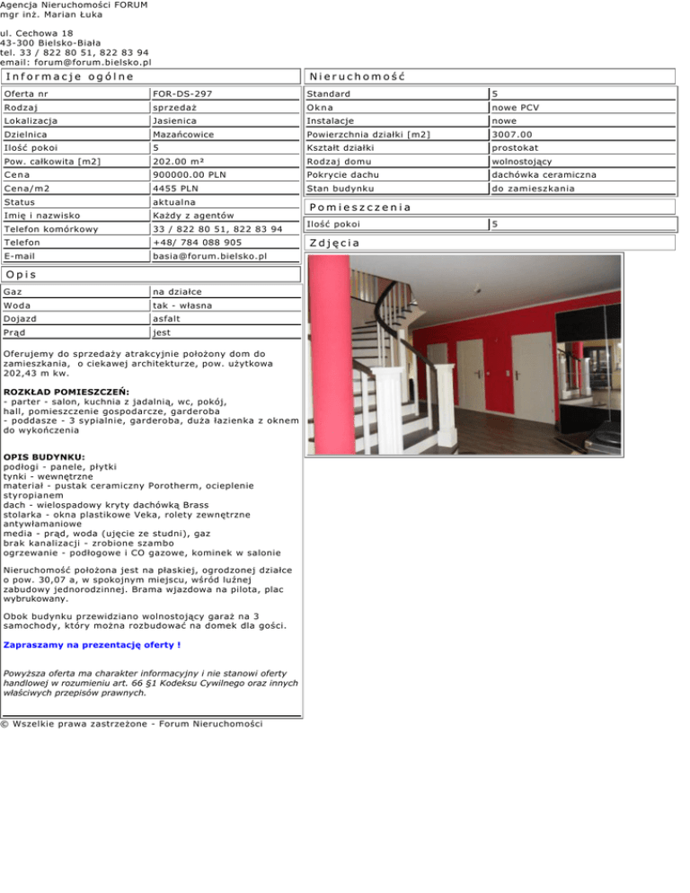 Agencja Nieruchomości FORUM mgr inż. Marian Łuka ul. Cechowa 18 43-300 Bielsko-Biała tel. 33 / 822 80 51, 822 83 94 email: [email protected] Informacje ogólne Nieruchomość Oferta nr FOR-DS-297 Standard 5 Rodzaj sprzedaż Okna nowe PCV Lokalizacja Jasienica Instalacje nowe Dzielnica Mazańcowice Powierzchnia działki [m2] 3007.00 Ilość pokoi 5 Kształt działki prostokat Pow. całkowita [m2] 202.00 m² Rodzaj domu wolnostojący Cena 900000.00 PLN Pokrycie dachu dachówka ceramiczna Cena/m2 4455 PLN Stan budynku do zamieszkania Status aktualna Imię i nazwisko Każdy z agentów Telefon komórkowy 33 / 822 80 51, 822 83 94 Telefon +48/ 784 088 905 E-mail [email protected] Opis Gaz na działce Woda tak - własna Dojazd asfalt Prąd jest Oferujemy do sprzedaży atrakcyjnie położony dom do zamieszkania, o ciekawej architekturze, pow. użytkowa 202,43 m kw. ROZKŁAD POMIESZCZEŃ: - parter - salon, kuchnia z jadalnią, wc, pokój, hall, pomieszczenie gospodarcze, garderoba - poddasze - 3 sypialnie, garderoba, duża łazienka z oknem do wykończenia OPIS BUDYNKU: podłogi - panele, płytki tynki - wewnętrzne materiał - pustak ceramiczny Porotherm, ocieplenie styropianem dach - wielospadowy kryty dachówką Brass stolarka - okna plastikowe Veka, rolety zewnętrzne antywłamaniowe media - prąd, woda (ujęcie ze studni), gaz brak kanalizacji - zrobione szambo ogrzewanie - podłogowe i CO gazowe, kominek w salonie Nieruchomość położona jest na płaskiej, ogrodzonej działce o pow. 30,07 a, w spokojnym miejscu, wśród luźnej zabudowy jednorodzinnej. Brama wjazdowa na pilota, plac wybrukowany. Obok budynku przewidziano wolnostojący garaż na 3 samochody, który można rozbudować na domek dla gości. Zapraszamy na prezentację oferty ! Powyższa oferta ma charakter informacyjny i nie stanowi oferty handlowej w rozumieniu art. 66 §1 Kodeksu Cywilnego oraz innych właściwych przepisów prawnych. © Wszelkie prawa zastrzeżone - Forum Nieruchomości Pomieszczenia Ilość pokoi Zdjęcia 5