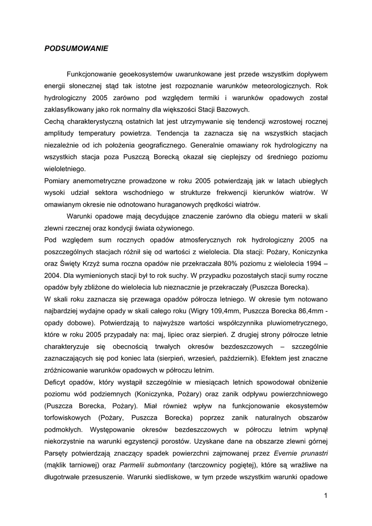 PODSUMOWANIE Funkcjonowanie geoekosystemów uwarunkowane jest przede wszystkim dopływem energii słonecznej stąd tak istotne jest rozpoznanie warunków meteorologicznych. Rok hydrologiczny 2005 zarówno pod względem termiki i warunków opadowych został zaklasyfikowany jako rok normalny dla większości Stacji Bazowych. Cechą charakterystyczną ostatnich lat jest utrzymywanie się tendencji wzrostowej rocznej amplitudy temperatury powietrza. Tendencja ta zaznacza się na wszystkich stacjach niezależnie od ich położenia geograficznego. Generalnie omawiany rok hydrologiczny na wszystkich stacja poza Puszczą Borecką okazał się cieplejszy od średniego poziomu wieloletniego. Pomiary anemometryczne prowadzone w roku 2005 potwierdzają jak w latach ubiegłych wysoki udział sektora wschodniego w strukturze frekwencji kierunków wiatrów. W omawianym okresie nie odnotowano huraganowych prędkości wiatrów. Warunki opadowe mają decydujące znaczenie zarówno dla obiegu materii w skali zlewni rzecznej oraz kondycji świata ożywionego. Pod względem sum rocznych opadów atmosferycznych rok hydrologiczny 2005 na poszczególnych stacjach różnił się od wartości z wielolecia. Dla stacji: Pożary, Koniczynka oraz Święty Krzyż suma roczna opadów nie przekraczała 80% poziomu z wielolecia 1994 – 2004. Dla wymienionych stacji był to rok suchy. W przypadku pozostałych stacji sumy roczne opadów były zbliżone do wielolecia lub nieznacznie je przekraczały (Puszcza Borecka). W skali roku zaznacza się przewaga opadów półrocza letniego. W okresie tym notowano najbardziej wydajne opady w skali całego roku (Wigry 109,4mm, Puszcza Borecka 86,4mm opady dobowe). Potwierdzają to najwyższe wartości współczynnika pluwiometrycznego, które w roku 2005 przypadały na: maj, lipiec oraz sierpień. Z drugiej strony półrocze letnie charakteryzuje się obecnością trwałych okresów bezdeszczowych – szczególnie zaznaczających się pod koniec lata (sierpień, wrzesień, październik). Efektem jest znaczne zróżnicowanie warunków opadowych w półroczu letnim. Deficyt opadów, który wystąpił szczególnie w miesiącach letnich spowodował obniżenie poziomu wód podziemnych (Koniczynka, Pożary) oraz zanik odpływu powierzchniowego (Puszcza Borecka, Pożary). Miał również wpływ na funkcjonowanie ekosystemów torfowiskowych podmokłych. (Pożary, Puszcza Występowanie Borecka) okresów poprzez bezdeszczowych zanik w naturalnych półroczu letnim obszarów wpłynął niekorzystnie na warunki egzystencji porostów. Uzyskane dane na obszarze zlewni górnej Parsęty potwierdzają znaczący spadek powierzchni zajmowanej przez Evernie prunastri (mąklik tarniowej) oraz Parmelii submontany (tarczownicy pogiętej), które są wrażliwe na długotrwałe przesuszenie. Warunki siedliskowe, w tym przede wszystkim warunki opadowe 1 są zasadniczym czynnikiem, który wpływa na kondycję flory porostów występującej na obszarze monitorowanych zlewni. Zanieczyszczenie powietrza, przy zaznaczających się w ostatnich latach stabilizacji stężeń związków siarki i azotu, jest czynnikiem drugorzędnym, który ma mniejszą wagę dla egzystencji porostów. Dla wartości odpływu powierzchniowego z monitorowanych zlewni rzecznych w roku hydrologicznym zasadnicze znaczenie miała korelacja czasowa zanikania pokrywy śnieżnej i wysokie sumy opadów atmosferycznych na przełomie zimy i wiosny. Wysokie sumy opadów atmosferycznych w okresie miesięcy letnich nie zostały odzwierciedlone w poziomie odpływu powierzchniowego. Przyczyną były wysokie wartości ewapotranspiracji i odbudowa zasobów wodnych zlewni po okresach bezdeszczowych. Analogicznie jak w latach ubiegłych zaznacza się dysharmonia czasowa pomiędzy maksimum opadowym przypadającym na półrocze letnie a maksymalnym odpływem powierzchniowym, który występuje na przełomie zimy i wiosny. Do podstawowych czynników które decydują o obiegu materii w geoekosystemie należy zaliczyć ilość i jakość depozycji atmosferycznej. Powietrze jest jednym z elementów środowiska przyrodniczego, które podlega silnej antropopresji. Zawarte w nim związki chemiczne wskutek opadania i osadzania są wchłaniane i akumulowane przez pozostałe komponenty środowiska. Zestawienie wartości poziomu zanieczyszczeń powietrza w latach 2004 i 2005 w oparciu o wykorzystanie metody pasywnej nie wskazuję na obecność wyraźnych trendów. W przypadku dwutlenku siarki poza stacją w Koniczynce na pozostałych stacjach poziom stężeń tego gazu w powietrzu atmosferycznym zmalał. W przypadku dwutlenku azotu na wszystkich stacjach odnotowano spadek zanieczyszczenia powietrza tym związkiem. Spadek stężeń dwutlenku siarki w powietrzu koresponduje z obniżeniem zawartości siarki w plech porostów zarówno w okazach naturalnie występujących w danym środowisku (stacja Wigry) oraz plechach transplantowanych (Szymbark, Święty Krzyż). Maksymalne stężenia dwutlenku siarki i azotu w powietrzu obserwowano w chłodnej porze roku co należy wiązać z emisją tych związków w rezultacie spalania paliw kopalnych. Zdecydowanie niższe stężenia analizowanych zanieczyszczeń gazowych powietrza obserwowano w ciepłej porze roku. Wysokie stężenia dwutlenku siarki w powietrzu w okresie chłodnym potwierdza wyższy poziom siarki w plechach transplantowanych porostów eksponowanych w miesiącach zimowych w porównaniu do ekspozycji letniej. Skład chemiczny opadów atmosferycznych kształtowany jest przez wiele czynników do których należy zaliczyć obok zanieczyszczeń obecnych w atmosferze także warunki meteorologiczne w tym przede wszystkim typ cyrkulacji powietrza, wysokość opadów atmosferycznych, długość i czas występowania okresów bezdeszczowych. Rok hydrologiczny 2005 pod względem warunków meteorologicznych generalnie należał do lat 2 przeciętnych. Wyznacznikiem warunków pogodowych analizowanego okresu było zróżnicowanie se