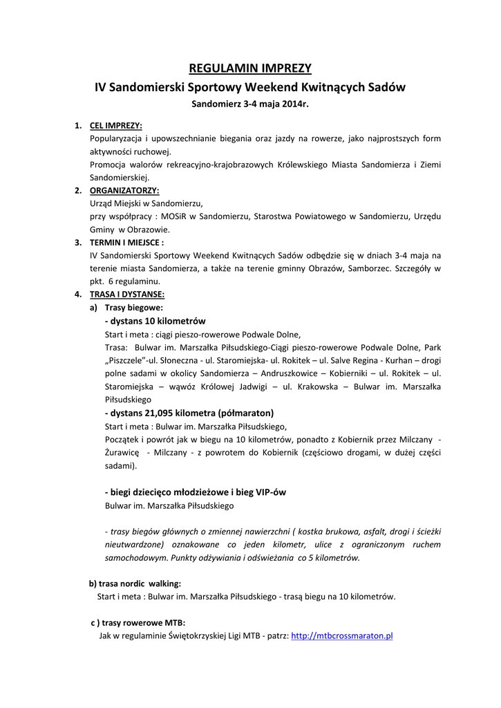 REGULAMIN IMPREZY IV Sandomierski Sportowy Weekend Kwitnących Sadów Sandomierz 3-4 maja 2014r. 1. CEL IMPREZY: Popularyzacja i upowszechnianie biegania oraz jazdy na rowerze, jako najprostszych form aktywności ruchowej. Promocja walorów rekreacyjno-krajobrazowych Królewskiego Miasta Sandomierza i Ziemi Sandomierskiej. 2. ORGANIZATORZY: Urząd Miejski w Sandomierzu, przy współpracy : MOSiR w Sandomierzu, Starostwa Powiatowego w Sandomierzu, Urzędu Gminy w Obrazowie. 3. TERMIN I MIEJSCE : IV Sandomierski Sportowy Weekend Kwitnących Sadów odbędzie się w dniach 3-4 maja na terenie miasta Sandomierza, a także na terenie gminny Obrazów, Samborzec. Szczegóły w pkt. 6 regulaminu. 4. TRASA I DYSTANSE: a) Trasy biegowe: - dystans 10 kilometrów Start i meta : ciągi pieszo-rowerowe Podwale Dolne, Trasa: Bulwar im. Marszałka Piłsudskiego-Ciągi pieszo-rowerowe Podwale Dolne, Park „Piszczele”-ul. Słoneczna - ul. Staromiejska- ul. Rokitek – ul. Salve Regina - Kurhan – drogi polne sadami w okolicy Sandomierza – Andruszkowice – Kobierniki – ul. Rokitek – ul. Staromiejska – wąwóz Królowej Jadwigi – ul. Krakowska – Bulwar im. Marszałka Piłsudskiego - dystans 21,095 kilometra (półmaraton) Start i meta : Bulwar im. Marszałka Piłsudskiego, Początek i powrót jak w biegu na 10 kilometrów, ponadto z Kobiernik przez Milczany Żurawicę - Milczany - z powrotem do Kobiernik (częściowo drogami, w dużej części sadami). - biegi dziecięco młodzieżowe i bieg VIP-ów Bulwar im. Marszałka Piłsudskiego - trasy biegów głównych o zmiennej nawierzchni ( kostka brukowa, asfalt, drogi i ścieżki nieutwardzone) oznakowane co jeden kilometr, ulice z ograniczonym ruchem samochodowym. Punkty odżywiania i odświeżania co 5 kilometrów. b) trasa nordic walking: Start i meta : Bulwar im. Marszałka Piłsudskiego - trasą biegu na 10 kilometrów. c ) trasy rowerowe MTB: Jak w regulaminie Świętokrzyskiej Ligi MTB - patrz: http://mtbcrossmaraton.pl 5. WARUNKI UCZESTNICTWA: Podczas rejestracji uczestnicy zobowiązani są do złożenia oświadczenia , w którym deklarują świadomośd zagrożeo, mogących pojawid się w trakcie rozgrywania zawodów oraz potwierdzają informację, że ich stan zdrowia pozwala na udział w wybranych przez siebie konkurencjach. W przypadku jakichkolwiek wątpliwości co do stanu zdrowia i związanych z nim ograniczeo, które mogą utrudnid zawodnikowi uczestnictwo w zawodach, jest on zobowiązany we własnym zakresie, zasięgnąd przed startem opinii lekarza. Od osób poniżej 18- go roku życia wymaga będzie pisemna zgoda rodzica/opiekuna . Wszyscy zawodnicy startujący w zawodach muszą przejśd proces weryfikacji w biurze zawodów. Podczas weryfikacji zawodnik musi posiadad dokument tożsamości ( dowód osobisty , paszport, prawo jazdy, młodzież – legitymację szkolną) celem kontroli daty urodzenia, która decyduje o przynależności do danej kategorii wiekowej, według przedziału ustalonego przez organizatora. Weryfikacja zawodników odbywad się będzie 2 maja w godzinach od 1800 – 2100 , w dniu zawodów w godzinach 800-900 (patrz program zawodów). W czasie trwania zawodów uczestnicy powinni stosowad się do poleceo osób odpowiedzialnych za bezpieczeostwo, służb porządkowych i osób działających w imieniu organizatora. Zgłoszenie swojego uczestnictwa jest jednoznaczne z wyrażeniem zgody na przetwarzanie danych osobowych dla potrzeb wewnętrznych organizatora imprezy oraz na wykorzystanie ich wizerunku w materiałach informacyjnych i reklamowych. Zabrania się startu zawodnikom będącym pod wpływem alkoholu, bądź innych środków odurzających. Przekazanie swojego numeru startowego innej osobie skutkowad będzie dyskwalifikacją. 6. PROGRAM ZAWODÓW: 2 maja (piątek) -godz. 1800-2100 – wydawanie numerów startowych (Biuro zawodów - Bulwar im. Marszałka Piłsudskiego). 3 maja (sobota) - godz. 930 – otwarcie biura zawodów, wydawanie numerów startowych (Biuro zawodów – Bulwar im. Marszałka Piłsudskiego obok miejsca START/ META) -godz. 1030 – zamknięcie biura zawodów i zakooczenie przyjmowania depozytów -godz. 1055 – start biegu przedszkolaków – 100m -godz.1100 – start biegu dla klas I-II chłopcy i dziewczęta – 400 m -godz.1110 – start biegu dal klas III – IV chłopcy i dziewczęta – 600m -godz. 1120 – start biegu dla klas V – VI chłopcy i dziewczęta – 600m -godz. 1130 – start biegu dla gimnazjów oraz uczniów szkół ponadgimnazjalnych chłopcy i dziewczęta – 1000m, -godz. 1145 – start biegu VIP-ów. -godz. 1155 – odprawa -godz. 1200 – start biegów głównych : 10 km, półmaraton -godz. 1205 – start nordic walking – 10km Dekoracje zwycięzców - godz. 1215 dekoracje zwycięzców biegów dziecięco – młodzieżowych i VIP-ów Miejsce dekoracji : Bulwar im. Marszałka Piłsudskiego (okolice miejsca: START/ META) -godz. 1500 dekoracje zwycięzców biegów głównych ( 10km i półmaratonu) oraz nordic walking. Miejsce dekoracji: Bulwar im. Marszałka Piłsudskiego (okolice miejsca: START/META) 4 maja (niedziela) Start MTB patrz: http://mtbcrossmaraton.pl III Sandomierski Bieg Górski szlakiem Królowej Jadwigi: -godz. 1000 – otwarcie biura zawodów, wydawanie numerów startowych (Biuro zawodów – Bulwar im. Marszałka Piłsudskiego obok miejsca START/ META) -godz. 1100 – zamknięcie biura zawodów i zakooczenie przyjmowania depozytów -godz. 1155 – odprawa -godz. 1200 – start III Sandomierskiego Biegu Górskiego (styl anglosaski) dystans ok. 20km Przewyższenia (+500m/-500m). 7. DYSTANSE I KATEGORIE: Dystans 10km, półmaraton: -M20 (1996-1985) -M30 (1984-1975) -M40 (1974 –1965) -M50(1964 – 1955) -M60(1954- 1945) -M70(1944- i starsi) -K20( 1996 – 1979) -K36(1978 - 1965) -K50(1964 – i starsze) - dystanse MTB według kategorii Świętokrzyskiej Ligii MTB, - nordic walking – generalna mężczyzn i generalna kobiet. Bieg Górski: -junior 