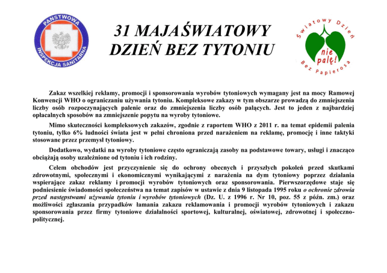 31 MAJA ŚWIATOWY DZIEŃ BEZ TYTONIU Zakaz wszelkiej reklamy, promocji i sponsorowania wyrobów tytoniowych wymagany jest na mocy Ramowej Konwencji WHO o ograniczaniu używania tytoniu. Kompleksowe zakazy w tym obszarze prowadzą do zmniejszenia liczby osób rozpoczynających palenie oraz do zmniejszenia liczby osób palących. Jest to jeden z najbardziej opłacalnych sposobów na zmniejszenie popytu na wyroby tytoniowe. Mimo skuteczności kompleksowych zakazów, zgodnie z raportem WHO z 2011 r. na temat epidemii palenia tytoniu, tylko 6% ludności świata jest w pełni chroniona przed narażeniem na reklamę, promocję i inne taktyki stosowane przez przemysł tytoniowy. Dodatkowo, wydatki na wyroby tytoniowe często ograniczają zasoby na podstawowe towary, usługi i znacząco obciążają osoby uzależnione od tytoniu i ich rodziny. Celem obchodów jest przyczynienie się do ochrony obecnych i przyszłych pokoleń przed skutkami zdrowotnymi, społecznymi i ekonomicznymi wynikającymi z narażenia na dym tytoniowy poprzez działania wspierające zakaz reklamy i promocji wyrobów tytoniowych oraz sponsorowania. Pierwszorzędowe staje się podniesienie świadomości społeczeństwa na temat zapisów w ustawie z dnia 9 listopada 1995 roku o ochronie zdrowia przed następstwami używania tytoniu i wyrobów tytoniowych (Dz. U. z 1996 r. Nr 10, poz. 55 z późn. zm.) oraz możliwości zgłaszania przypadków łamania zakazu reklamowania i promocji wyrobów tytoniowych i zakazu sponsorowania przez firmy tytoniowe działalności sportowej, kulturalnej, oświatowej, zdrowotnej i społecznopolitycznej.