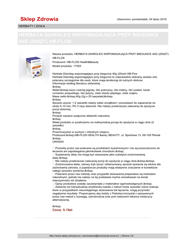 Sklep Zdrowia Utworzono: poniedziałek, 04 lipiec 2016 HERBATY I ZIOŁA HERBATA DIAROLEG WSPOMAGAJĄCA PRZY BIEGUNCE 40G (20SZT) HB-FLOS Nazwa produktu: HERBATA DIAROLEG WSPOMAGAJĄCA PRZY BIEGUNCE 40G (20SZT) HB-FLOS Producent: HB-FLOS Health&Beauty Model produktu: 17353 Herbata Diaroleg wspomagająco przy biegunce 40g (20szt) HB-Flos Herbata Diaroleg wspomagająco przy biegunce to odpowiednio dobrany zestaw zioł, polecany szczegolnie dla osob, ktore mają tendencję do luźnych stolcow. Informacje według literatury zielarskiej. Skład: owoc czarnej jagody, liść pokrzywy, liść maliny, liść szałwii, kwiat rumianku pospolitego, liść jeżyny, ziele rdestu ptasiego, ziele cząbru. Masa netto: 40g (2g x 20 saszetek) Sposob użycia: 1-2 saszetki należy zalać wrzątkiem i pozostawić do zaparzenia na około 5-10 min. Pić 3 razy dziennie. Nie należy przekraczać zalecanej do spożycia porcji dziennej. Produkt zawiera wyłącznie składniki naturalne. Skład produktu w przeliczeniu na maksymalną porcję do spożycia w ciągu dnia (2 saszetki) Przechowywać w suchym i chłodnym miejscu. Producent: HB-FLOS HEALTH & BEAUTY, ul. Sportowa 13, 09-100 Płońsk UWAGA! Produkty przez nas polecane są produktami żywieniowymi i nie są przeznaczone do leczenia ani zapobiegania jakimkolwiek chorobom. Suplementy diety nie mogą być stosowane jako substytut zrożnicowanej diety. Nie należy przekraczać zalecanej porcji do spożycia w ciągu dnia. Zrożnicowana dieta, zdrowy tryb życia i zbilansowany sposob żywienia są istotne dla zachowania zdrowia, a pojedyncze produkty mają relatywne znaczenie w kontekście całego sposobu żywienia. Polecane przez nas metody oraz przypadki stosowania preparatow są metodami naturalnymi, jednak nie należy na tej podstawie mylnie wnioskować na temat intensywności ich działania. Opisy produktow zostały zaczerpnięte z materiałow ogolnodostępnych. Zależnie od indywidualnej wrażliwości każda z metod może wywołać rożne reakcje, ktore w przypadkach nieumiejętnego stosowania lub łączenia, mogą przynieść negatywne rezultaty. Proponujemy aby każdy z Państwa korzystał z opisywanych przez nas metod z rozwagą, ostrożnością oraz pod nadzorem lekarza medycyny alternatywnej. Cena: 5.19zł http://www.sklep-zdrowia.eu | [email protected] | | Strona 1/2 Sklep Zdrowia Utworzono: poniedziałek, 04 lipiec 2016 HERBATY I ZIOŁA HERBATA DIAROLEG WSPOMAGAJĄCA PRZY BIEGUNCE 40G (20SZT) HB-FLOS Dostępność: Ten produkt został dodany do sklepu w dniu czwartek, 16 czerwiec 2016 http://www.sklep-zdrowia.eu | [email protected] | | Strona 2/2