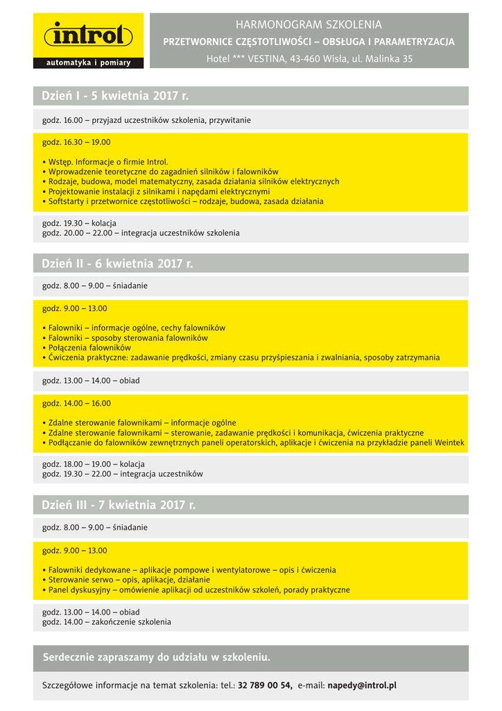 HARMONOGRAM SZKOLENIA PRZETWORNICE CZĘSTOTLIWOŚCI – OBSŁUGA I PARAMETRYZACJA Hotel *** VESTINA, 43-460 Wisła, ul. Malinka 35 Dzień I - 5 kwietnia 2017 r. godz. 16.00 – przyjazd uczestników szkolenia, przywitanie godz. 16.30 – 19.00 • Wstęp. Informacje o firmie Introl. • Wprowadzenie teoretyczne do zagadnień silników i falowników • Rodzaje, budowa, model matematyczny, zasada działania silników elektrycznych • Projektowanie instalacji z silnikami i napędami elektrycznymi • Softstarty i przetwornice częstotliwości – rodzaje, budowa, zasada działania godz. 19.30 – kolacja godz. 20.00 – 22.00 – integracja uczestników szkolenia Dzień II - 6 kwietnia 2017 r. godz. 8.00 – 9.00 – śniadanie godz. 9.00 – 13.00 • Falowniki – informacje ogólne, cechy falowników • Falowniki – sposoby sterowania falowników • Połączenia falowników • Ćwiczenia praktyczne: zadawanie prędkości, zmiany czasu przyśpieszania i zwalniania, sposoby zatrzymania godz. 13.00 – 14.00 – obiad godz. 14.00 – 16.00 • Zdalne sterowanie falownikami – informacje ogólne • Zdalne sterowanie falownikami – sterowanie, zadawanie prędkości i komunikacja, ćwiczenia praktyczne • Podłączanie do falowników zewnętrznych paneli operatorskich, aplikacje i ćwiczenia na przykładzie paneli Weintek godz. 18.00 – 19.00 – kolacja godz. 19.30 – 22.00 – integracja uczestników Dzień III - 7 kwietnia 2017 r. godz. 8.00 – 9.00 – śniadanie godz. 9.00 – 13.00 • Falowniki dedykowane – aplikacje pompowe i wentylatorowe – opis i ćwiczenia • Sterowanie serwo – opis, aplikacje, działanie • Panel dyskusyjny – omówienie aplikacji od uczestników szkoleń, porady praktyczne godz. 13.00 – 14.00 – obiad godz. 14.00 – zakończenie szkolenia Serdecznie zapraszamy do udziału w szkoleniu. Szczegółowe informacje na temat szkolenia: tel.: 32 789 00 54, e-mail: [email protected]