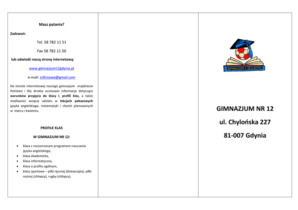 Masz pytania? Zadzwoo: Tel. 58 782 11 51 Fax 58 782 11 50 lub odwiedź naszą stronę internetową: www.gimnazjum12gdynia.pl e-mail: [email protected] Na stronie internetowej naszego gimnazjum znajdziecie Paostwo i Wy drodzy uczniowie informacje dotyczące warunków przyjęcia do klasy I, profili klas, a także możliwości wzięcia udziału w lekcjach pokazowych języka angielskiego, matematyki i chemii planowanych w marcu i kwietniu. GIMNAZJUM NR 12 ul. Chylooska 227 PROFILE KLAS W GIMNAZJUM NR 12: klasa z rozszerzonym programem nauczania języka angielskiego, klasa akademicka, klasa informatyczna, klasa o profilu ogólnym, klasy sportowe – piłki ręcznej (dziewczęta), piłki nożnej (chłopcy), rugby (chłopcy). 81-007 Gdynia DROGI SZÓSTOKLASISTO! DROGI OPIEKUNIE ABSOLWENTA SZKOŁY PODSTAWOWEJ! W ubiegłym oraz bieżącym roku szkolnym Dyrekcja Gimnazjum nr 12 w Gdyni wprowadziła wiele zmian, które skutkują stale i konsekwentnie podnoszonym poziomem nauczania i osiągnięd naszych uczniów. Reorganizacja i unowocześnienie infrastruktury placówki pozwoli naszym podopiecznym zdobywad wiedzę w efektywny sposób, na najwyższym poziomie. Jeżeli więc chcielibyście Paostwo, aby Wasze dzieci kontynuowały naukę, a Wy drodzy Absolwenci szkół podstawowych marzycie o nauce w GIMNAZJUM, które: posiada salę multimedialną przeznaczoną do nauki języka angielskiego, wyposażoną w najnowocześniejszą tablicę interaktywną i sprzęt multimedialny; jako pierwsze w Gdyni stworzyło Klasę Akademicką dzięki współpracy z Politechniką Gdaoską, w której zajęcia prowadzid będą okresowo studenci w/w. uczelni; posiada dwie pracownie informatyczne; ma własną siłownię; planuje wyposażenie każdej z klas w komputer; Wprowadziło dziennik elektroniczny, który pozwala rodzicom i uczniom sprawowanie bieżącej kontroli ocen i frekwencji uczniów oraz na stały kontakt z nauczycielami bez potrzeby odwiedzania szkoły; jest organizatorem wielu imprez m.in. Przeglądu Piosenki Popularnej POP – CIS; organizuje turnieje i mistrzostwa sportowe np.: Otwarty Turniej Tradycyjnego WUSHU dla juniorów i seniorów, Turniej Miast Bliźniaczych, turnieje i zawody rangi wojewódzkiej i ogólnopolskiej np. Turniej Piłki Nożnej CISOWA CUP; stwarza możliwości rozwoju umiejętności sportowych w klasach o profilach: rugby, piłki ręcznej, piłki nożnej oraz zajęciach sportowych pozalekcyjnych; otacza opieką pedagoga i psychologa wszystkich uczniów; posiada dobrze zaopatrzoną bibliotekę; ceni promuje pracę na rzecz innych – koło Caritas; posiada gabinety lekarskie: stomatologiczny oraz medyczny a wszyscy uczniowie objęci są opieką pielęgniarską. KONIECZNIE ZŁÓŻCIE PODANIE I DOŁĄCZCIE DO NASZEGO GRONA - UCZNIÓW GIMNAZJUM NR 12 W GDYNI JUŻ W NADCHODZĄCYM ROKU SZKOLNYM! Termin składania podao od 01. 0. 2011 r. do 31. 05. 2011 r. ZAPRASZAMY!!!