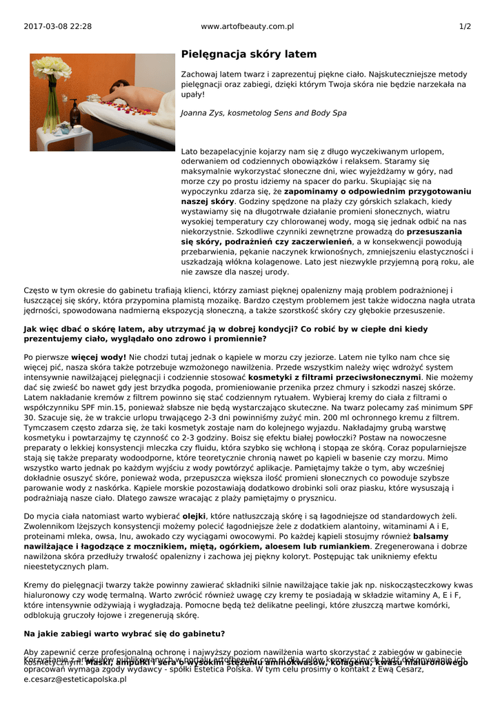 2017-03-08 22:28 www.artofbeauty.com.pl 1/2 Pielęgnacja skóry latem Zachowaj latem twarz i zaprezentuj piękne ciało. Najskuteczniejsze metody pielęgnacji oraz zabiegi, dzięki którym Twoja skóra nie będzie narzekała na upały! Joanna Zys, kosmetolog Sens and Body Spa Lato bezapelacyjnie kojarzy nam się z długo wyczekiwanym urlopem, oderwaniem od codziennych obowiązków i relaksem. Staramy się maksymalnie wykorzystać słoneczne dni, wiec wyjeżdżamy w góry, nad morze czy po prostu idziemy na spacer do parku. Skupiając się na wypoczynku zdarza się, że zapominamy o odpowiednim przygotowaniu naszej skóry. Godziny spędzone na plaży czy górskich szlakach, kiedy wystawiamy się na długotrwałe działanie promieni słonecznych, wiatru wysokiej temperatury czy chlorowanej wody, mogą się jednak odbić na nas niekorzystnie. Szkodliwe czynniki zewnętrzne prowadzą do przesuszania się skóry, podrażnień czy zaczerwienień, a w konsekwencji powodują przebarwienia, pękanie naczynek krwionośnych, zmniejszeniu elastyczności i uszkadzają włókna kolagenowe. Lato jest niezwykle przyjemną porą roku, ale nie zawsze dla naszej urody. Często w tym okresie do gabinetu trafiają klienci, którzy zamiast pięknej opalenizny mają problem podrażnionej i łuszczącej się skóry, która przypomina plamistą mozaikę. Bardzo częstym problemem jest także widoczna nagła utrata jędrności, spowodowana nadmierną ekspozycją słoneczną, a także szorstkość skóry czy głębokie przesuszenie. Jak więc dbać o skórę latem, aby utrzymać ją w dobrej kondycji? Co robić by w ciepłe dni kiedy prezentujemy ciało, wyglądało ono zdrowo i promiennie? Po pierwsze więcej wody! Nie chodzi tutaj jednak o kąpiele w morzu czy jeziorze. Latem nie tylko nam chce się więcej pić, nasza skóra także potrzebuje wzmożonego nawilżenia. Przede wszystkim należy więc wdrożyć system intensywnie nawilżającej pielęgnacji i codziennie stosować kosmetyki z filtrami przeciwsłonecznymi. Nie możemy dać się zwieść bo nawet gdy jest brzydka pogoda, promieniowanie przenika przez chmury i szkodzi naszej skórze. Latem nakładanie kremów z filtrem powinno się stać codziennym rytuałem. Wybieraj kremy do ciała z filtrami o współczynniku SPF min.15, ponieważ słabsze nie będą wystarczająco skuteczne. Na twarz polecamy zaś minimum SPF 30. Szacuje się, że w trakcie urlopu trwającego 2-3 dni powinniśmy zużyć min. 200 ml ochronnego kremu z filtrem. Tymczasem często zdarza się, że taki kosmetyk zostaje nam do kolejnego wyjazdu. Nakładajmy grubą warstwę kosmetyku i powtarzajmy tę czynność co 2-3 godziny. Boisz się efektu białej powłoczki? Postaw na nowoczesne preparaty o lekkiej konsystencji mleczka czy fluidu, która szybko się wchłoną i stopąa ze skórą. Coraz popularniejsze stają się także preparaty wodoodporne, które teoretycznie chronią nawet po kąpieli w basenie czy morzu. Mimo wszystko warto jednak po każdym wyjściu z wody powtórzyć aplikacje. Pamiętajmy także o tym, aby wcześniej dokładnie osuszyć skóre, ponieważ woda, przepuszcza większa ilość promieni słonecznych co powoduje szybsze parowanie wody z naskórka. Kąpiele morskie pozostawiają dodatkowo drobinki soli oraz piasku, które wysuszają i podrażniają nasze ciało. Dlatego zawsze wracając z plaży pamiętajmy o prysznicu. Do mycia ciała natomiast warto wybierać olejki, które natłuszczają skórę i są łagodniejsze od standardowych żeli. Zwolennikom lżejszych konsystencji możemy polecić łagodniejsze żele z dodatkiem alantoiny, witaminami A i E, proteinami mleka, owsa, lnu, awokado czy wyciągami owocowymi. Po każdej kąpieli stosujmy również balsamy nawilżające i łagodzące z mocznikiem, miętą, ogórkiem, aloesem lub rumiankiem. Zregenerowana i dobrze nawilżona skóra przedłuży trwałość opalenizny i zachowa jej piękny koloryt. Postępując tak unikniemy efektu nieestetycznych plam. Kremy do pielęgnacji twarzy także powinny zawierać składniki silnie nawilżające takie jak np. niskocząsteczkowy kwas hialuronowy czy wodę termalną. Warto zwrócić również uwagę czy kremy te posiadają w składzie witaminy A, E i F, które intensywnie odżywiają i wygładzają. Pomocne będą też delikatne peelingi, które złuszczą martwe komórki, odblokują gruczoły łojowe i zregenerują skórę. Na jakie zabiegi warto wybrać się do gabinetu? Aby zapewnić cerze profesjonalną ochronę i najwyższy poziom nawilżenia warto skorzystać z zabiegów w gabinecie Korzystanie z artykułów publikowanych artofbeauty.com.pl dla celów komercyjnych bądź dokonywanie ich kosmetycznym. Maski, ampułki i serawoportalu wysokim stężeniu aminokwasów, kolagenu, kwasu hialuronowego opracowań wymaga zgody wydawcy - spółki Estetica Polska. W tym celu prosimy o kontakt z Ewą Cesarz, [email protected] 2017-03-08 22:28 www.artofbeauty.com.pl 2/2 czy mocznika przynoszą świetne rezultaty juz po pierwszej wizycie. Szczególnie polecamy te z dodatkiem alg i aloesu, które intensywnie łagodzą i regenerują. W wyjątkowo upalne dni przyjemne ukojenie przynoszą maski żelowe oraz alginatowe, które także zniwelują zaczernienia i podrażnienia. Poprawiają owal twarzy i zwiększają penetrację substancji aktywnych w głąb skóry. Jeśli zabieg wykonywany jest z masażem twarzy to powinien on być raczej delikatny i nie pobudzający zbyt silnie mikrokrążenia. Zabiegi pielęgnacyjne można wspomóc zabiegami aparaturowymi. Zwiększają przenikanie przeznaskórkowe pogłębiając penetrację substancji czynnych z produktów kosmetycznych. W okresie letnim wskazany jest także peeling kawitacyjny, który ma właściwości antybakteryjne - delikatnie usunie zrogowaciałe komórki naskórka, odświeży i rozjaśni cerę. Świetna jest również oxybrazja nazywana inaczej mikrodermabrazją wodno-tlenową, gdzie czynnikiem złuszczającym naskórek jest strumi