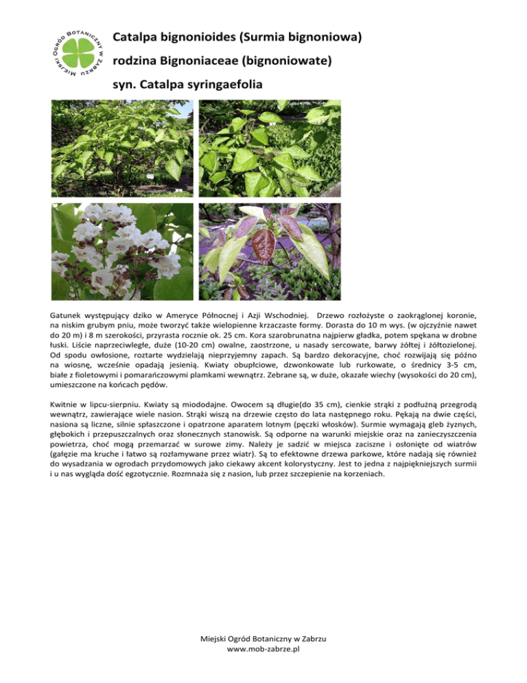 Catalpa bignonioides (Surmia bignoniowa) rodzina Bignoniaceae (bignoniowate) syn. Catalpa syringaefolia Gatunek występujący dziko w Ameryce Północnej i Azji Wschodniej. Drzewo rozłożyste o zaokrąglonej koronie, na niskim grubym pniu, może tworzyć także wielopienne krzaczaste formy. Dorasta do 10 m wys. (w ojczyźnie nawet do 20 m) i 8 m szerokości, przyrasta rocznie ok. 25 cm. Kora szarobrunatna najpierw gładka, potem spękana w drobne łuski. Liście naprzeciwległe, duże (10-20 cm) owalne, zaostrzone, u nasady sercowate, barwy żółtej i żółtozielonej. Od spodu owłosione, roztarte wydzielają nieprzyjemny zapach. Są bardzo dekoracyjne, choć rozwijają się późno na wiosnę, wcześnie opadają jesienią. Kwiaty obupłciowe, dzwonkowate lub rurkowate, o średnicy 3-5 cm, białe z fioletowymi i pomarańczowymi plamkami wewnątrz. Zebrane są, w duże, okazałe wiechy (wysokości do 20 cm), umieszczone na końcach pędów. Kwitnie w lipcu-sierpniu. Kwiaty są miododajne. Owocem są długie(do 35 cm), cienkie strąki z podłużną przegrodą wewnątrz, zawierające wiele nasion. Strąki wiszą na drzewie często do lata następnego roku. Pękają na dwie części, nasiona są liczne, silnie spłaszczone i opatrzone aparatem lotnym (pęczki włosków). Surmie wymagają gleb żyznych, głębokich i przepuszczalnych oraz słonecznych stanowisk. Są odporne na warunki miejskie oraz na zanieczyszczenia powietrza, choć mogą przemarzać w surowe zimy. Należy je sadzić w miejsca zaciszne i osłonięte od wiatrów (gałęzie ma kruche i łatwo są rozłamywane przez wiatr). Są to efektowne drzewa parkowe, które nadają się również do wysadzania w ogrodach przydomowych jako ciekawy akcent kolorystyczny. Jest to jedna z najpiękniejszych surmii i u nas wygląda dość egzotycznie. Rozmnaża się z nasion, lub przez szczepienie na korzeniach. Miejski Ogród Botaniczny w Zabrzu www.mob-zabrze.pl