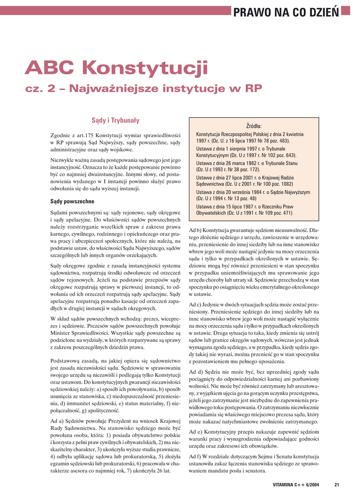 PRAWO NA CO DZIEŃ ABC Konstytucji cz. 2 – Najważniejsze instytucje w RP Sądy i Trybunały Zgodnie z art.175 Konstytucji wymiar sprawiedliwości w RP sprawują Sąd Najwyższy, sądy powszechne, sądy administracyjne oraz sądy wojskowe. Niezwykle ważną zasadą postępowania sądowego jest jego instancyjność. Oznacza to że każde postępowanie powinno być co najmniej dwuinstancyjne. Innymi słowy, od postanowienia wydanego w I instancji powinno służyć prawo odwołania się do sądu wyższej instancji. Sądy powszechne Sądami powszechnymi są: sądy rejonowe, sądy okręgowe i sądy apelacyjne. Do właściwości sądów powszechnych należy rozstrzyganie wszelkich spraw z zakresu prawa karnego, cywilnego, rodzinnego i opiekuńczego oraz prawa pracy i ubezpieczeń społecznych, które nie należą, na podstawie ustaw, do właściwości Sądu Najwyższego, sądów szczególnych lub innych organów orzekających. Sądy okręgowe zgodnie z zasadą instancyjności systemu sądownictwa, rozpatrują środki odwoławcze od orzeczeń sądów rejonowych. Jeżeli na podstawie przepisów sądy okręgowe rozpatrują sprawy w pierwszej instancji, to odwołania od ich orzeczeń rozpatrują sądy apelacyjne. Sądy apelacyjne rozpatrują ponadto kasacje od orzeczeń zapadłych w drugiej instancji w sądach okręgowych. W skład sądów powszechnych wchodzą: prezes, wiceprezes i sędziowie. Prezesów sądów powszechnych powołuje Minister Sprawiedliwości. Wszystkie sądy powszechne są podzielone na wydziały, w których rozpatrywane są sprawy z zakresu poszczególnych dziedzin prawa. Podstawową zasadą, na jakiej opiera się sądownictwo jest zasada niezawisłości sądu. Sędziowie w sprawowaniu swojego urzędu są niezawiśli i podlegają tylko Konstytucji oraz ustawom. Do konstytucyjnych gwarancji niezawisłości sędziowskiej należy: a) sposób ich powoływania, b) sposób usunięcia ze stanowiska, c) niedopuszczalność przeniesienia, d) immunitet sędziowski, e) status materialny, f) niepołączalność, g) apolityczność. Ad a) Sędziów powołuje Prezydent na wniosek Krajowej Rady Sądownictwa. Na stanowisko sędziego może być powołana osoba, która: 1) posiada obywatelstwo polskie i korzysta z pełni praw cywilnych i obywatelskich, 2) ma nieskazitelny charakter, 3) ukończyła wyższe studia prawnicze, 4) odbyła aplikację sądowa lub prokuratorską, 5) złożyła egzamin sędziowski lub prokuratorski, 6) pracowała w charakterze asesora co najmniej rok, 7) ukończyła 26 lat. Źródła: Konstytucja Rzeczpospolitej Polskiej z dnia 2 kwietnia 1997 r. (Dz. U. z 16 lipca 1997 Nr 78 poz. 483). Ustawa z dnia 1 sierpnia 1997 r. o Trybunale Konstytucyjnym (Dz. U z 1997 r. Nr 102 poz. 643). Ustawa z dnia 26 marca 1982 r. o Trybunale Stanu (Dz. U z 1993 r. Nr 38 poz. 172). Ustawa z dnia 27 lipca 2001 r. o Krajowej Radzie Sądownictwa (Dz. U z 2001 r. Nr 100 poz. 1082) Ustawa z dnia 20 września 1984 r. o Sądzie Najwyższym (Dz. U z 1994 r. Nr 13 poz. 48) Ustawa z dnia 15 lipca 1987 r. o Rzeczniku Praw Obywatelskich (Dz. U z 1991 r. Nr 109 poz. 471) Ad b) Konstytucja gwarantuje sędziom nieusuwalność. Dlatego złożenie sędziego z urzędu, zawieszenie w urzędowaniu, przeniesienie do innej siedziby lub na inne stanowisko wbrew jego woli może nastąpić jedynie na mocy orzeczenia sądu i tylko w przypadkach określonych w ustawie. Sędziowie mogą być również przeniesieni w stan spoczynku w przypadku uniemożliwiających mu sprawowanie jego urzędu choroby lub utraty sił. Sędziowie przechodzą w stan spoczynku po osiągnięciu wieku emerytalnego określonego w ustawie. Ad c) Jedynie w dwóch sytuacjach sędzia może zostać przeniesiony. Przeniesienie sędziego do innej siedziby lub na inne stanowisko wbrew jego woli może nastąpić wyłącznie na mocy orzeczenia sądu i tylko w przypadkach określonych w ustawie. Druga sytuacja to taka, kiedy zmienia się ustrój sądów lub granice okręgów sądowych, wówczas jest jednak wymagana zgoda sędziego, a w przypadku, kiedy sędzia zgody takiej nie wyrazi, można przenieść go w stan spoczynku z pozostawieniem mu pełnego uposażenia. Ad d) Sędzia nie może być, bez uprzedniej zgody sądu pociągnięty do odpowiedzialności karnej ani pozbawiony wolności. Nie może być również zatrzymany lub aresztowany, z wyjątkiem ujęcia go na gorącym uczynku przestępstwa, jeżeli jego zatrzymanie jest niezbędne do zapewnienia prawidłowego toku postępowania. O zatrzymaniu niezwłocznie powiadamia się właściwego miejscowo prezesa sądu, który może nakazać natychmiastowe zwolnienie zatrzymanego. Ad e) Konstytucyjny przepis nakazuje zapewnić sędziom warunki pracy i wynagrodzenia odpowiadające godności urzędu oraz zakresowi ich obowiązków. Ad f) W rozdziale dotyczącym Sejmu i Senatu konstytucja ustanowiła zakaz łączenia stanowiska sędziego ze sprawowaniem mandatu posła i senatora. VITAMINA C++ 6/2004 21 PRAWO NA CO DZIEŃ Ad g) Sędzia nie może należeć do partii politycznej, związku zawodowego ani prowadzić działalności publicznej nie dającej się pogodzić z zasadami niezależności sądów i niezawisłości sędziów. Sąd Najwyższy Sąd Najwyższy sprawuje nadzór nad działalnością sądów powszechnych i wojskowych w zakresie orzekania. W skład Sądu Najwyższego wchodzą: Pierwszy Prezes, prezesi oraz sędziowie. SN dzieli się na cztery Izby: Pracy, Ubezpieczeń Społecznych i Spraw Publicznych; Cywilną; Karną i Wojskową. Na czele stoi Pierwszy Prezes, który kieruje pracami Sądu Najwyższego. Na sześcioletnia kadencję powołuje go Prezydent Rzeczypospolitej wybierając spośród kandydatów przedstawionych przez Zgromadzenie Ogólne Sędziów Sądu Najwyższego. Do kompetencji Sądu Najwyższego należy: 1) rozpoznawanie kasacji przysługujących stronie od wyroku lub postanowienia wydanego przez sąd drugiej instancji i kończącego postępowanie w sprawie; 2) podejmowanie uchwał maj