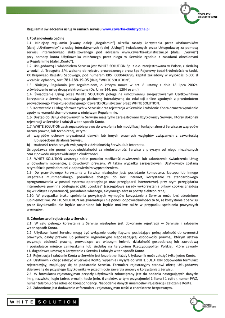 Regulamin świadczenia usług w ramach serwisu www.czwartki-okulistyczne.pl I. Postanowienia ogólne 1.1. Niniejszy regulamin (zwany dalej: „Regulamin”) określa zasady korzystania przez użytkowników (dalej „Użytkownicy”) z usług interaktywnych (dalej „Usługi”) świadczonych przez Usługodawcę za pomocą serwisu internetowego zlokalizowanego pod adresem www.czwartki-okulistyczne.pl (dalej: „Serwis”) przy pomocy konta Użytkownika założonego przez niego w Serwisie zgodnie z zasadami określonymi w Regulaminie (dalej „Konto”). 1.2. Usługodawcą i właścicielem Serwisu jest WHITE SOLUTION Sp. z o.o. zarejestrowana w Polsce, z siedzibą w Łodzi, ul. Traugutta 5/4, wpisaną do rejestru prowadzonego przez Sąd Rejonowy Łodzi-Śródmieścia w Łodzi, XX Krajowego Rejestru Sądowego, pod numerem KRS 0000443796, kapitał zakładowy w wysokości 5.000 zł w całości opłacony, NIP: 781-188-19-95 (dalej "WHITE SOLUTION"). 1.3. Niniejszy Regulamin jest regulaminem, o którym mowa w art. 8 ustawy z dnia 18 lipca 2002r. o świadczeniu usług drogą elektroniczną (Dz. U. nr 144, poz. 1204 ze zm.). 1.4. Świadczenie Usług przez WHITE SOLUTION polega na umożliwieniu zarejestrowanym Użytkownikom korzystania z Serwisu, stanowiącego platformę interaktywną do edukacji online zgodnych z przedmiotem prowadzonego Projektu edukacyjnego ‘Czwartki Okulistyczne’ przez WHITE SOLUTION. 1.5. Korzystanie z Usług oferowanych w Serwisie oraz rejestracja w Serwisie i założenie Konta oznacza wyrażenie zgody na warunki sformułowane w niniejszym Regulaminie. 1.6. Dostęp do Usług oferowanych w Serwisie mają tylko zarejestrowani Użytkownicy Serwisu, którzy dokonali rejestracji w Serwisie i założyli w ten sposób Konto. 1.7. WHITE SOLUTION zastrzega sobie prawo do wycofania lub modyfikacji funkcjonalności Serwisu ze względów natury prawnej lub technicznej, w tym: a) względów ochrony prywatności danych lub innych prawnych względów związanych z zawartością lub sposobem działania Serwisu; b) trudności technicznych związanych z działalnością Serwisu lub Internetu. Usługodawca nie ponosi odpowiedzialności za niedostępność Serwisu z przyczyn od niego niezależnych oraz z powodu nieprzewidzianych okoliczności. 1.8. WHITE SOLUTION zastrzega sobie ponadto możliwość zawieszenia lub zakończenia świadczenia Usług w dowolnym momencie, z dowolnych przyczyn. W takim wypadku zarejestrowani Użytkownicy zostaną o tym fakcie powiadomieni z odpowiednim wyprzedzeniem. 1.9. Do prawidłowego korzystania z Serwisu niezbędne jest: posiadanie komputera, laptopa lub innego urządzenia multimedialnego, posiadanie dostępu do sieci Internet, korzystanie ze standardowego oprogramowania w postaci systemu operacyjnego oraz przeglądarki internetowej, przy czym przeglądarka internetowa powinna obsługiwać pliki „cookies” (szczegółowe zasady wykorzystania plików cookies znajdują się w Polityce Prywatności), posiadanie własnego, aktywnego adresu poczty elektronicznej. 1.10. W przypadku braku spełnienia powyższych wymogów korzystanie z Serwisu może być utrudnione lub niemożliwe. WHITE SOLUTION nie gwarantuje i nie ponosi odpowiedzialności za to, że korzystanie z Serwisu przez Użytkownika nie będzie utrudnione lub będzie możliwe także w przypadku spełnienia powyższych wymogów. II. Członkostwo i rejestracja w Serwisie 2.1. W celu pełnego korzystania z Serwisu niezbędne jest dokonanie rejestracji w Serwisie i założenie w ten sposób Konta. 2.2. Użytkownikami Serwisu mogą być wyłącznie osoby fizyczne posiadające pełną zdolność do czynności prawnych, osoby prawne lub jednostki organizacyjne nieposiadającej osobowości prawnej, którym ustawa przyznaje zdolność prawną, prowadzące we własnym imieniu działalność gospodarczą lub zawodową i posiadające miejsce zamieszkania lub siedzibę na terytorium Rzeczypospolitej Polskiej, które zawarły z Usługodawcą umowę o korzystanie z Serwisu i założyły w ten sposób Konto. 2.3. Rejestracja i założenie Konta w Serwisie jest bezpłatne. Każdy Użytkownik może założyć tylko jedno Konto. 2.4. Użytkownik chcąc założyć w Serwisie Konto, wypełnia i wysyła do WHITE SOLUTION odpowiedni formularz rejestracyjny, znajdujący się na podstronie Serwisu. Formularz rejestracyjny stanowi ofertę Usługodawcy skierowaną do przyszłego Użytkownika w przedmiocie zawarcia umowy o korzystanie z Serwisu. 2.5. W formularzu rejestracyjnym przyszły Użytkownik zobowiązany jest do podania następujących danych: imię, nazwisko, login (adres e-mail), hasło (min. 6 znaków, w tym przynajmniej 1 litera i 1 cyfra), numer PWZ, numer telefonu oraz adres do korespondencji. Niepodanie danych uniemożliwi rejestrację i założenie Konta. 2.6. Zabronione jest dodawanie w formularzu rejestracyjnym treści o charakterze bezprawnym. 2.7. Wysłanie formularza rejestracyjnego do WHITE SOLUTION stanowi przyjęcie oferty WHITE SOLUTION na zawarcie umowy o korzystanie z Serwisu na warunkach określonych w niniejszym Regulaminie. 2.8. WHITE SOLUTION, po zawarciu umowy o korzystanie z Serwisu, przesyła na podany przez Użytkownika adres poczty elektronicznej wiadomość z potwierdzeniem założenia Konta. 2.9. Umowa o korzystanie z Serwisu zawarta jest na czas nieokreślony. Zarówno Użytkownik jak i WHITE SOLUTION jest uprawniony do wypowiedzenia umowy o korzystanie z Serwisu w każdym czasie i bez podania przyczyny. Wypowiedzenie umowy następuje z zachowaniem 7-dniowego okresu wypowiedzenia. Wypowiedzenie umowy może nastąpić w formie pisemnej lub mailem na adres poczty elektronicznej. 2.10. WHITE SOLUTION informuje, że korzystanie z Konta może wiązać się z zagrożeniem pozyskania i modyfikowania danych Użytkownika przez osoby nieuprawnione. Z tego względu Użytkownik powinien stosować odpowiednie środki techniczne, które zminimalizują powyższe zagrożenie. WHITE SOLUTION nie ponosi odp