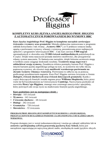KOMPLETNY KURS JĘZYKA ANGIELSKIEGO PROF. HIGGINS Z AUTOMATYCZNYM PORÓWNANIEM DO WYMOWY BBC Kurs Języka Angielskiego Prof. Higgins to kompletne narzędzie zawierające ćwiczenia z wymowy oraz gramatyki. Metoda edukacyjna zastosowana w programie zakłada korzystanie z tak zwanej „wymowy BBC”, co w praktyce oznacza naukę opartą o porównanie wymowy własnej z wzorową, prezentowaną przez najlepszych spikerów z programów telewizyjnych BBC . Cały kurs zawiera 5 000 nagrań zgromadzonych w słowniku oraz 22 000 ćwiczeń multimedialnych podzielonych na 6 części. Dzięki temu nauczyciel posiada mnóstwo możliwości, aby przygotować własny system nauczania. To fantastyczne narzędzie, dzięki któremu uczniowie mogą w krótkim czasie osiągnąć doskonałe rezultaty. Uczniowie mogą nagrywać i odsłuchiwać swoją wymowę. Zasadnicza różnica pomiędzy kursem Prof. Higgins a innymi kursami języka angielskiego polega na tym, że uczniowie nie tylko słyszą poprawną wymowę, ale również mają możliwość wzrokowego porównania na ekranie wymowy własnej z wzorcową. Porównanie to odbywa się za pomocą graficznego przedstawienia nagrania. Kurs Prof. Higgins zawiera ćwiczenia w formie dialogów, ćwiczeń słuchowych oraz ćwiczeń dotyczących gramatyki. Każda z części dotyczących fonetyki została nagrana przez Williama Shepharda, który przez wiele lat był koordynatorem na Uniwersytecie Cambrige. Nazwa kursu pochodzi od nazwiska Henry’ego Higginsa, znanego oraz cenionego nauczyciela i specjalisty, który poświęcił całe swoje życie na studiowanie fonetyki języka angielskiego. • • • • • • Kurs podzielony jest na następujące działy : Dźwięki - 183 ćwiczeń Wymowa - 162 ćwiczeń Ćwiczenia słuchowe – 68 ćwiczeń Dialogi – 282 ćwiczeń Gramatyka – 720 ćwiczeń Słownictwo – 52 ćwiczenia PROGRAM PROF. HIGGINS JEST KOMPLETNYM KURSEM J. ANGIELSKIEGO, PRZEZNACZONYM DO KAŻDEGO POZIOMU ZAAWANSOWANIA I DO KAŻDEJ GRUPY WIEKOWEJ. Program dostępny jest w wersji jednostanowiskowej i można go zakupić oddzielnie lub w zestawie z profesjonalną cyfrową pracownią językową Easy School, która jest narzędziem zapewniającym najwyższą jakość audio, niezbędną do nauki języków obcych. Easy School Poland Email [email protected] Website www.easyschoolsrl.com