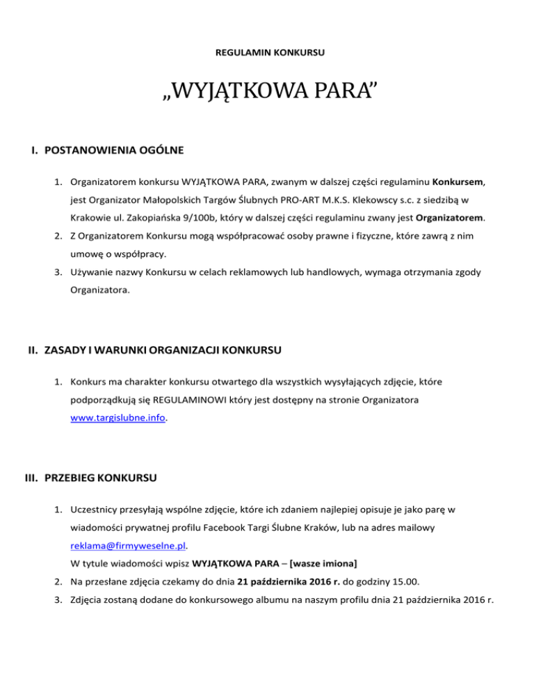 REGULAMIN KONKURSU „WYJĄTKOWAPARA” I. POSTANOWIENIA OGÓLNE 1. Organizatorem konkursu WYJĄTKOWA PARA, zwanym w dalszej części regulaminu Konkursem, jest Organizator Małopolskich Targów Ślubnych PRO-ART M.K.S. Klekowscy s.c. z siedzibą w Krakowie ul. Zakopiańska 9/100b, który w dalszej części regulaminu zwany jest Organizatorem. 2. Z Organizatorem Konkursu mogą współpracować osoby prawne i fizyczne, które zawrą z nim umowę o współpracy. 3. Używanie nazwy Konkursu w celach reklamowych lub handlowych, wymaga otrzymania zgody Organizatora. II. ZASADY I WARUNKI ORGANIZACJI KONKURSU 1. Konkurs ma charakter konkursu otwartego dla wszystkich wysyłających zdjęcie, które podporządkują się REGULAMINOWI który jest dostępny na stronie Organizatora www.targislubne.info. III. PRZEBIEG KONKURSU 1. Uczestnicy przesyłają wspólne zdjęcie, które ich zdaniem najlepiej opisuje je jako parę w wiadomości prywatnej profilu Facebook Targi Ślubne Kraków, lub na adres mailowy [email protected]. W tytule wiadomości wpisz WYJĄTKOWA PARA – [wasze imiona] 2. Na przesłane zdjęcia czekamy do dnia 21 października 2016 r. do godziny 15.00. 3. Zdjęcia zostaną dodane do konkursowego albumu na naszym profilu dnia 21 października 2016 r. 4. Zdjęcia z największą ilością dobrowolnych polubień od osób odwiedzających nasz profil wygrywają kolejno nagrody: o I miejsce – romantyczna kolacja dla dwojga w Restauracji Malecon w Krakowie. o II miejsce – profesjonalna sesja zdjęciowa wykonana wraz z makijażem oraz stylizacją fryzury przez White Bunny oraz Adelajda Beauty Concept. o III miejsce – tygodniowy wstęp dla pary do klubu sportowego Jatomi Fitness wraz z treningiem personalnym dla dwojga. 5. Konkurs trwa od 13 października 2016 r. do 3 listopada 2016 r. do godziny 19.00 6. Ogłoszenie wyników nastąpi 3 listopada poprzez profil Targi Ślubne Kraków na portalu Facebook. IV. NAGRODY 1. Poszczególne nagrody za zajęcie danego miejsca: o I miejsce – romantyczna kolacja dla dwojga. Termin realizacji do dnia 30.12.2016 r. o II miejsce – profesjonalna sesja zdjęciowa. Termin realizacji do dnia 30.12.2016 r. o III miejsce – tygodniowy wstęp dla pary do klubu sportowego wraz z treningiem personalnym dla dwojga. Obiór do dnia 30.12.2016 r. 2. Odbiór nagrody o Odbiór nagród nastąpi 6 listopada podczas XXX edycji Małopolskich Targów Ślubnych o godzinie 15.00 w Centrum Targowym Chemobudowa, pawilon A, ul. Klimeckiego 14, Kraków. o Zwycięzcy konkursu mają także możliwość odbioru nagrody w siedzibie firmy PRO-ART M.K.S. Klekowscy s.c., ul. Zakopiańska 9/100B,Kraków po uprzednim kontakcie telefonicznym, bądź mailowym. 3. Zwycięzcy konkursu nie mają możliwości zamiany nagrody na równowartość pieniężną. V. POSTANOWIENIA KOŃCOWE 1. Wysłanie zdjęcia do udziału w KONKURSIE równoznaczne jest ze złożeniem przez wysyłającego oświadczenia, że zapoznał się z treścią regulaminu oraz, że akceptuje niniejszy regulamin. Ponadto wyraża zgodę na przetwarzanie jego danych osobowych (zgodnie z ustawą o ochronie danych osobowych z dnia 29 08 1997r. Dz. U. Nr 133, Poz. 883) oraz wyraża zgodę na publikację i rozpowszechnianie ich wizerunku w mediach i sieci internetowej w związku z ich udziałem w Konkursie. 2. Zdjęcie wykonane przez uczestnika są jego własnością i mogą być wykorzystane do wszelkiego rodzaju akcji promocyjnych, graficznych, marketingowych przez Organizatora Konkursu. 3. Serwis Facebook.com udostępnia wyłącznie infrastrukturę, dzięki której możliwa jest organizacja konkursu. Facebook NIE sponsoruje i NIE uczestniczy w organizacji konkursu, a tym samym NIE ponosi odpowiedzialności za jakiekolwiek działania Organizatora i konsekwencje wynikające z przeprowadzenia konkursu na łamach serwisu. 4. W konkursie może wziąć udział tyko i wyłącznie osoba powyżej 18 roku życia, która posiada profil w serwisie facebook.com, a dane na profilu są zgodne z prawdziwymi 5. Przesłane zdjęcia nie mogą przedstawiać treści o charakterze obraźliwym, pornograficznym, zawierać treści reklamowych, obrazy uczuć religijnych oraz na tle rasistowskim. 6. Organizator ma prawo do ostatecznej weryfikacji zdjęć dopuszczonych do udziału w konkursie.