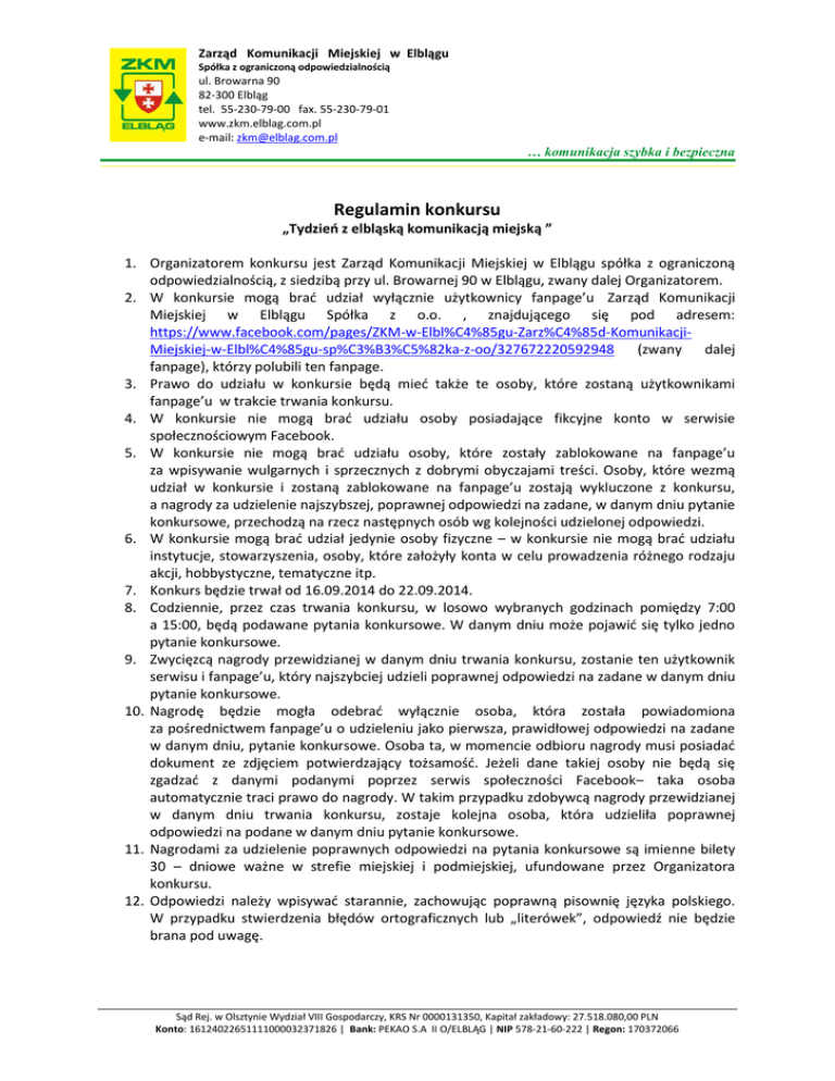 Zarząd Komunikacji Miejskiej w Elblągu Spółka z ograniczoną odpowiedzialnością ul. Browarna 90 82-300 Elbląg tel. 55-230-79-00 fax. 55-230-79-01 www.zkm.elblag.com.pl e-mail: [email protected] … komunikacja szybka i bezpieczna Regulamin konkursu „Tydzieo z elbląską komunikacją miejską ” 1. Organizatorem konkursu jest Zarząd Komunikacji Miejskiej w Elblągu spółka z ograniczoną odpowiedzialnością, z siedzibą przy ul. Browarnej 90 w Elblągu, zwany dalej Organizatorem. 2. W konkursie mogą brad udział wyłącznie użytkownicy fanpage’u Zarząd Komunikacji Miejskiej w Elblągu Spółka z o.o. , znajdującego się pod adresem: https://www.facebook.com/pages/ZKM-w-Elbl%C4%85gu-Zarz%C4%85d-KomunikacjiMiejskiej-w-Elbl%C4%85gu-sp%C3%B3%C5%82ka-z-oo/327672220592948 (zwany dalej fanpage), którzy polubili ten fanpage. 3. Prawo do udziału w konkursie będą mied także te osoby, które zostaną użytkownikami fanpage’u w trakcie trwania konkursu. 4. W konkursie nie mogą brad udziału osoby posiadające fikcyjne konto w serwisie społecznościowym Facebook. 5. W konkursie nie mogą brad udziału osoby, które zostały zablokowane na fanpage’u za wpisywanie wulgarnych i sprzecznych z dobrymi obyczajami treści. Osoby, które wezmą udział w konkursie i zostaną zablokowane na fanpage’u zostają wykluczone z konkursu, a nagrody za udzielenie najszybszej, poprawnej odpowiedzi na zadane, w danym dniu pytanie konkursowe, przechodzą na rzecz następnych osób wg kolejności udzielonej odpowiedzi. 6. W konkursie mogą brad udział jedynie osoby fizyczne – w konkursie nie mogą brad udziału instytucje, stowarzyszenia, osoby, które założyły konta w celu prowadzenia różnego rodzaju akcji, hobbystyczne, tematyczne itp. 7. Konkurs będzie trwał od 16.09.2014 do 22.09.2014. 8. Codziennie, przez czas trwania konkursu, w losowo wybranych godzinach pomiędzy 7:00 a 15:00, będą podawane pytania konkursowe. W danym dniu może pojawid się tylko jedno pytanie konkursowe. 9. Zwycięzcą nagrody przewidzianej w danym dniu trwania konkursu, zostanie ten użytkownik serwisu i fanpage’u, który najszybciej udzieli poprawnej odpowiedzi na zadane w danym dniu pytanie konkursowe. 10. Nagrodę będzie mogła odebrad wyłącznie osoba, która została powiadomiona za pośrednictwem fanpage’u o udzieleniu jako pierwsza, prawidłowej odpowiedzi na zadane w danym dniu, pytanie konkursowe. Osoba ta, w momencie odbioru nagrody musi posiadad dokument ze zdjęciem potwierdzający tożsamośd. Jeżeli dane takiej osoby nie będą się zgadzad z danymi podanymi poprzez serwis społeczności Facebook– taka osoba automatycznie traci prawo do nagrody. W takim przypadku zdobywcą nagrody przewidzianej w danym dniu trwania konkursu, zostaje kolejna osoba, która udzieliła poprawnej odpowiedzi na podane w danym dniu pytanie konkursowe. 11. Nagrodami za udzielenie poprawnych odpowiedzi na pytania konkursowe są imienne bilety 30 – dniowe ważne w strefie miejskiej i podmiejskiej, ufundowane przez Organizatora konkursu. 12. Odpowiedzi należy wpisywad starannie, zachowując poprawną pisownię języka polskiego. W przypadku stwierdzenia błędów ortograficznych lub „literówek”, odpowiedź nie będzie brana pod uwagę. Sąd Rej. w Olsztynie Wydział VIII Gospodarczy, KRS Nr 0000131350, Kapitał zakładowy: 27.518.080,00 PLN Konto: 16124022651111000032371826 | Bank: PEKAO S.A II O/ELBLĄG | NIP 578-21-60-222 | Regon: 170372066 13. Komentarze z odpowiedziami nie mogą zostad edytowane ani usuwane przez autorów. W przypadku stwierdzenia takiego faktu, jego autor traci prawo do nagrody, która przechodzi na rzecz kolejnej osoby wg kolejności odpowiedzi udzielonych na pytania konkursowe. 14. Podczas trwania całego konkursu każdy użytkownik fanpage’u może otrzymad tylko jedną nagrodę przewidzianą za najszybsze udzielenie poprawnej odpowiedzi na pytanie konkursowe. 15. O dacie rozpoczęcia okresu ważności biletu przewidzianego jako nagroda, decyduje osoba uhonorowana nagrodą, jednak rozpoczęcie okresu ważności biletu nie może nastąpid później niż w dniu 1 grudnia 2014 r. 16. Uczestnikami Konkursu nie mogą byd pracownicy ZKM w Elblągu oraz członkowie rodzin wskazanych osób, do drugiego stopnia pokrewieostwa. 17. W przypadku naruszenia Regulaminu przez Uczestnika konkursu, Osoby Odpowiedzialne powołane przez Organizatora mogą Uczestnika wykluczyd na każdym etapie Konkursu. 18. Organizator zastrzega sobie prawo do zmiany zasad Konkursu nawet w trakcie jego trwania. Informacja o zmianach będzie umieszczona na fanpage’u ZKM w Elblągu w serwisie Facebook. Zmiany wchodzą w życie z dniem ich ogłoszenia na stronach internetowych. 19. Organizator nie ponosi kosztów związanych z dostarczeniem odpowiedzi na pytania konkursowe przez uczestników Konkursu. 20. Organizator nie ponosi odpowiedzialności za problemy techniczne, powstałe w trakcie przesyłania odpowiedzi konkursowych i wynikające z nich opóźnienia w nadejściu odpowiedzi. 21. Udział w konkursie jest równoznaczny z wyrażeniem zgody na przetwarzanie danych osobowych przez Zarząd Komunikacji Miejskiej w Elblągu spółka z ograniczoną odpowiedzialnością, z siedzibą przy ul. Browarnej 90 w Elblągu w celach związanych z konkursem. 22. Organizator informuje, że Konkurs nie jest organizowany, wspierany ani sponsorowany przez Serwis Facebook oraz, że właściciel Serwisu Facebook nie ponosi żadnej odpowiedzialności wobec Uczestników Konkursu. 23. Udział w konkursie jest równoznaczny z akceptacją powyższego Regulaminu.