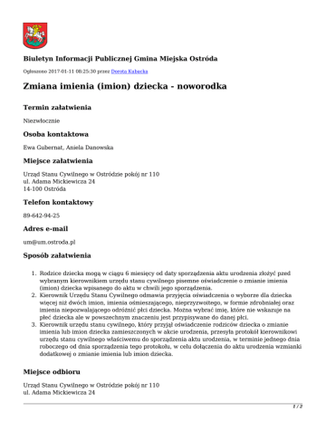 Biuletyn Informacji Publicznej Gmina Miejska Ostróda Ogłoszono 2017-01-11 08:25:30 przez Dorota Kubacka Zmiana imienia (imion) dziecka - noworodka Termin załatwienia Niezwłocznie Osoba kontaktowa Ewa Gubernat, Aniela Danowska Miejsce załatwienia Urząd Stanu Cywilnego w Ostródzie pokój nr 110 ul. Adama Mickiewicza 24 14-100 Ostróda Telefon kontaktowy 89-642-94-25 Adres e-mail [email protected] Sposób załatwienia 1. Rodzice dziecka mogą w ciągu 6 miesięcy od daty sporządzenia aktu urodzenia złożyć pzed wybranym kierownikiem urzędu stanu cywilnego pisemne oświadczenie o zmianie imienia (imion) dziecka wpisanego do aktu w chwili jego sporządzenia. 2. Kierownik Urzędu Stanu Cywilnego odmawia przyjęcia oświadczenia o wyborze dla dziecka więcej niż dwóch imion, imienia ośmieszającego, nieprzyzwoitego, w formie zdrobniałej oraz imienia niepozwalającego odróżnić płci dziecka. Można wybrać imię, które nie wskazuje na płeć dziecka ale w powszechnym znaczeniu jest przypisywane do danej płci. 3. Kierownik urzędu stanu cywilnego, który przyjął oświadczenie rodziców dziecka o zmianie imienia lub imion dziecka zamieszczonych w akcie urodzenia, przesyła protokół kierownikowi urzędu stanu cywilnego właściwemu do sporządzenia aktu urodzenia, w terminie jednego dnia roboczego od dnia sporządzenia tego protokołu, w celu dołączenia do aktu urodzenia wzmianki dodatkowej o zmianie imienia lub imion dziecka. Miejsce odbioru Urząd Stanu Cywilnego w Ostródzie pokój nr 110 ul. Adama Mickiewicza 24 1/2 14-100 Ostróda Wymagane Dokumenty 1. Dowody osobiste rodziców (do wglądu) 2. Dowód opłaty skarbowej. Opłaty Dokonanie zmiany w akcie – 11 zł. Odpis skrócony aktu – 22 zł Odpis zupełny aktu – 33 zł Zapłaty opłaty skarbowej należy dokonać w kasie Urzędu lub przelewem na rachunek bankowy Urzędu BGŻ S.A. Ostróda Nr 53 2030 0045 1110 0000 0244 6170 Tryb odwoławczy Wojewoda Warmińsko-Mazurski gdy kierownik odmawia wpisania więcej niż 2 imion, imienia ośmieszającego, zdrobniałego oraz imienia nie pozwalającego na odróżnienie płci dziecka Uwagi 1. Rodzice dziecka mogą w ciągu 6 miesięcy od daty sporządzenia aktu urodzenia złożyć kierownikowi urzędu stanu cywilnego pisemne oświadczenie o zmianie imienia (imion) dziecka. 2. Ustawodawca zezwala tylko na jednokrotne skorzystanie z możliwości złożenia oświadczenia przed kierownikiem urzędu stanu cywilnego o zmianie imienia lub imion dziecka, bowiem zmianie podlega tylko imię, które zostało wpisane do aktu w chwili jego sporządzenia. Po upływie 6 miesięcy od daty sporządzenia aktu urodzenia zmiana imion dziecka może nastąpić tylko w trybie ustawy o zmianie imion i nazwisk. 3. Oświadczenie o zmianie imienia dziecka powinno być złożone w urzędzie stanu cywilnego, w którym został sporządzony jego akt urodzenia. Podstawa prawna Ustawa z dnia 28 listopada 2014 r. Prawo o aktach stanu cywilnego (t.j. Dz.U. z 2016 r. poz. 2064). Ustawy z dnia 25 lutego 1964 r Kodeks rodzinny i opiekuńczy (Dz. U. 2015, poz. 2082) Ustawa o opłacie skarbowej z dnia 16 listopada 2006 r (t.j. Dz. U. z 2016 poz. 1827) 2/2