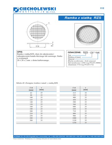 115 W E N T Y L A C J E sp. z o.o. Ramka z siatk¹ RZS 8 c Æd OPIS: Ramka z siatk¹ RZS, s³u¿y do zakoñczenia i zabezpieczenia kana³u t³ocznego lub ssawnego. Siatka o wymiarach 20 x 20 x 2 mm z drutu karbowanego. OZNACZENIE: RZS - Æd / mat. Typ Œrednica d [mm] Materia³ Blacha ocynkowana - brak oznaczeñ Stal nierdzewna 1.4301 (wg PN-EN 10088) Aluminium 5754 (wg PN-EN 573) Tabela 48. Dostêpne œrednice ramek z siatk¹ RZS. 30, 83-236 Æd [mm] c [mm] Æd [mm] c [mm] 63 80 100 125 140 150 160 180 200 224 250 280 300 25 25 25 25 25 25 25 25 25 35 35 35 35 315 355 400 450 500 560 600 630 710 800 900 1000 1120 1250 35 35 35 35 35 35 35 35 35 35 35 35 35 35 (woj. pomorskie); tel. (+48) 058 5304340, 058 5881200, 058 5881201; fax (+48) 058 5881208 Firma Ciecholewski - Wentylacje sp. z o.o. zastrzega sobie prawo do wprowadzania zmian