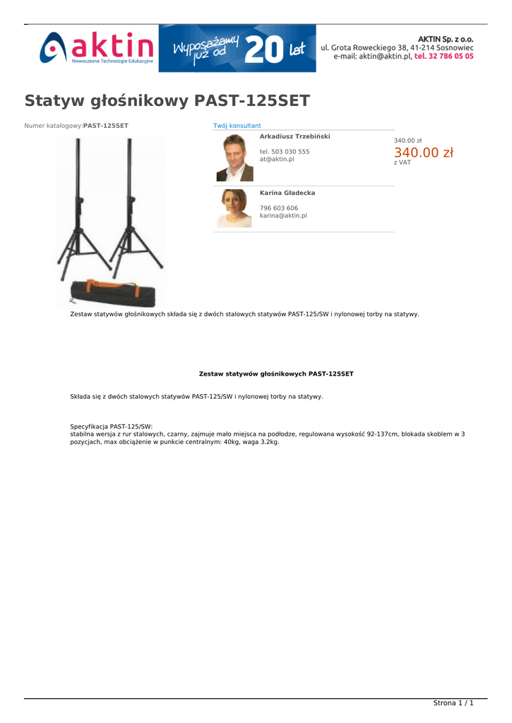 Statyw głośnikowy PAST-125SET Numer katalogowy:PAST-125SET Twój konsultant Arkadiusz Trzebiński tel. 503 030 555 [email protected] NOWOŚĆ W OFERCIE 340.00 zł 340.00 zł z VAT Karina Gładecka 796 603 606 [email protected] Zestaw statywów głośnikowych składa się z dwóch stalowych statywów PAST-125/SW i nylonowej torby na statywy. Zestaw statywów głośnikowych PAST-125SET Składa się z dwóch stalowych statywów PAST-125/SW i nylonowej torby na statywy. Specyfikacja PAST-125/SW: stabilna wersja z rur stalowych, czarny, zajmuje mało miejsca na podłodze, regulowana wysokość 92-137cm, blokada skoblem w 3 pozycjach, max obciążenie w punkcie centralnym: 40kg, waga 3.2kg. Strona 1 / 1 Powered by TCPDF (www.tcpdf.org)