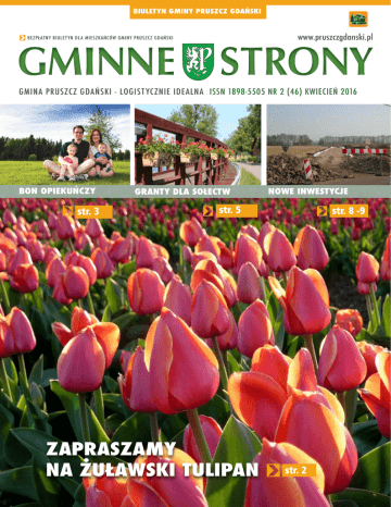 Biuletyn Gminy Pruszcz Gdański Bezpłatny BIULETYn dl a Mieszkańców Gminy Pruszcz Gdański GMINNE Projekt herbu gminy Pruszcz Gdański www.pruszczgdanski.pl strony Gmina Pruszcz Gdański - logist ycznie idealna ISSN 1898-5505 Nr 2 (46) kwiecień 2016 Tomasz Steifer del. 2013 Bon opiekuńczy str. 3 Granty dla sołectw Nowe inwestycje str. 5 Zapraszamy na Żuławski Tulipan str. 8 -9 str. 2 Aktualności T U L IP A N ŻUŁAWSKI 2016 GM MOKRY DWÓR INA SKI PRUSZCZ GDAŃ Tulipanowe Święto w Mokrym Dworze Impreza „Żuławski Tulipan” (zdobywca prestiżowej nagrody specjalnej Welcome Festiwal) co roku przyciąga do niewielkiego Mokrego Dworu tysiące zwiedzających. Wszystko za sprawą niezwykłych dywanów, ułożonych przez mieszkańców gminy Pruszcz Gdański z milionów główek tulipanów! -Zabieraliśmy mieszkańców i turystów w krainę bajek, na mistrzostwa w piłce nożnej oraz w podróż dookoła świata. Na „tulipanowo” uczciliśmy razem rok Chopina i beatyfikację Jana Pawła II. Tym razem będziemy świętować Rok Sienkiewicza – zapowiada wójt Magdalena Kołodziejczak i zaprasza do Mokrego Dworu całe rodziny. Rekonstrukcje walk historycznych, pokazy dawnego rzemiosła, inscenizacja oblęże- nia – wszystko to będzie tylko otoczką dla ułożonego z główek tulipanów dywanu nawiązującego do twórczości Henryka Sienkiewicza, a także do najsłynniejszych ekranizacji jego dzieł. A jak będzie się przedstawiała kompozycja? Bogusław Izdebski, projektant i koordynator układania kwiatowych dywanów nigdy nie zdradza szczegółów projektu, by goście imprezy mieli niespodziankę. Wiosenne porządki Nasz urząd zatrudnia dwóch pracowników odpowiedzialnych za porządek wzdłuż głównych ciągów komunikacyjnych w gminie. Wiosną ich praca polega m.in. na pielęgnacji zieleni, sadzeniu kwiatków, grabieniu, zbieraniu śmieci oraz likwidacji dzikich wysypisk śmieci. Dodatkowo, o porządek w niektórych miejscowościach dba 8 osób, które odpracowują w ten sposób różne wyroki sądowe. Pozostają oni w dyspozycji sołtysów. - Przy okazji apelujemy do mieszkańców, by sami również dbali o swoje otoczenie, zwracając szczególną uwagę na drzewka i żywopłoty. Nieprzycinane, wychodzą na 2 GMINNE STRONY 2/2016 chodniki i drogi, powodując zaśmiecanie, ale i zagrożenie – dodaje Katarzyna Kwiatek, kierownik referatu Gospodarki Komunalnej Urzędu Gminy. Warto skorzystać z kwietniowych zbiórek odpadów wielkogabarytowych, RTV i AGD które po raz pierwszy odbędą się bezpośrednio sprzed posesji (terminy w harmonogramie wywozu odpadów na stronie 4). W tworzenie kompozycji każdy może mieć swój wkład. - Serdecznie wszystkim zapraszam do wspólnego układania. To ciężka praca, która jednak daje wielką frajdę i satysfakcję - zachęca Wiesław Zbroiński, sołtys Mokrego Dworu, producent tulipanów i współorganizator imprezy. Termin imprezy jest ruchomy i zależy od zakwitnięcia oraz zebrania tulipanów. Jego ogłoszenia należy wypatrywać na stronie Gminy Pruszcz Gdański www.pruszczgdanski.pl oraz na Facebook/Gmina Pruszcz Gdański. Zdjęcie na okładce: Anna Jakubowska W naszej gminie mamy: 209 – koszy ulicznych (zwiększenie o 50% w ostatnich 2 latach) 50 – tabliczek informacyjnych dot. sprzątania po psach 17 – koszy na psie odchody oraz 17 podajników z workami na nie Psie odchody można również wrzucać do koszy ulicznych. Biuletyn informacyjny „Gminne Strony”. Redaktor naczelny: Magdalena Bielicka, projekt, przygotowanie do druku: 21 Grafik Anna Tybel Adres Redakcji: Urząd Gminy Pruszcz Gdański,ul. Wojska Polskiego 30, 83-000 Pruszcz Gdański, e-mail: [email protected], www.pruszczgdanski.pl aktualności Gmina Pruszcz Gdański jako jedna z nielicznych od maja 2014 r. do grudnia 2015 r. dotowała pobyt dziecka w żłobku. Pieniądze były wypłacane żłobkom, które adekwatnie obniżały opłatę dla rodzica. Wójt Magdalena Kołodziejczak wyszła z inicjatywą, by środki te otrzymywali bezpośrednio rodzice. Jeśli projekt zaakceptują komisje stałe Rady Gminy, zostanie on poddany pod głosowanie na sesji. Na mocy uchwały gmina Pruszcz Gdański dotowała pobyt w żłobku każdego dziecka z terenu gminy Pruszcz Gdański (mieszkającego w gminie, niekoniecznie zameldowanego). Do czasu, kiedy jeden z właścicieli żłobków nie zaskarżył uchwały. - Pojawiły się zarzuty, że gmina powinna dotować pobyt dzieci nie tylko ze swojego terenu. Mimo, że Ustawa o opiece nad dzieckiem w wieku do lat trzech nie Zamiast dotacji dla żłobka, bon opiekuńczy dla rodzica precyzuje tego, Wojewódzki Sąd Administracyjny uchylił naszą uchwałę – wyjaśnia Lidia Gitler, inspektor ds. społecznych w Urzędzie Gminy Pruszcz Gdański. Gmina odwołała się do Naczelnego Sądu Administracyjnego. Aby jednak nie pozostawiać rodziców dzieci żłobkowych bez wsparcia, postanowiono poszukać innej formy przekazania pieniędzy. - Opracowaliśmy zasady przyznawania tak zwanego bonu opiekuńczego - mówi wójt Magdalena Kołodziejczak. - Tym samym pieniądze w wysokości 300 złotych miesięcznie na każde dziecko żłobkowe byłyby przekazywane nie podmiotom, a bezpośrednio rodzicom. Projekt został przedstawiony radnym i po zaopiniowaniu komisji, gdy uzyska pozytywną opinię, zostanie poddany pod głosowanie na sesji. Trwa nabór do nowych przedszkoli W sumie 300 dzieci przyjmą nowe przedszkola gminne w Borkowie (100 miejsc) i w Straszynie (200 miejsc). 25 sierpnia zostaną oddane do użytku przedszkola: przy ul. Akacjowej w Borkowie (przy Zespole Szkolno – Przedszkolnym) oraz przy ul. Pocztowej w Straszynie (naprzeciwko parku rekreacji). - Będą to energooszczędne budynki o konstrukcji szkieletowej, modułowej. Ich budowa trwa tylko osiem tygodni – wyjaśnia Anna Warakomska, kierownik Referatu Inwestycji i Remontów Urzędu Gminy Pruszcz Gdański. Nabór do przedszkoli trwa. Zapisy dzieci 3, 4, 5 i 6-letnich do prz