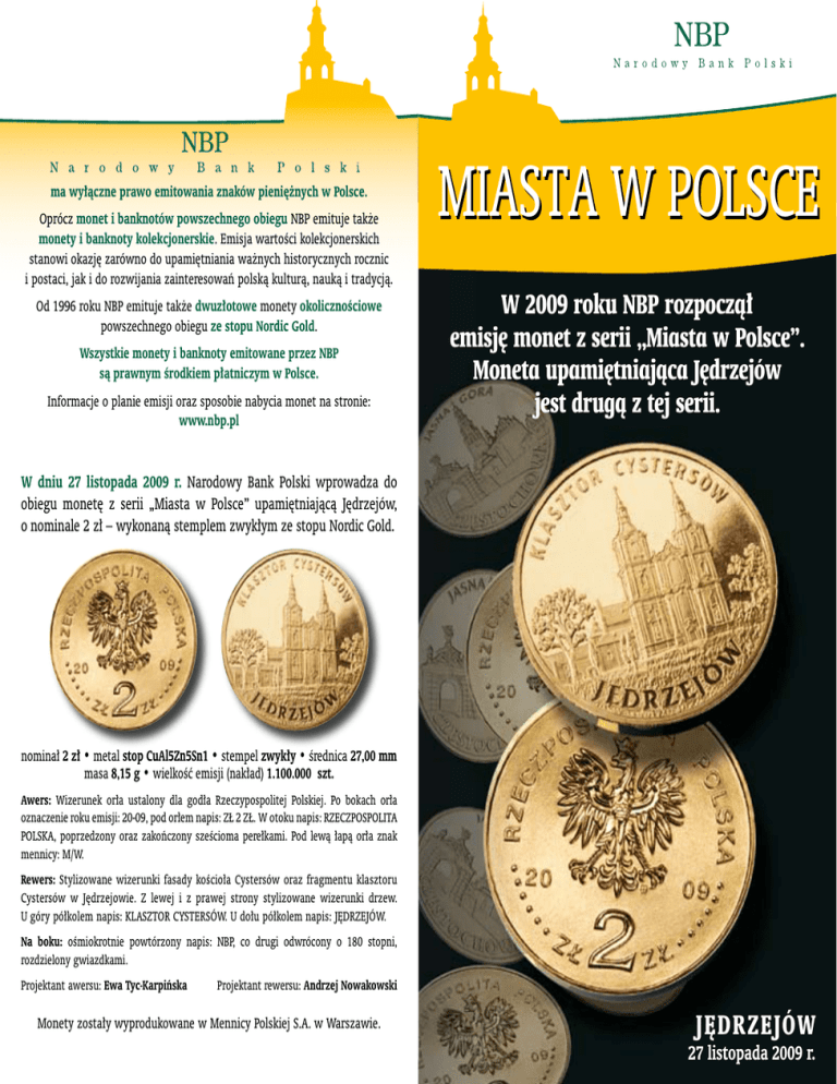 ma wyłączne prawo emitowania znaków pieniężnych w Polsce. Oprócz monet i banknotów powszechnego obiegu NBP emituje także monety i banknoty kolekcjonerskie. Emisja wartości kolekcjonerskich stanowi okazję zarówno do upamiętniania ważnych historycznych rocznic i postaci, jak i do rozwijania zainteresowań polską kulturą, nauką i tradycją. Od 1996 roku NBP emituje także dwuzłotowe monety okolicznościowe powszechnego obiegu ze stopu Nordic Gold. Wszystkie monety i banknoty emitowane przez NBP są prawnym środkiem płatniczym w Polsce. Informacje o planie emisji oraz sposobie nabycia monet na stronie: www.nbp.pl MIASTA W POLSCE W 2009 roku NBP rozpoczà∏ emisj´ monet z serii „Miasta w Polsce”. Moneta upami´tniajàca J´drzejów jest drugà z tej serii. W dniu 27 listopada 2009 r. Narodowy Bank Polski wprowadza do obiegu monetę z serii „Miasta w Polsce” upamiętniającą Jędrzejów, o nominale 2 zł – wykonaną stemplem zwykłym ze stopu Nordic Gold. nominał 2 zł • metal stop CuAl5Zn5Sn1 • stempel zwykły • średnica 27,00 mm masa 8,15 g • wielkość emisji (nakład) 1.100.000 szt. Awers: Wizerunek orła ustalony dla godła Rzeczypospolitej Polskiej. Po bokach orła oznaczenie roku emisji: 20-09, pod orłem napis: ZŁ 2 ZŁ. W otoku napis: RZECZPOSPOLITA POLSKA, poprzedzony oraz zakończony sześcioma perełkami. Pod lewą łapą orła znak mennicy: M/W. Rewers: Stylizowane wizerunki fasady kościoła Cystersów oraz fragmentu klasztoru Cystersów w Jędrzejowie. Z lewej i z prawej strony stylizowane wizerunki drzew. U góry półkolem napis: KLASZTOR CYSTERSÓW. U dołu półkolem napis: JĘDRZEJÓW. Na boku: ośmiokrotnie powtórzony napis: NBP, co drugi odwrócony o 180 stopni, rozdzielony gwiazdkami. Projektant awersu: Ewa Tyc-Karpińska Projektant rewersu: Andrzej Nowakowski Monety zostały wyprodukowane w Mennicy Polskiej S.A. w Warszawie. J¢DRZEJÓW 27 listopada 2009 r. Jędrzejów Jędrzejów Początki Jędrzejowa wiążą się z rodem Jaksów-Gryfitów, który w początkach XII w. w Brzeźnicy wzniósł kościół pod wezwaniem św. Wojciecha. Następnie możni przedstawiciele rodu w osobach kanonika krakowskiego Janika Jaksy, późniejszego biskupa wrocławskiego i arcybiskupa gnieźnieńskiego, oraz jego brata, Klemensa, palatyna krakowskiego, ufundowali w tej miejscowości pierwszy na ziemiach polskich klasztor Cystersów. W 1140 r. rozpoczął się proces fundacyjny, a między rokiem 1147 a 1153 przybył z Francji konwent cystersów i nadał nowej filii szczytną nazwę Morimondus Minor (Morimond Mniejszy) dla podkreślenia związku z macierzą w Morimond we Francji. Konstrukcja instrumentu jest nietypowa, bowiem kute w brązie klucze rejestrowe nie mają odpowiednika w całej Europie. Wczesnobarokowe organy wykonane w latach 1745–1754 wraz z XVIII-wieczną bazyliką cysterskiego klasztoru przydają koncertom wyjątkowego nastroju. Misją klasztoru była chrystianizacja Europy. Przez pierwsze 200 lat funkcjonowania konwent składał się wyłącznie z mnichów z Francji. Wyjątkiem było przyjęcie do zakonu w 1218 r. Wincentego zwanego Kadłubkiem, który porzuciwszy krakowski urząd biskupi w zaciszu jędrzejowskiego klasztoru spędził ostatnie pięć lat życia. Była to postać niezwykła, wybitny erudyta i humanista, który dzięki studiom w Paryżu i Bolonii zdobył najwyższe możliwe wówczas wykształcenie. Dowodzi tego Mistrz Wincenty na kartach swego dzieła Kroniki Polskiej (łac. Chronica Polonorum), która jest świadectwem przeniesienia do Polski przełomu XII i XIII w. tradycji prawa rzymskiego i kanonicznego oraz odkrytych na nowo wartości literatury antycznej. W dziale zegarów słonecznych muzeum obejrzeć można wszystkie ich rodzaje konstruowane od XV w. oraz rozmaite przyrządy służące do pomiaru czasu – klepsydry, zegary ogniowe i mechaniczne, a także przyrządy astronomiczne. Ozdobą kolekcji jest zegar słoneczny – dzieło Erazma Habermela oraz zegar słoneczny z armatką, według tradycji własność Stanisława Leszczyńskiego. Na przełomie 1166 i 1167 r. z okazji konsekracji kościoła klasztornego odbył się wielki zjazd książąt i możnowładztwa. W tym czasie osadę nazywano Jędrzejowem. 16 II 1271 r. książę Bolesław Wstydliwy nadał cystersom przywilej dający prawo lokacji miasta na prawie magdeburskim. W XV i XVI w. królowie Polski rozszerzali przywileje miasta, nadając mu m.in. prawo organizowania jarmarków i targów. Wnętrze jędrzejowskiego klasztoru zdobi wspaniały prospekt organowy. O wyjątkowości klasztornego instrumentu można się przekonać w miesiącach wakacyjnych, kiedy to 42-głosowe organy rozbrzmiewają pełnią swej mocy. Dzieje się tak za sprawą artystów koncertujących podczas letniego Festiwalu Muzyki Organowej i Kameralnej. W dwóch odrestaurowanych kamienicach południowej pierzei Rynku znajduje się państwowe Muzeum im. Przypkowskich. Twórcą trzonu kolekcji dzisiejszego muzeum był Feliks Przypkowski (1872–1951). Miłośnik astronomii i gnomoniki, od roku 1895 konsekwentnie gromadził zegary słoneczne i literaturę dotyczącą ich budowy i historii. W dziale starodruków, liczącym około 600 tomów, wśród których najcenniejsze jest wydanie z roku 1566 dzieła Kopernika De revolutionimbus orbium coelestium, znajdują się egzemplarze z autografami Heweliusza, Kartezjusza i Huyghensa. Część księgozbioru poświęcona gnomonice uznawana jest za jeden z najcenniejszych zespołów tego typu na świecie. Ważnym okresem w historii jędrzejowskiego domu Przypkowskich były lata I wojny światowej. W sierpniu 1914 r. przyjmowano w nim strzelców z I Kompanii Kadrowej, zaś w 1915 r. stacjonował tam Józef Piłsudski ze swoim sztabem. Pozostały po nich liczne pamiątki, listy z frontu i podziękowania za serdeczną gościnność. Jędrzejów jest ważnym ośrodkiem administracyjnym – od początku XIX w. jest siedzibą powiatu. Obecnie w sk