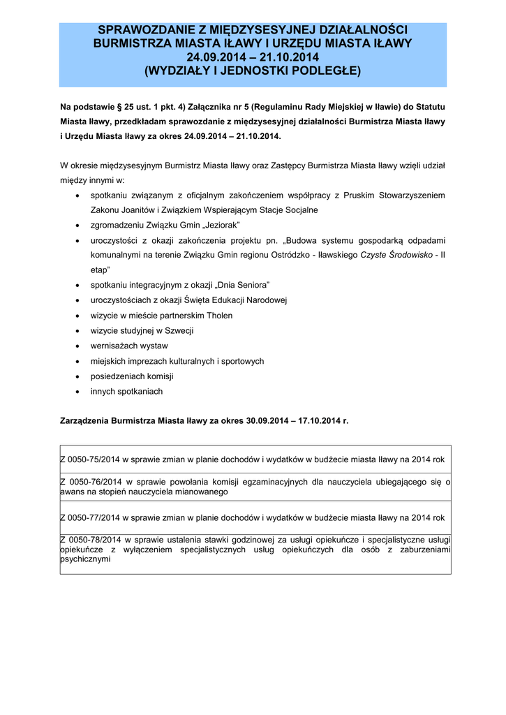 SPRAWOZDANIE Z MIĘDZYSESYJNEJ DZIAŁALNOŚCI BURMISTRZA MIASTA IŁAWY I URZĘDU MIASTA IŁAWY 24.09.2014 – 21.10.2014 (WYDZIAŁY I JEDNOSTKI PODLEGŁE) Na podstawie § 25 ust. 1 pkt. 4) Załącznika nr 5 (Regulaminu Rady Miejskiej w Iławie) do Statutu Miasta Iławy, przedkładam sprawozdanie z międzysesyjnej działalności Burmistrza Miasta Iławy i Urzędu Miasta Iławy za okres 24.09.2014 – 21.10.2014. W okresie międzysesyjnym Burmistrz Miasta Iławy oraz Zastępcy Burmistrza Miasta Iławy wzięli udział między innymi w: spotkaniu związanym z oficjalnym zakończeniem współpracy z Pruskim Stowarzyszeniem Zakonu Joanitów i Związkiem Wspierającym Stacje Socjalne zgromadzeniu Związku Gmin „Jeziorak” uroczystości z okazji zakończenia projektu pn. „Budowa systemu gospodarką odpadami komunalnymi na terenie Związku Gmin regionu Ostródzko - Iławskiego Czyste Środowisko - II etap” spotkaniu integracyjnym z okazji „Dnia Seniora” uroczystościach z okazji Święta Edukacji Narodowej wizycie w mieście partnerskim Tholen wizycie studyjnej w Szwecji wernisażach wystaw miejskich imprezach kulturalnych i sportowych posiedzeniach komisji innych spotkaniach Zarządzenia Burmistrza Miasta Iławy za okres 30.09.2014 – 17.10.2014 r. Z 0050-75/2014 w sprawie zmian w planie dochodów i wydatków w budżecie miasta Iławy na 2014 rok Z 0050-76/2014 w sprawie powołania komisji egzaminacyjnych dla nauczyciela ubiegającego się o awans na stopień nauczyciela mianowanego Z 0050-77/2014 w sprawie zmian w planie dochodów i wydatków w budżecie miasta Iławy na 2014 rok Z 0050-78/2014 w sprawie ustalenia stawki godzinowej za usługi opiekuńcze i specjalistyczne usługi opiekuńcze z wyłączeniem specjalistycznych usług opiekuńczych dla osób z zaburzeniami psychicznymi Zamówienie Publiczne Znak postępowania Tytuł zamówienia publicznego data data ilość status rozstrzygnięcia ogłoszenia ofert zamówienia /unieważnienia wyłoniony wykonawca oferowana cena za wykonanie zamówienia 19.09.2014 2 06.10.2014 Przedsiębiorstw o Usług Komunalnych rozstrzygnięty „EKO” Sp. z 66.925,35 zł o.o., ul. Biskupska 7, 14200 Iława Dostawa drzew i krzewów na ZP.271.33.2014 terenie miasta Iławy wraz z 22.09.2014 nasadzeniem i pielęgnacją 3 30.09.2014 unieważniony - 7 17.10.2014 rozstrzygnięty 2 14.10.2014 - - ogłoszony - - - - ogłoszony - - 17.10.2014 - - ogłoszony - - 17.10.2014 - - ogłoszony - - Poprawa bezpieczeństwa ZP.271.32.2014 ruchu przy SSP4 - budowa zatoki postojowej ZP.271.34.2014 Budowa ulicy Poprzecznej w 29.09.2014 Iławie Dostawa drzew i krzewów na ZP.271.35.2014 terenie miasta Iławy wraz z 01.10.2014 nasadzeniem i pielęgnacją Zakup i dostawa samochodu pożarniczego wraz z 16.10.2014 wyposażeniem dla OSP w Iławie Dostawa sprzętu informatycznego dla Urzędu ZP.271.37.2014 17.10.2014 Miasta w Iławie ZP.271.36.2014 Remont dróg gruntowych na terenie miasta Iławy ZP.271.38.2014 zadanie II ZP.271.39.2014 Wykonanie, remonty i wymiana oświetlenia ulicznego na terenie miasta Iławy - REMBUD PBK Sp. z o.o., ul. 413.862,24 zł Lubawska 12, 14-200 Iława GRENEX s.c. J. cz. 1 Barański, W. 12.896,24 zł rozstrzygnięty Kurpiewski, ul. cz. 2 Podleśna 3/1, 3.870,72 zł 80-255 Gdańsk Wydział Organizacyjno-Obywatelski Biuro Rady Miejskiej: W okresie sprawozdawczym odbyły się następujące posiedzenia: • wspólne posiedzenie komisji problemowych - 24.09.2014 r. • Komisji Rewizyjnej - 15.10.2014 r. Podczas LII Sesji Rady Miejskiej z dnia 1 października 2014 roku podjęto uchwały w sprawie: LII/536/14 - uchwalenia zmiany studium uwarunkowań i kierunków zagospodarowania przestrzennego miasta Iławy LII/537/14 - zmian w wieloletniej prognozie finansowej na lata 2014-29 LII/52838/14 - zmian w budżecie miasta na 2014 LII/539/14 - zaliczenia ulic do kategorii dróg gminnych w mieście Iława LII/540/14 - nabycia prawa własności nieruchomości położonych przy ulicy Zielonej i Odnowiciela LII/541/14 - zmian w Miejskim Programie Profilaktyki i Rozwiązywania Problemów Alkoholowych na 2014 rok LII/542/14 - rozpatrzenia skargi na bezczynność LII/543/14 - rozpatrzenia skargi na działalność MOPS Wydział Planowania, Inwestycji i Monitoringu 1. W dniu 25.09.2014 r. odbyła się kontrola Państwowej Inspekcji Pracy w obiekcie ekologicznej mini przystani żeglarskiej nad jeziorem Jeziorak w Iławie w celu wydania uproszczonych świadectw zdolności żeglugowej dla pomostu pływającego. 2. W dniu 30.09.2014 r. odbyło się podpisanie umowy finansowej na realizację projektu pt. „Poprawa bezpieczeństwa ekologicznego poprzez wyposażenie OSP w samochód ratownictwa ekologicznego w Iławie”. Wartość całkowita umowy: 918.280 zł, w tym dotacja UE 734.624 zł. 3. W dniu 30.09.2014 r. przekazano zamawiającemu dokumentację projektową na wykonanie modernizacji plaży miejskiej przy ul. Kajki wraz z budową nowego pomostu. Wystąpiono również do Regionalnego Zarządu Gospodarki Wodnej w Gdańsku o zawarcie umowy na użytkowanie gruntów pokrytych wodami. 4. W dniu 01.10.2014 r. podpisano umowę z Wielobranżowym Zakładem UsługowoProdukcyjnym i Handlowym „Spomer” Sp. z o.o. Iława ul. Biskupska na budowę łącznika ul. Bydgoskiej. Termin realizacji zadania do 30.07.2015 r. za kwotę 229.692,00 zł. 5. W dniu 02.10.2014 r. otwarto oferty na zakup i dostawę samochodu OSP – wartość oferty przekroczyła możliwości budżetowe. Postępowanie unieważniono. 6. W dniu 02.10.2014 r. zawarto umowę z firmą AREA PROJEKT z Gdańska na opracowanie Programu Funkcjonalno-Użytkowego oraz Studium Wykonalności dla I etapu zaprojektowania i budowy kompleksu rekreacyjno-sportowego przy ul. Sienkiewicza w Iławie. Etap ten obejmuje lodowisko, płytę boczną boiska piłkarskiego z naturalnej murawy, ściankę wspinaczkową, skate park, siłownię zewnętrzną oraz park linowy. Dokumenty przygotowywane są na konkurs, którego ogłoszenie spodziewane 