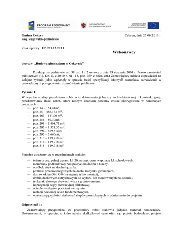 Gmina Cekcyn woj. kujawsko-pomorskie Cekcyn, dnia 27.09.2011r. Znak sprawy: EP.271.12.2011 Wykonawcy dotyczy: „Budowa gimnazjum w Cekcynie” Działając na podstawie art. 38 ust. 1 i 2 ustawy z dnia 29 stycznia 2004 r. Prawo zamówień publicznych (t.j. Dz. U. z 2010 r. Nr 113, poz. 759 z późn. zm.) Zamawiający udziela odpowiedzi na kolejne pytania, jakie wpłynęły w sprawie treści specyfikacji istotnych warunków zamówienia w prowadzonym postępowaniu o zamówienie publiczne: Pytanie 1: W wyniku analizy przedmiaru robót oraz dokumentacji branży architektonicznej i konstrukcyjnej, przedstawiamy ilości robót, które naszym zdaniem powinny zostać skorygowane w poniższych pozycjach: — poz. 14 – 154,44m², — poz. 25 – 488,133 m², — poz. 163 – 141,00 m², — poz. 256 – 89,30mb, — poz. 291 – 1.408,73 m², — poz. 292 – 1.321,35 m², — poz. 294 – 879,51mb, — poz. 295 – 5.660szt, — poz. 313 – 119,718 m², — poz. 314 – 119,718 m², — poz. 315 – 119,718 m². Ponadto uważamy, że w przedmiarach brakuje: — — — — — — — — — — — ściany z ceg. pełnej ceram. kl. 20, na zap. cem. wap. przy kl. schodowych, membrany podkładowej pod pokryciem dachu z blachy, obróbek attyk na dachu łącznika, płotków przeciwśniegowych na dachu budynku gimnazjum, dostaw okien O6 i O9 (występuje tylko montaż), drabin dachowych (strychowych do wyłazu lub montowanych na ścianie), tynku akrylowego elewacji wraz z gruntowaniem, impregnacji cegły elewacyjnej silikatowej, ocieplenia słupów podcieni wełną min., izolacji poziomej ścian fundamentowych, wystarczającej ilości deskowań słupów prostokątnych w odniesieniu do projektu. Odpowiedź 1: Zamawiający przypomina, że przedmiary robót stanowią jedynie materiał pomocniczy. Dokumentami, w oparciu, o które należy skalkulować cenę ofert są: projekt budowlany, projekt wykonawczy, STWiORB oraz SIWZ wraz z wyjaśnieniami, a także zebranie Wykonawców, które odbyło się 13.09.2011r. w Urzędzie Gminy w Cekcynie. Niemniej Zamawiający, po uzyskaniu stanowiska Jednostki Projektowej, udziela następujących wyjaśnień: — poz.14 deskowanie stop fundam. przedmiar m2 116,79 powinno być po przelicz.152,1 m2 błąd rachunkowy. — poz.25 dot. izolacji poziomej ścian fundam.2xpapa asfalt. przedmiar m2 43,927 po przelicz. powinno być 183,02 m2.błąd rachunkowy. — poz.163 dot. obrobek blacharskich z blachy oc. powlek przedmiar m2 70,51 po przeliczeniu Należy doliczyć 63,47 m2 razem stanowi 133,97 m2 — poz.256 dotyczy balustrad klatek schod. bocznych, głównych i poziomu +4,10 wypełnione siatkami zgrzewanymi z pochwytem stal nieraz. przedmiar m 53,60, oraz w poz.260 stanowią balustrady typ balkonowy wypełnione szkłem hartowanym z pochwytem stal nierdzewna przedmiar stanowi m 50,70. Uważam ze nie popełniono błędu. Ilości zgodne z dokumentacją. — poz.291 dotyczy przyklejenia płyt styrop.gr.12 cm przedmiar stanowi m2 992,68 po przel. obmiar wynosi 1394,29 m2 błąd obmiarowy. — poz.292 dotyczy przyklejenia siatki z włókna na zaprawie klejowej, przedmiar stanowi m2 1091,95 powinno być 1394,29 m2 błąd obmiarowy. — poz.294 dotyczy ochrony narożników przedmiar stanowi m 803,3 powinno być 883,3 mb — poz.295 dotyczy mocowania styropianu, przedmiar stanowi szt.993 powinno być 1394,29 x 4szt/m2 = 5577 szt — poz.313 dotyczy przyklejenia płyt z wełny mineralnej gr.12 cm przedmiar stanowi 97,27 m2 powinno być 113,24 m2. — poz.314 dotyczy okładzin z bloków silka na wełnie mineralnej gr.12 cm przedmiar stanowi 97,27 m2 powinno być 113,24 m2. — poz.315 dotyczy mocowania – kotwienia do ścian okładzin ściennych przedmiar stanowi m2 97,27,powinno być 113,24 m2. W odpowiedzi na zapytania dotyczące brakujących przedmiarów Zamawiający wyjaśnia: — Ściany z cegły pełnej ceramicznej kl. 20 na zaprawie cem. - wap. przy kl. schod. faktycznie zostały pominięte – należy je doliczyć w ilości (1,8+3,3+1,4+1,0)*2,40*2= 36,0 m2 — Membrana podkładowa pod pokryciem dachu z blachy – występuje w poz.159 w analogii pod nazwą folia zbrojona paroszczelna w ilości 1484,28*1,1=1632,71 m2. — Obróbki attyk na dachu łącznika – ujęto w poz.163 — Płotki przeciwśniegowe na dachu bud. gimnazjum – po wyjaśnieniu z autorami projektu Występują tylko w środkowej części bud /najwyższej/ po obu stronach spadkowych przed rynną dachową na całej dług.tj.31,40*2 = 62,80 mb + nad oknami dachowymi po 1,70x13= 22,10 mb Ogółem 84,9 mb co należy doliczyć. — Dostawa okien typ.06+09 występują w przedmiarze w poz.192 należy je doliczyć również jako materiał w ilości typ.06 szt.13+ typ.09 szt. 2 — Dotyczy drabin dachowych strychowych do wyłazu- po wyjaśnieniu z autorami projektu należy doliczyć 2 szt. drabin wewnętrznych strychowych składanych dług.2,5 m alum. przenośne — Dotyczy tynku akrylowego elewacji wraz zagruntowaniem należy doliczyć w ilości jak w poz.291 w ilości 1394,29 m2.Natomiast należy skreślić poz.311 malowanie farbą silikatową elewacji w ilości 923,03 m2. — Dotyczy impregnacji cegły silikatowej obmiar z poz.313 m2 113,24 po wyjaśnieniu autorami projektu należy zaimpregnować preparatami na bazie szkła wodnego np. SARSIL H14,AHYDROSIL K, lub równoważny. — Dotyczy ocieplenia słupów podcieni wełną mineralną należy doliczyć zgodnie z rys.D7 — Dotyczy izolacji poziomej ścian fundamentowych ujęto w poz.25 w pierwszej części wyjaśnień gdzie obmiar został poprawiony. — Dotyczy wystarczającej ilości deskowań słupów prostokątnych w odniesieniu do projektu. Do każdego rodzaju słupów prostokątnych zgodnie z normą w KNR ilość deskowania policzono — Zgodnie z dodatkowym opracowaniem środkowej części rzutu dachowego należy doliczyć 2 szt. drabinek zejściowych na powierzchnie dachowe niżej położone z lewej i prawej strony wymiary drabinek szer.50 cm, wys.90 cm