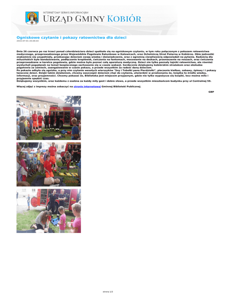 Ogniskowe czytanie i pokazy ratownictwa dla dzieci 2015-07-01 20:48:44 Dnia 26 czerwca po raz trzeci ponad czterdzieścioro dzieci spotkało się na ogniskowym czytaniu, w tym roku połączonym z pokazem ratownictwa medycznego, przeprowadzonego przez Wojewódzkie Pogotowie Ratunkowe w Katowicach, oraz Ochotniczą Straż Pożarną w Kobiórze. Obie jednostki znakomicie się uzupełniały, przekazując dzieciom swoją wiedzę i doświadczenie, oraz z ogromną cierpliwością odpowiadali na pytania. Radością dla milusińskich było bandażowanie, podłączanie kroplówek, ćwiczenia na fantomach, mocowanie na deskach, przenoszenie na noszach, oraz ćwiczenia przeprowadzane w karetce pogotowia, gdzie można było poznać całą aparaturę medyczną. Dzieci nie tylko poznały tajniki ratownictwa, ale również wysłuchali pogadanek na temat bezpiecznego zachowanie się w czasie wakacji. Serdecznie dziękujemy kobiórskim strażakom oraz obsłudze pogotowia za uśmiech, zaangażowanie w czasie pokazu, a przede wszystkim za radość daną dzieciom. Po pokazie odbyło się ognisko, a przy nim czytanie wesołych wierszyków "Sny i Tobołki pana Pierdziołki", pieczenie kiełbas, zabawy, śpiewy i i pokazy taneczne dzieci. Dzięki takim działaniom, chcemy zaszczepić dzieciom chęć do czytania, utwierdzić w przekonaniu że, książka to żródło wiedzy, informacji, oraz przyjemności. Chcemy pokazać że, Biblioteka jest miejscem przyjaznym, gdzie nie tylko wypożycza się książki, lecz można miło i przyjemnie spędzić czas. Dziękujemy wszystkim, oraz każdemu z osobna za każdy miły gest i dobre słowo, a przede wszystkim mieszkańcom budynku przy ul Centralnej 59. Więcej zdjęć z imprezy można zobaczyć na stronie internetowej Gminnej Biblioteki Publicznej. GBP strona 1/3 strona 2/3 Dziękujemy za odwiedziny i zapraszamy ponownie bezpośredni link do strony www strona 3/3 Powered by TCPDF (www.tcpdf.org)