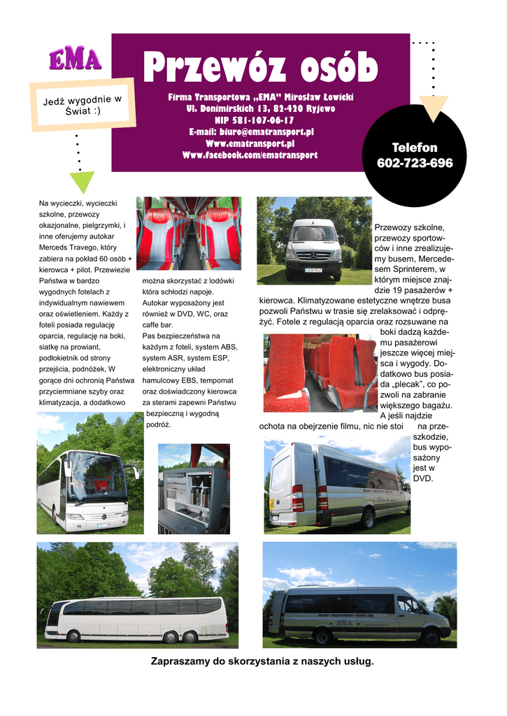 Przewóz osób Firma Transportowa „EMA” Mirosław Łowicki Ul. Donimirskich 13, 82-420 Ryjewo NIP 581-107-06-17 E-mail: [email protected] Www.ematransport.pl Www.facebook.com/ematransport Telefon 602-723-696 Na wycieczki, wycieczki szkolne, przewozy okazjonalne, pielgrzymki, i inne oferujemy autokar Merceds Travego, który zabiera na pokład 60 osób + kierowca + pilot. Przewiezie Państwa w bardzo można skorzystać z lodówki wygodnych fotelach z która schłodzi napoje. indywidualnym nawiewem Autokar wyposażony jest oraz oświetleniem. Każdy z foteli posiada regulację również w DVD, WC, oraz caffe bar. oparcia, regulację na boki, Pas bezpieczeństwa na siatkę na prowiant, podłokietnik od strony każdym z foteli, system ABS, system ASR, system ESP, przejścia, podnóżek, W elektroniczny układ gorące dni ochronią Państwa przyciemniane szyby oraz hamulcowy EBS, tempomat oraz doświadczony kierowca klimatyzacja, a dodatkowo za sterami zapewni Państwu bezpieczną i wygodną podróż. Przewozy szkolne, przewozy sportowców i inne zrealizujemy busem, Mercedesem Sprinterem, w którym miejsce znajdzie 19 pasażerów + kierowca. Klimatyzowane estetyczne wnętrze busa pozwoli Państwu w trasie się zrelaksować i odprężyć. Fotele z regulacją oparcia oraz rozsuwane na boki dadzą każdemu pasażerowi jeszcze więcej miejsca i wygody. Dodatkowo bus posiada „plecak”, co pozwoli na zabranie większego bagażu. A jeśli najdzie ochota na obejrzenie filmu, nic nie stoi na przeszkodzie, bus wyposażony jest w DVD. Zapraszamy do skorzystania z naszych usług.
