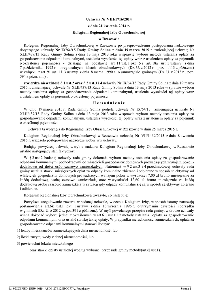 Uchwała Nr VIII/1716/2014 z dnia 21 kwietnia 2014 r. Kolegium Regionalnej Izby Obrachunkowej w Rzeszowie Kolegium Regionalnej Izby Obrachunkowej w Rzeszowie po przeprowadzeniu postępowania nadzorczego dotyczącego uchwały Nr IX/64/15 Rady Gminy Solina z dnia 19 marca 2015 r. zmieniającej uchwałę Nr XLII/437/13 Rady Gminy Solina z dnia 13 maja 2013 roku w sprawie wyboru metody ustalania opłaty za gospodarowanie odpadami komunalnymi, ustalenia wysokości tej opłaty wraz z ustaleniem opłaty za pojemnik o określonej pojemności - działając na podstawie art. 11 ust. 1 pkt 5 i art. 18a ust. 3 ustawy z dnia 7 października 1992 r. o regionalnych izbach obrachunkowych (Dz. U. z 2012 r. poz. 1113 z późn.zm.) w związku z art. 91 ust. 1 i 3 ustawy z dnia 8 marca 1990 r. o samorządzie gminnym (Dz. U. z 2013 r., poz. 594 z późn. zm.) : stwierdza nieważność § 1 ust.2 oraz § 2 ust.3 i 4 uchwały Nr IX/64/15 Rady Gminy Solina z dnia 19 marca 2015 r. zmieniającej uchwałę Nr XLII/437/13 Rady Gminy Solina z dnia 13 maja 2013 roku w sprawie wyboru metody ustalania opłaty za gospodarowanie odpadami komunalnymi, ustalenia wysokości tej opłaty wraz z ustaleniem opłaty za pojemnik o określonej pojemności. U z as a d n i e n i e W dniu 19 marca 2015 r. Rada Gminy Solina podjęła uchwałę Nr IX/64/15 zmieniającą uchwałę Nr XLII/437/13 Rady Gminy Solina z dnia 13 maja 2013 roku w sprawie wyboru metody ustalania opłaty za gospodarowanie odpadami komunalnymi, ustalenia wysokości tej opłaty wraz z ustaleniem opłaty za pojemnik o określonej pojemności. Uchwała ta wpłynęła do Regionalnej Izby Obrachunkowej w Rzeszowie w dniu 25 marca 2015 r. Kolegium Regionalnej Izby Obrachunkowej w Rzeszowie uchwałą Nr VII/1469/2015 z dnia 8 kwietnia 2015 r. wszczęło postępowanie nadzorcze wobec ww uchwały. Badając powyższą uchwałę w trybie nadzoru Kolegium Regionalnej Izby Obrachunkowej w Rzeszowie ustaliło następujący stan faktyczny: W § 2 ust.2 badanej uchwały rada gminy dokonała wyboru metody ustalenia opłaty za gospodarowanie odpadami komunalnymi pochodzącymi od właścicieli gospodarstw domowych prowadzących wynajem pokoi dodatkowo od ilości osób czasowo zamieszkałych. Natomiast w § 2 ust.3 i 4 przedmiotowej uchwały rada gminy ustaliła stawki miesięcznych opłat za odpady komunalne zbierane i odbierane w sposób selektywny od właścicieli gospodarstw domowych prowadzących wynajem pokoi w wysokości 7,00 zł brutto miesięcznie za każdą dodatkową osobę czasowo zamieszkałą oraz w wysokości 12,60 zł brutto miesięcznie za każdą dodatkową osobę czasowo zamieszkałą w sytuacji gdy odpady komunalne się są w sposób selektywny zbierane i odbierane. Kolegium Regionalnej Izby Obrachunkowej zważyło, co następuje: Powyższe uregulowanie zawarte w badanej uchwale, w ocenie Kolegium Izby, w sposób istotny naruszają postanowienia art.6k ust.1 pkt 1 ustawy z dnia 13 września 1996 r. o utrzymaniu czystości i porządku w gminach (Dz. U. z 2012 r., poz.391 z późn.zm.). W myśl powołanego przepisu rada gminy, w drodze uchwały winna dokonać wyboru jednej z określonych w art.6 j ust.1 i 2 metody ustalania opłaty za gospodarowanie odpadami komunalnymi oraz ustalić stawkę takiej opłaty. W przypadku nieruchomości zamieszkałych, opłata za gospodarowanie odpadami komunalnymi stanowi iloczyn: 1) liczby mieszkańców zamieszkujących dana nieruchomość, lub 2) ilości zużytej wody z danej nieruchomości, lub 3) powierzchni lokalu mieszkalnego oraz stawki opłaty ustalonej według wybranej przez rade gminy metody(art.6j ust.1). Id: 928C9FBD-1EE9-40B4-A8D6-27E124BCC77A. Podpisany Strona 1 W przypadku nieruchomości, o których mowa w art. 6c ust.1 ustawy, rada gminy może ustalić jedną stawkę opłaty za gospodarowanie odpadami komunalnymi od gospodarstwa domowego. Jednocześnie ustawodawca dopuszcza stosowanie więcej niż jednej metody ustalania opłaty na obszarze gminy. Wśród wskazanych powyżej ustawowych metod ustalania opłaty za gospodarowanie odpadami komunalnymi nie ma metody polegającej na ustaleniu opłaty od właścicieli gospodarstw domowych prowadzących wynajem pokoi - dodatkowo od ilości osób czasowo zamieszkałych, jaką wprowadziła Rada Gminy Solina. Nie można też w ocenie Kolegium Izby, utożsamiać wprowadzonej powyżej metody ustalania opłaty za gospodarowanie odpadami komunalnymi z opłatą, jaką rada gminy może uchwalić od gospodarstwa domowego w oparciu o przepis art. 6 j ust.2 ustawy o utrzymaniu czystości i porządku w gminach. Kolegium Izby wskazuje ponadto, iż stosownie do art.40 ust.1 ustawy o samorządzie gminnym oraz art. 94 Konstytucji RP akty prawa miejscowego, a takim jest badana uchwała, ustanawiane są na podstawie i w granicach upoważnień ustawowych. Organ wykonujący kompetencję prawodawczą zawartą w upoważnieniu ustawowym a więc również organ stanowiący jednostki samorządu terytorialnego jest obowiązany działać ściśle w granicach tego upoważnienia. Nie jest on uprawniony ani do regulowania bądź modyfikowania tego, co zostało już ustawowo określone, ani też do wychodzenia poza zakres upoważnienia ustawowego. Każde działanie organu władzy, w tym także rady gminy musi mieć oparcie w obowiązującym prawie. Badana uchwała zadaniem Kolegium Izby tych wymogów nie spełnia. Rada Gminy Solina podejmując przedmiotową uchwałę o zmianie uchwały Nr IX/64/2013 Rady Gminy Solina z dnia 13 maja 2013 roku w ocenie Kolegium Izby dokonała wyboru metody ustalenia opłaty za gospodarowanie odpadami komunalnymi i ustaliła stawki tej opłaty wychodząc poza zakres upoważnienia ustawowego wynikającego z dyspozycji art. 6k ust.1 pkt 1 ustawy o utrzymaniu czystości i porządku w gminach. Z tych przyczyn stwierdzono nieważność wskazanych w sentencji postanowień uchwały Rady Gminy Solina. Na niniejszą uchwałę Gminie przysługuje prawo wniesienia skargi do Wojewódzkieg