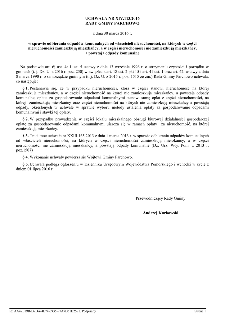 UCHWAŁA NR XIV.113.2016 RADY GMINY PARCHOWO z dnia 30 marca 2016 r. w sprawie odbierania odpadów komunalnych od właścicieli nieruchomości, na których w części nieruchomości zamieszkują mieszkańcy, a w części nieruchomości nie zamieszkują mieszkańcy, a powstają odpady komunalne Na podstawie art. 6j ust. 4a i ust. 5 ustawy z dnia 13 września 1996 r. o utrzymaniu czystości i porządku w gminach (t. j. Dz. U. z 2016 r. poz. 250) w związku z art. 18 ust. 2 pkt 15 i art. 41 ust. 1 oraz art. 42 ustawy z dnia 8 marca 1990 r. o samorządzie gminnym (t. j. Dz. U. z 2015 r. poz. 1515 ze zm.) Rada Gminy Parchowo uchwala, co następuje: § 1. Postanawia się, że w przypadku nieruchomości, która w części stanowi nieruchomość na której zamieszkują mieszkańcy, a w części nieruchomość na której nie zamieszkują mieszkańcy, a powstają odpady komunalne, opłata za gospodarowanie odpadami komunalnymi stanowi sumę opłat z części nieruchomości, na której zamieszkują mieszkańcy oraz części nieruchomości na których nie zamieszkują mieszkańcy a powstają odpady, określonych w uchwale w sprawie wyboru metody ustalenia opłaty za gospodarowanie odpadami komunalnymi i stawki tej opłaty. § 2. W przypadku prowadzenia w części lokalu mieszkalnego obsługi biurowej działalności gospodarczej opłatę za gospodarowanie odpadami komunalnymi uiszcza się w ramach opłaty za nieruchomość, na której zamieszkują mieszkańcy. § 3. Traci moc uchwała nr XXIII.165.2013 z dnia 1 marca 2013 r. w sprawie odbierania odpadów komunalnych od właścicieli nieruchomości, na których w części nieruchomości zamieszkują mieszkańcy, a w części nieruchomości nie zamieszkują mieszkańcy, a powstają odpady komunalne (Dz. Urz. Woj. Pom. z 2013 r. poz.1507) § 4. Wykonanie uchwały powierza się Wójtowi Gminy Parchowo. § 5. Uchwała podlega ogłoszeniu w Dzienniku Urzędowym Województwa Pomorskiego i wchodzi w życie z dniem 01 lipca 2016 r. Przewodniczący Rady Gminy Andrzej Kurkowski Id: AA47E19B-D7DA-4E74-8935-97A9D51B2571. Podpisany Strona 1 Uzasadnienie Rada Gminy Parchowo podjęła uchwałę nr XXIII.165.2013 z dnia 01 marca 2013 r. w sprawie odbierania odpadów komunalnych od właścicieli nieruchomości, na których w części nieruchomości zamieszkują mieszkańcy, a w części nieruchomości nie zamieszkują mieszkańcy, a powstają odpady komunalne. W związku z wejściem w życie w dniu 1 lutego 2015 r. ustawy z dnia 28 listopada 2014 r.o zmianie ustawy o utrzymaniu czystości i porządku w gminach, która wprowadziła m.in. w art. 6j ust. 4a mówiący, że w przypadku prowadzenia w części lokalu mieszkalnego obsługi biurowej działalności gospodarczej opłatę za gospodarowanie odpadami komunalnymi uiszcza się w ramach opłaty za nieruchomość, na której zamieszkują mieszkańcy. Id: AA47E19B-D7DA-4E74-8935-97A9D51B2571. Podpisany Strona 1