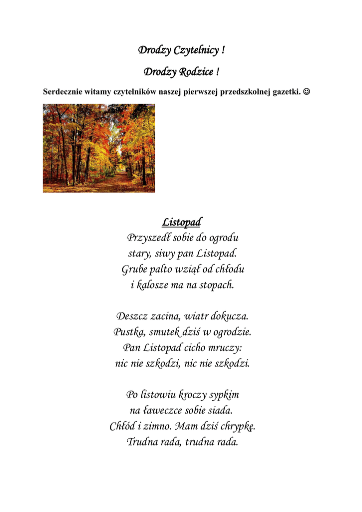 Drodzy Czytelnicy ! Drodzy Rodzice ! Serdecznie witamy czytelników naszej pierwszej przedszkolnej gazetki. Listopad Przyszedł sobie do ogrodu stary, siwy pan Listopad. Grube palto wziął od chłodu i kalosze ma na stopach. Deszcz zacina, wiatr dokucza. Pustka, smutek dziś w ogrodzie. Pan Listopad cicho mruczy: nic nie szkodzi, nic nie szkodzi. Po listowiu kroczy sypkim na ławeczce sobie siada. Chłód i zimno. Mam dziś chrypkę. Trudna rada, trudna rada. Jesień – to okres, kiedy dzieci spędzają wiele czasu w domu i trzeba je jakoś zająd, aby nie stały się tylko biernymi odbiorcami programów telewizyjnych. W listopadowe dni, kiedy wcześnie zapada zmierzch, łatwo można zaobserwowad różne cienie na tle ściany. Niektóre robimy specjalnie. Na przykład zabawne cienie złożonych dłoni. *Można też zaproponować rysowanie portretu na podstawie cienia. Przypinamy arkusz papieru na stelażu lub tablicy. Jedno dziecko oświetlone lampą siada na krześle, drugie obrysowuje jego profil. Pozostaje dorysowanie wielu szczegółów, co może być wesołą zabawą. Propozycja innej zabawy : *Jesienne chłody wymagają zupełnie innego ubrania. To dobra okazja do wprowadzania pojęcia para – para butów, para rękawiczek i wielu zabaw obrazkami, które wyrabiają sprawność ręki i spostrzegawczość, na przykład : spośród wielu rękawiczek „dobierz pary”, „uporządkuj różne rodzaje butów”, „wymyśl ciekawy wzór na czapkę i szalik” itp. << POCZYTAJ MI MAMO, POCZYTAJ MI TATO >> Dzieci w naszym przedszkolu bardzo lubią, gdy czytamy im bajki. Miło wspominają, gdy czyta im mama, tata, babcia, dziadek, a nawet i ciocia. Zapraszamy chętnych rodziców do głośnego czytania w przedszkolu, w grupie swojego dziecka ulubionej bajki dziecka. KORZYŚCI Z GŁOŚNEDO CZYTANIA DLA ZDROWIA EMOCJONALNEGO DZIECKA Dziecko, któremu codziennie czytamy, czuje się ważne i kochane. Buduje to jego mocne poczucie własnej wartości. Buduje mocną wieź między rodzicem i dzieckiem Więź z najbliższą osobą jest jedną z najważniejszych potrzeb rozwojowych dziecka, warunkiem, by mogło wyrosnąd na zdrowego emocjonalnie i dojrzałego człowieka. Jeżeli rodzice nie znajdą czasu dla swojego dziecka, przekładając nad jego potrzeby swą karierę, nieświadomie narażają całą jego przyszłośd. Brak więzi z rodzicami w dzieciostwie jest niemal gwarancją ogromnych życiowych problemów, natomiast mocna i zdrowa wieź z nimi daje na całe życie silny fundament oraz osłonę przed złymi wpływami. CO CZYTAĆ ? Wybierając książkę powinniśmy pamiętać o potrzebach rozwojowych i zainteresowaniach naszego dziecka. Dobrze jest wybierać opracowania zawierające tekst, który pobudza wyobraźnię dziecka z ilustracją podążającą za testem, bez rażącego narzucania się. Przede wszystkim pamiętajmy, że wybrane przez nasz książki powinny mieć żywnych bohaterów, a treścią odpowiadać możliwościom i zainteresowaniom dziecka. urodziny Urodziny urodziny !!! Sto lat będziemy śpiewać: Gr. „Jeżyki” Groszek Zuzanna Hruby Amelia Rzechaczek Weronika Samolczyk Paweł Szymkowiak Paweł Gr. „Biedronki” Małecka Kalina Walczak Joanna Gr. „Misie” Brzeski Adam Gr. „Wiewiórki” Burakiewicz Nikola Graj Marika Prokopiński Jakub Wójcik Martyna Gr. „Pszczółki” Burczak Ksawery Trymbulak- Krystianc Jakub Trudno wyobrazić sobie dzisiejszy świat bez pluszowego misia. Miś jest najlepszym przyjacielem dziecka, niezastąpioną przytulanką przy zasypianiu. Skąd się wziął miś? Oto krótka historia. Wszystko zaczęło się w 1902r, gdy Prezydent Stanów Zjednoczonych Teodor Roosvelt, wybrał się na polowanie. Po kilku godzinach bezskutecznych łowów jeden z towarzyszy prezydenta postrzelił małego niedźwiadka i zaprowadził go do Roosvelta. Prezydent, gdy ujrzał przerażone zwierzątko, natychmiast kazał go uwolnić. Jeden ze świadków tego zdarzenia uwiecznił historię niedźwiadka na rysunku w waszyngtońskiej gazecie. Obrazek natknął sklepikarza z Brooklynu do produkcji pluszowych niedźwiadków o nazwie Teddy. Miś stał się bohaterem utworów dla dzieci, z których najbardziej znanym jest Kubuś Puchatek. Miś jest towarzyszem dzieci i dorosłych w świecie beztroskiej zabawy oraz przyjacielem, powiernikiem największych sekretów i tajemnic. Światowy Dzień Pluszowego Misia jest wspaniałym pomysłem. Tego dnia zapraszamy do przedszkola każdego przedszkolaka ze swoim misiem małym lud dużym. ZAPRASZAMY DO CZĘSTEGO ZAGLĄDANIA NA STRONĘ PRZEDSZKOLA, TAM DOWIESZ SIĘ CO ROBILIŚMY I CO BĘDZIEMY ROBIĆ http://podmuchomorkiem.edupage.org