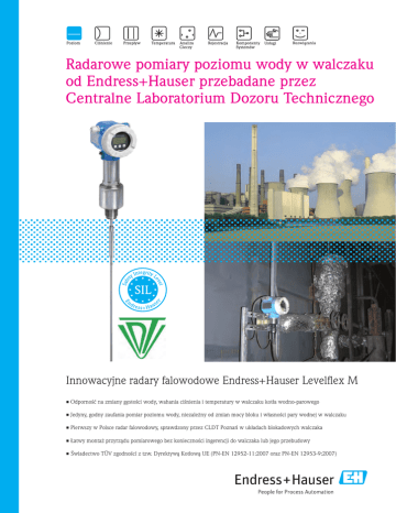 Radarowe pomiary poziomu wody w walczaku od Endress+Hauser przebadane przez Centralne Laboratorium Dozoru Technicznego Innowacyjne radary falowodowe Endress+Hauser Levelflex M •Odporność na zmiany gęstości wody, wahania ciśnienia i temperatury w walczaku kotła wodno-parowego •Jedyny, godny zaufania pomiar poziomu wody, niezależny od zmian mocy bloku i własności pary wodnej w walczaku •Pierwszy w Polsce radar falowodowy, sprawdzony przez CLDT Poznań w układach blokadowych walczaka •Łatwy montaż przyrządu pomiarowego bez konieczności ingerencji do walczaka lub jego przebudowy • Świadectwo TÜV zgodności z tzw. Dyrektywą Kotłową UE (PN-EN 12952-11:2007 oraz PN-EN 12953-9:2007) Bezpieczeństwo pracy kotła energetycznego Analiza działania obiegu wodno-parowego Woda zasilająca cyrkuluje w sposób ciągły w obiegu wodnoparowym, który stanowi podstawowy składnik instalacji w elektrociepłowni lub elektrowni. Kondensat pary wodnej jest równolegle tłoczony do walczaka przez kilka stopni podgrzewaczy, najczęściej nisko- oraz wysokociśnieniowy. W walczaku dochodzi do wytworzenia pary o wysokim ciśnieniu i temperaturze, która zasila turbinę napędzającą generator. Następnie para ulega skropleniu w kondensatorze i opisany cykl powtarza się. W turbinie energia cieplna pary przegrzanej zostaje zamieniona na energię mechaniczną, zaś w generatorze energia ta zostaje zamieniona na energię elektryczną. Bezpieczeństwo pracy kotła zależy więc od parametrów przegrzanej pary wodnej. Walczak 360 °C 192 bar Kluczowe znaczenie funkcji walczaka Zasadnicza rola walczaka polega na odpowiednim przygotowaniu pary zasilającej turbinę. Pomocniczy obieg wody w kotle, zwany naturalnym, jest bardzo wrażliwy na poziom wody w walczaku. Zbyt mała jej ilość może spowodować przepalenie parowników (ekranów) umiejscowionych ponad palnikiem kotła, które dostarczają do walczaka mieszanką parowo-wodną. Zbyt duża ilość wody spowoduje pogorszenie jakości pary podawanej na przegrzewacz, co w konsekwencji może zakończyć się uszkodzeniem turbiny i zatrzymaniem pracy generatora. Odstawienie bloku energetycznego z tym związane oznacza duże straty finansowe, jak również ogromne koszty remontu i przywrócenia bloku do ruchu. Dlatego dokładny pomiar poziomu wody w walczaku i utrzymanie go w żądanym przedziale jest jednym z podstawowych warunków bezawaryjnej pracy kotła. Około połowa większych awarii kotłów powstaje wskutek nieutrzymania poziomu wody w walczaku w odpowiednim przedziale. Przykładowy schemat bloku energetycznego i przybliżone parametry procesu Do instalacji oczyszczania spalin Kocioł wodno-parowy (energetyczny) Podgrzewacz Wtórny przegrzewacz 300 °C 30 bar 525 °C 170 bar 525 °C 25 bar 350 °C 9 bar Turbina Generator Przegrzewacz Turbina Para przegrzana zasilająca turbinę Ekrany Wymiennik podturbinowy Zasilanie cieplne miasta Palnik kotła Zbiornik wody zasilającej Podgrzewacz wysokociśnieniowy 230 °C 192 bar Podgrzewacz niskociśnieniowy Woda uzdatniona 170 °C 220 bar Pompa zasilająca kocioł wodno-parowy Klasyczne pomiary poziomu wody w walczakach Pomiary te należą do najtrudniejszych w energetyce. Ich prowadzenie komplikują warunki i zjawiska, które występują podczas eksploatacji walczaka, w tym: • duże ciśnienie statyczne • szeroki zakres zmian ciśnienia statycznego • wysoka temperatura • duże przepływy mieszanki wodno-parowej • brak wyraźnej granicy między wodą i parą Dotychczasowe doświadczenia pokazują, że najkorzystniejszą z uwagi na ciężkie warunki pracy jest metoda hydrostatyczna pomiaru poziomu w walczaku z użyciem przetworników różnicy ciśnień. Jest ona stosowana powszechnie, równolegle z wodowskazem obserwowanym za pomocą kamery. Pompa kondensatu 38 °C 11 bar Nieprawidłowy poziom wody w walczaku może być skutkiem niewłaściwej jego obsługi i błędów wprowadzanych przez układ pomiarowy, działający w oparciu o metodę hydrostatyczną. Podstawowe niedokładności pomiaru wynikają z: • błędów od niewłaściwego wykonania kondensacyjnych naczyń pomiarowych • błędów od niewłaściwego montażu układu pomiarowego • błędów wynikających z niedotrzymania warunków termicznych, zapewniających poprawną pracę naczyń kondensacyjnych • błędów od odchylenia walczaka od pozycji horyzontalnej • dużych wahań ciśnienia statycznego • występowania zjawisk przepływowych i termodynamicznych Metoda hydrostatyczna wymaga również dużych nakładów finansowych na budowę instalacji pomiarowej (rurki impulsowe, naczynia kondensacyjne itd.) oraz na utrzymanie jej w ruchu. Radar falowodowy w walczaku Zasada pomiaru Levelflex M FMP45: pierwszy i unikatowy radar falowodowy Endress+Hauser, dedykowany do pomiaru poziomu wody w walczaku Prędkość propagacji fali elektromagnetycznej wysokiej częstotliwości wzdłuż falowodu ściśle zależy od stałej dielektrycznej otoczenia, w którym go umieszczono. Typowy radar przyjmuje założenie, że jego falowód znajduje się w powietrzu, którego stała dielektryczna jest znana. Umieszczenie falowodu w walczaku spowoduje, że powstaną duże błędy podczas pomiaru poziomu wody. Wynikają one z ciągłych zmian stałej dielektrycznej mieszanki wodno-parowej. Standardowy radar falowodowy nie potrafi tych błędów dynamicznie i w sposób ciągły kompensować. Δt D = c ⋅ ___ 2 c0 c = ______ μ⋅ε D Odbicie sygnału od powierzchni cieczy D = Odległość c = Prędkość propagacji c0 = Prędkość światła Δt = Czas propagacji fali elektromagnetycznej μ = Przenikalność magnetyczna ośrodka propagacji ε = Stała dielektryczna ośrodka propagacji Błąd w [%] pomiaru poziomu w walczaku w zależności od parametrów pary nad lustrem wody dla standardowego radaru falowodowego (nie dotyczy Levelflex M FMP45) Levelflex M FMP45 to pierwszy na rynku, unikatowy radar falowodowy Endress+Hauser, który gwarantuj