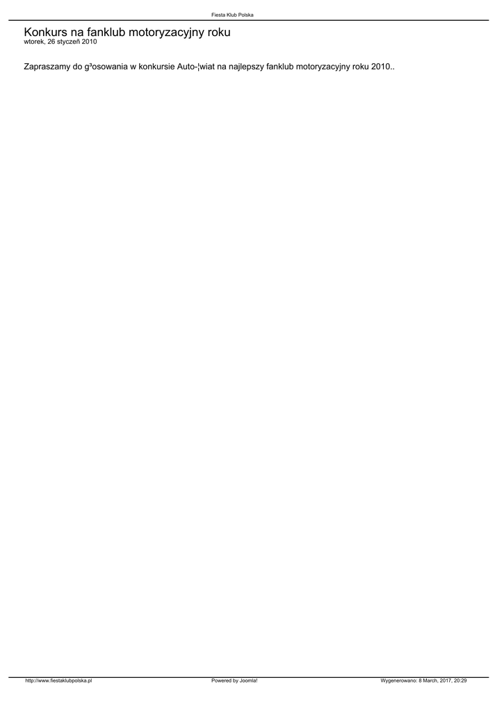 Fiesta Klub Polska Konkurs na fanklub motoryzacyjny roku wtorek, 26 styczeñ 2010 Zapraszamy do g³osowania w konkursie Auto-¦wiat na najlepszy fanklub motoryzacyjny roku 2010.. http://www.fiestaklubpolska.pl Powered by Joomla! Wygenerowano: 8 March, 2017, 20:29