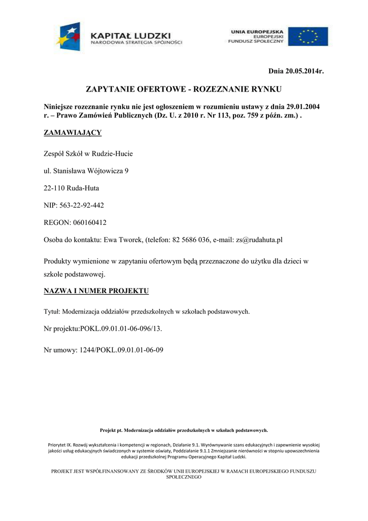 Dnia 20.05.2014r. ZAPYTANIE OFERTOWE - ROZEZNANIE RYNKU Niniejsze rozeznanie rynku nie jest ogłoszeniem w rozumieniu ustawy z dnia 29.01.2004 r. – Prawo Zamówień Publicznych (Dz. U. z 2010 r. Nr 113, poz. 759 z późn. zm.) . ZAMAWIAJĄCY Zespół Szkół w Rudzie-Hucie ul. Stanisława Wójtowicza 9 22-110 Ruda-Huta NIP: 563-22-92-442 REGON: 060160412 Osoba do kontaktu: Ewa Tworek, (telefon: 82 5686 036, e-mail: [email protected] Produkty wymienione w zapytaniu ofertowym będą przeznaczone do użytku dla dzieci w szkole podstawowej. NAZWA I NUMER PROJEKTU Tytuł: Modernizacja oddziałów przedszkolnych w szkołach podstawowych. Nr projektu:POKL.09.01.01-06-096/13. Nr umowy: 1244/POKL.09.01.01-06-09 Projekt pt. Modernizacja oddziałów przedszkolnych w szkołach podstawowych. Priorytet IX. Rozwój wykształcenia i kompetencji w regionach, Działanie 9.1. Wyrównywanie szans edukacyjnych i zapewnienie wysokiej jakości usług edukacyjnych świadczonych w systemie oświaty, Poddziałanie 9.1.1 Zmniejszanie nierówności w stopniu upowszechnienia edukacji przedszkolnej Programu Operacyjnego Kapitał Ludzki. PROJEKT JEST WSPÓŁFINANSOWANY ZE ŚRODKÓW UNII EUROPEJSKIEJ W RAMACH EUROPEJSKIEGO FUNDUSZU SPOŁECZNEGO TERMIN REALIZACJI Od 01.06.2014r do 20.06.2014r. KRYTERIUM WYBORU NAJKORZYSTNIEJSZEJ OFERTY Cena/ atrakcyjność WYMAGANIA DOTYCZĄCE WYKONAWCY Własny transport, terminowość dostawy. WARUNKI WYBORU OFERT 1. W celu zapewnienia porównywalności wszystkich ofert, Zamawiający zastrzega sobie prawo do skontaktowania się z właściwymi Oferentami w celu uzupełnienia lub doprecyzowania ofert. 2. Zamawiający zastrzega sobie prawo do odpowiedzi tylko na wybraną ofertę. INFORMACJE NA TEMAT ZAWARCIA UMOWY I PŁATNOŚCI 1. Rozliczenie na podstawie faktury. Wykonawca wystawi zamawiającemu fakturę VAT, w oparciu o wcześniej wystawiony i podpisany przez zamawiającego protokół odbioru robót, zapłata wynagrodzenia nastąpi w ciągu 30 dni, od dnia doręczenia Zamawiającemu prawidłowo wystawionej faktury VAT FORMA, MIEJSCE ORAZ TERMIN SKŁADANIA ODPOWIEDZI NA ZAPYTANIE 1. Odpowiedź na przedstawione rozeznanie rynku należy składać na załączonym formularzu (zał. nr 1). 2. Odpowiedź na zapytanie powinna być przesłana za pośrednictwem (do wyboru): poczty elektronicznej na adres: [email protected] , pocztą, kurierem lub też dostarczona osobiście (w tej formie wymagana jest pieczątka i podpis oferenta) na adres: Zespół Szkół w Rudzie-Hucie, ul. St. Wójtowicza 9, 22-110 Ruda-Huta, woj. lubelskie( proszę o możliwie najszybszą odpowiedź, do końca maja 2014r.) ZAŁĄCZNIK NR 1 -Formularz ofertowy. Projekt pt. Modernizacja oddziałów przedszkolnych w szkołach podstawowych. Priorytet IX. Rozwój wykształcenia i kompetencji w regionach, Działanie 9.1. Wyrównywanie szans edukacyjnych i zapewnienie wysokiej jakości usług edukacyjnych świadczonych w systemie oświaty, Poddziałanie 9.1.1 Zmniejszanie nierówności w stopniu upowszechnienia edukacji przedszkolnej Programu Operacyjnego Kapitał Ludzki. PROJEKT JEST WSPÓŁFINANSOWANY ZE ŚRODKÓW UNII EUROPEJSKIEJ W RAMACH EUROPEJSKIEGO FUNDUSZU SPOŁECZNEGO Załącznik nr 1 FORMULARZ OFERTOWY DANE WYKONAWCY Nazwa Wykonawcy: REGON: NIP: Adres: Osoba do kontaktu:………………………………. (telefon, e-mail) Projekt pt. Modernizacja oddziałów przedszkolnych w szkołach podstawowych. Priorytet IX. Rozwój wykształcenia i kompetencji w regionach, Działanie 9.1. Wyrównywanie szans edukacyjnych i zapewnienie wysokiej jakości usług edukacyjnych świadczonych w systemie oświaty, Poddziałanie 9.1.1 Zmniejszanie nierówności w stopniu upowszechnienia edukacji przedszkolnej Programu Operacyjnego Kapitał Ludzki. PROJEKT JEST WSPÓŁFINANSOWANY ZE ŚRODKÓW UNII EUROPEJSKIEJ W RAMACH EUROPEJSKIEGO FUNDUSZU SPOŁECZNEGO ODPOWIEDŹ NA ZAPYTANIE OFERTOWE DOTYCZĄCE: Rozeznania rynku przez Zespół Szkół w Rudzie-Hucie, ul. St. Wójtowicza9, 22-110 Ruda-Huta, woj. lubelskie OFEROWANA CENA WYKONANIA ZAMÓWIENIA: Opis zabawek i pomocy Cena 1.Klocki drewniane -3 kpl. 2.Geometryczne kształty tworzywa – 4 kpl 3. samochód wywrotka -10 szt. 4. plansza /mata do zabawy samochodami ze schematami ulic, skrzyżowań – 1kpl. 5. Lalka –dziecko zamykające oczy – 4szt. 6. zestaw narzędzi do majsterkowania – 5kpl. 7. zestaw perkusyjny – 2 kpl. 8. zestaw plansz do zabaw ruchowych – 1 kpl. 9. skakanka -25 szt. 10. piłka 30 cm – 5szt. 11.Lalka -8szt. 12. Łożko drewniane - 1szt. 13. Zestaw małego lekarza -3szt. 14. kuchenka – 1kpl. 15. pojemnik na zabawki -3szt. 16. Kasa z kalkulatorem – 1kpl 17. piłka skaczaca różne rozmiary – 6szt. 18. po 15 sztuk: - ringo i - frisbee Projekt pt. Modernizacja oddziałów przedszkolnych w szkołach podstawowych. Priorytet IX. Rozwój wykształcenia i kompetencji w regionach, Działanie 9.1. Wyrównywanie szans edukacyjnych i zapewnienie wysokiej jakości usług edukacyjnych świadczonych w systemie oświaty, Poddziałanie 9.1.1 Zmniejszanie nierówności w stopniu upowszechnienia edukacji przedszkolnej Programu Operacyjnego Kapitał Ludzki. PROJEKT JEST WSPÓŁFINANSOWANY ZE ŚRODKÓW UNII EUROPEJSKIEJ W RAMACH EUROPEJSKIEGO FUNDUSZU SPOŁECZNEGO 19. tunel o dł. około 180cm – 1szt. 20. woreczki do zajęć gimnastycznych – 25 szt. 21. szarfy do zajęć ruchowych – 25 szt. 22. miś – 5szt. 23. taca z naczyniami – 3kpl. 24. samochód strażacki – 1szt. 25. Betoniarka - 2szt. 26. koparka – 1 szt 27.puzzle drewniane(różne wzory) – 5szt. 28. zestaw zabawek do piaskownicy- 5kpl Pomoce dydaktyczne: 11. 12. 13. 14. 15. 16. 17. 18. 19. 20. 21. 1. Słuchowiska z bajkami –zestaw edukacyjny – 2kpl. 2. Gra planszowa : Jaś i Małgosia, Czerwony Kapturek, Grzybobranie – 2kpl 3. Uczymy się słówek – książka z ćwiczeniami – 25 szt. 4. Gra w skojarzenia - np. karty do nauki j. angielskiego – 1kpl 5. Ścienna mapa Polski-1szt 6. Gra ćwicz