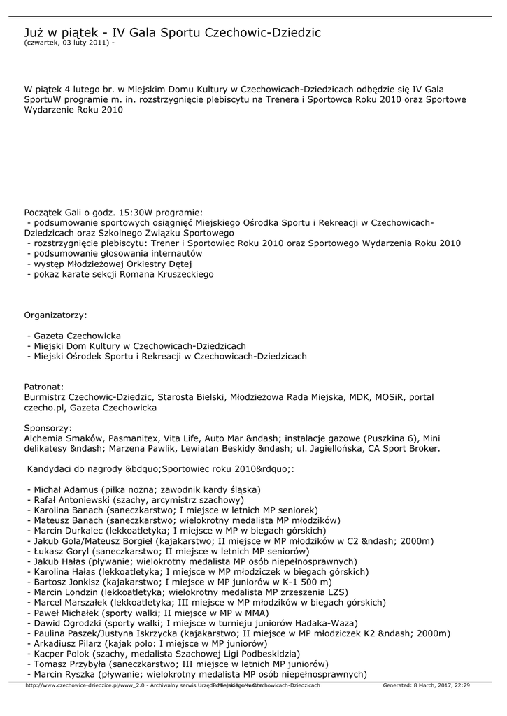 Już w piątek - IV Gala Sportu Czechowic-Dziedzic (czwartek, 03 luty 2011) - W piątek 4 lutego br. w Miejskim Domu Kultury w Czechowicach-Dziedzicach odbędzie się IV Gala SportuW programie m. in. rozstrzygnięcie plebiscytu na Trenera i Sportowca Roku 2010 oraz Sportowe Wydarzenie Roku 2010 Początek Gali o godz. 15:30W programie: - podsumowanie sportowych osiągnięć Miejskiego Ośrodka Sportu i Rekreacji w CzechowicachDziedzicach oraz Szkolnego Związku Sportowego - rozstrzygnięcie plebiscytu: Trener i Sportowiec Roku 2010 oraz Sportowego Wydarzenia Roku 2010 - podsumowanie głosowania internautów - występ Młodzieżowej Orkiestry Dętej - pokaz karate sekcji Romana Kruszeckiego Organizatorzy: - Gazeta Czechowicka - Miejski Dom Kultury w Czechowicach-Dziedzicach - Miejski Ośrodek Sportu i Rekreacji w Czechowicach-Dziedzicach Patronat: Burmistrz Czechowic-Dziedzic, Starosta Bielski, Młodzieżowa Rada Miejska, MDK, MOSiR, portal czecho.pl, Gazeta Czechowicka Sponsorzy: Alchemia Smaków, Pasmanitex, Vita Life, Auto Mar – instalacje gazowe (Puszkina 6), Mini delikatesy – Marzena Pawlik, Lewiatan Beskidy – ul. Jagiellońska, CA Sport Broker. Kandydaci do nagrody „Sportowiec roku 2010”: - Michał Adamus (piłka nożna; zawodnik kardy śląska) Rafał Antoniewski (szachy, arcymistrz szachowy) Karolina Banach (saneczkarstwo; I miejsce w letnich MP seniorek) Mateusz Banach (saneczkarstwo; wielokrotny medalista MP młodzików) Marcin Durkalec (lekkoatletyka; I miejsce w MP w biegach górskich) Jakub Gola/Mateusz Borgieł (kajakarstwo; II miejsce w MP młodzików w C2 – 2000m) Łukasz Goryl (saneczkarstwo; II miejsce w letnich MP seniorów) Jakub Hałas (pływanie; wielokrotny medalista MP osób niepełnosprawnych) Karolina Hałas (lekkoatletyka; I miejsce w MP młodziczek w biegach górskich) Bartosz Jonkisz (kajakarstwo; I miejsce w MP juniorów w K-1 500 m) Marcin Londzin (lekkoatletyka; wielokrotny medalista MP zrzeszenia LZS) Marcel Marszałek (lekkoatletyka; III miejsce w MP młodzików w biegach górskich) Paweł Michałek (sporty walki; II miejsce w MP w MMA) Dawid Ogrodzki (sporty walki; I miejsce w turnieju juniorów Hadaka-Waza) Paulina Paszek/Justyna Iskrzycka (kajakarstwo; II miejsce w MP młodziczek K2 – 2000m) Arkadiusz Pilarz (kajak polo: I miejsce w MP juniorów) Kacper Polok (szachy, medalista Szachowej Ligi Podbeskidzia) Tomasz Przybyła (saneczkarstwo; III miejsce w letnich MP juniorów) Marcin Ryszka (pływanie; wielokrotny medalista MP osób niepełnosprawnych) http://www.czechowice-dziedzice.pl/www_2.0 - Archiwalny serwis Urzędu Powered Miejskiego by Mambo w Czechowicach-Dziedzicach Generated: 8 March, 2017, 22:29 - Jakub Rdzanek (lekkoatletyka; III miejsce w MP juniorów młodszych w biegach górskich) Grzegorz Słabiak (judo; II miejsce w MP juniorów młodszych) Mirosław Sojka (saneczkarstwo; I miejsce w letnich MP juniorów) Bogusław Tyl (judo; MP Masters) Marzena Wala (kajak polo; IV miejsce w MŚ) Paweł Wawrzyczek (judo; I miejsce w MP juniorów młodszych) Marta Wykupil (judo; III miejsce w MP juniorów młodszych) Mateusz Żyła (piłka nożna; zawodnik I-ligowego TS Podbeskidzie) http://www.czechowice-dziedzice.pl/www_2.0 - Archiwalny serwis Urzędu Powered Miejskiego by Mambo w Czechowicach-Dziedzicach Generated: 8 March, 2017, 22:29