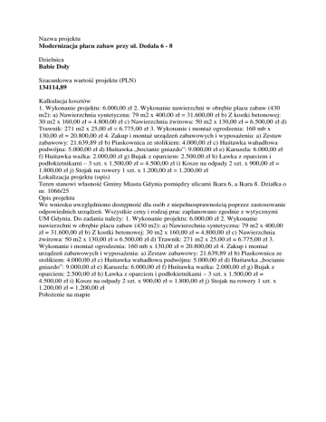 Nazwa projektu Modernizacja placu zabaw przy ul. Dedala 6 - 8 Dzielnica Babie Doły Szacunkowa wartość projektu (PLN) 134114,89 Kalkulacja kosztów 1. Wykonanie projektu: 6.000,00 zł 2. Wykonanie nawierzchni w obrębie placu zabaw (430 m2): a) Nawierzchnia syntetyczna: 79 m2 x 400,00 zł = 31.600,00 zł b) Z kostki betonowej: 30 m2 x 160,00 zł = 4.800,00 zł c) Nawierzchnia żwirowa: 50 m2 x 130,00 zł = 6.500,00 zł d) Trawnik: 271 m2 x 25,00 zł = 6.775,00 zł 3. Wykonanie i montaż ogrodzenia: 160 mb x 130,00 zł = 20.800,00 zł 4. Zakup i montaż urządzeń zabawowych i wyposażenia: a) Zestaw zabawowy: 21.639,89 zł b) Piaskownica ze stolikiem: 4.000,00 zł c) Huśtawka wahadłowa podwójna: 5.000,00 zł d) Huśtawka „bocianie gniazdo”: 9.000,00 zł e) Karuzela: 6.000,00 zł f) Huśtawka ważka: 2.000,00 zł g) Bujak z oparciem: 2.500,00 zł h) Ławka z oparciem i podłokietnikami – 3 szt. x 1.500,00 zł = 4.500,00 zł i) Kosze na odpady 2 szt. x 900,00 zł = 1.800,00 zł j) Stojak na rowery 1 szt. x 1.200,00 zł = 1.200,00 zł Lokalizacja projektu (opis) Teren stanowi własność Gminy Miasta Gdynia pomiędzy ulicami Ikara 6, a Ikara 8. Działka o nr. 1066/25 Opis projektu We wniosku uwzględniono dostępność dla osób z niepełnosprawnością poprzez zastosowanie odpowiednich urządzeń. Wszystkie ceny i rodzaj prac zaplanowano zgodnie z wytycznymi UM Gdynia. Do zadania należy: 1. Wykonanie projektu: 6.000,00 zł 2. Wykonanie nawierzchni w obrębie placu zabaw (430 m2): a) Nawierzchnia syntetyczna: 79 m2 x 400,00 zł = 31.600,00 zł b) Z kostki betonowej: 30 m2 x 160,00 zł = 4.800,00 zł c) Nawierzchnia żwirowa: 50 m2 x 130,00 zł = 6.500,00 zł d) Trawnik: 271 m2 x 25,00 zł = 6.775,00 zł 3. Wykonanie i montaż ogrodzenia: 160 mb x 130,00 zł = 20.800,00 zł 4. Zakup i montaż urządzeń zabawowych i wyposażenia: a) Zestaw zabawowy: 21.639,89 zł b) Piaskownica ze stolikiem: 4.000,00 zł c) Huśtawka wahadłowa podwójna: 5.000,00 zł d) Huśtawka „bocianie gniazdo”: 9.000,00 zł e) Karuzela: 6.000,00 zł f) Huśtawka ważka: 2.000,00 zł g) Bujak z oparciem: 2.500,00 zł h) Ławka z oparciem i podłokietnikami – 3 szt. x 1.500,00 zł = 4.500,00 zł i) Kosze na odpady 2 szt. x 900,00 zł = 1.800,00 zł j) Stojak na rowery 1 szt. x 1.200,00 zł = 1.200,00 zł Położenie na mapie Plik - mapa lokalizacji 5725253fd7738_||_mapa.jpg HISTORIA WERYFIKACJI Wydział: Wydział Architektoniczno - Budowlany Data wysłania: 2016-05-23 11:58:03 Data weryfikacji: 2016-05-20 12:15:35 Data zatwierdzenia: 2016-05-23 11:58:03 Status: Zweryfikowany - Zatwierdzony Zalecenia zmian do projektu: Analiza projektu: 1. zgłoszenie robót budowlanych - zagospodarowanie terenu, - -sprzęt i nawierzchnia muszą posiadać odpowiednie certyfikaty i atesty, - charakterystyczne odległości od budynków, dróg i działek sąsiednich, zgodnie z obowiązującymi przepisami, - sposób odprowadzenia wód opadowych z projektowanych nawierzchni, - możliwe kolizje z istniejącym uzbrojeniem terenu uzgodnić z gestorami sieci, 2. miejscowy plan zagospodarowania przestrzennego dzielnic Babie Doły, Obłuże i Oksywie w Gdyni, rejon ulic Zielonej i A. Dickmana (karta terenu 049 ZP/US), należy wziąć pod uwagę: - pas ochronny - uzgodnić z właściwym terytorialnie organem adm. morskiej, - strefa ochrony klifu, - obszar potencjalnie narażony na osuwanie się mas ziemnych, - zasięg powierzchni ograniczających-otoczenie lotniska wojskowego, Wydział: Wydział Gospodarki Nieruchomościami i Geodezji Data wysłania: 2016-07-07 16:25:52 Data weryfikacji: 2016-07-07 16:25:27 Data zatwierdzenia: 2016-07-07 16:25:52 Status: Zweryfikowany - Zatwierdzony Zalecenia zmian do projektu: Analiza projektu: bez komentarza Wydział: ZDiZ Ryński Data wysłania: 2016-08-31 09:56:04 Data weryfikacji: 2016-08-31 09:08:46 Data zatwierdzenia: 2016-08-31 09:56:04 Status: Zweryfikowany - Zatwierdzony Zalecenia zmian do projektu: bez uwag Analiza projektu: KONTAKT MERYTORYCZNY Kontakt do wydziału merytorycznego prowadzącego projekt: Zarząd Dróg i Zieleni Gdynia, ul. 10 lutego 24, 81-364 Gdynia tel.: 587612000, e-mail: [email protected] ANALIZA PROJEKTU przez wydział ZDiZ Ryński Zalecenia zmian do projektu 1. 2. We w niosku należy o Dodatkow o należy uw Analiza projektu 1. Status Wnioskodaw ca zaakc