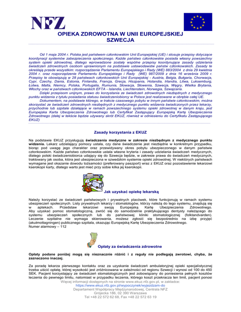OPIEKA ZDROWOTNA W UNII EUROPEJSKIEJ SZWECJA Od 1 maja 2004 r. Polska jest państwem członkowskim Unii Europejskiej (UE) i stosuje przepisy dotyczące koordynacji systemów zabezpieczenia społecznego. Każde państwo członkowskie posiada własny powszechny system opieki zdrowotnej, dlatego wprowadzone zostały wspólne przepisy koordynujące zasady udzielania świadczeń zdrowotnych osobom uprawnionym na podstawie ustawodawstw państw członkowskich. Zasady te określają przede wszystkim: rozporządzenie Parlamentu Europejskiego i Rady (WE) 883/2004 z dnia 29 kwietnia 2004 r. oraz rozporządzenie Parlamentu Europejskiego i Rady (WE) 987/2009 z dnia 16 września 2009 r. Przepisy te obowiązują w 28 państwach członkowskich Unii Europejskiej - Austria, Belgia, Bułgaria, Chorwacja, Cypr, Czechy, Dania, Estonia, Finlandia, Francja, Grecja, Hiszpania, Holandia, Irlandia, Litwa, Luksemburg, Łotwa, Malta, Niemcy, Polska, Portugalia, Rumunia, Słowacja, Słowenia, Szwecja, Węgry, Wielka Brytania, Włochy oraz w państwach członkowskich EFTA - Islandia, Liechtenstein, Norwegia, Szwajcaria. Dzięki przepisom unijnym, prawo do korzystania ze świadczeń zdrowotnych niezbędnych z medycznego punktu widzenia z tytułu posiadania statusu świadczeniobiorcy w Polsce jest realizowane w obrębie całej UE. Dokumentem, na podstawie którego, w trakcie czasowego pobytu w innym państwie członkowskim, można skorzystać ze świadczeń zdrowotnych niezbędnych z medycznego punktu widzenia świadczonych przez lekarzy, przychodnie lub szpitale działające w ramach powszechnego systemu opieki zdrowotnej w danym kraju, jest Europejska Karta Ubezpieczenia Zdrowotnego lub Certyfikat Zastępujący Europejską Kartę Ubezpieczenia Zdrowotnego (dalej w tekście będzie używany skrót EKUZ, również w odniesieniu do Certyfikatu Zastępującego EKUZ) Zasady korzystania z EKUZ Na podstawie EKUZ przysługują świadczenia medyczne w zakresie niezbędnym z medycznego punktu widzenia. Lekarz udzielający pomocy ustala, czy dane świadczenie jest niezbędne w konkretnym przypadku, biorąc pod uwagę jego charakter oraz przewidywany okres pobytu ubezpieczonego w danym państwie członkowskim. Każde państwo członkowskie ustala własne kryteria i zasady udzielania świadczeń medycznych, dlatego polski świadczeniobiorca udający się do Szwecja będzie, w zakresie prawa do świadczeń medycznych, traktowany jak osoba, która jest ubezpieczona w szwedzkim systemie opieki zdrowotnej. W niektórych państwach wymagane jest okazanie dowodu tożsamości (preferowany paszport) wraz z EKUZ oraz pozostawienie lekarzowi kserokopii karty, dlatego warto jest mieć przy sobie kilka jej kserokopii. Jak uzyskać opiekę lekarską Należy korzystać ze świadczeń państwowych i prywatnych placówek, które funkcjonują w ramach systemu ubezpieczeń społecznych. Listy prywatnych lekarzy i stomatologów, którzy należą do tego systemu, znajdują się w aptekach. Przedstaw lekarzowi swoją Europejską Kartę Ubezpieczenia Zdrowotnego. Aby uzyskać pomoc stomatologiczną, zwróć się do samodzielnie praktykującego dentysty należącego do systemu ubezpieczeń społecznych lub do państwowej kliniki stomatologicznej (folktandvarden). Leczenie szpitalne nie wymaga skierowania, możesz zgłosić się bezpośrednio na izbę przyjęć (akutmottagningen) publicznego szpitala, okazując Europejską Kartę Ubezpieczenia Zdrowotnego. Numer alarmowy – 112 Opłaty za świadczenia zdrowotne Opłaty podane poniżej mogą się nieznacznie różnić i z reguły nie podlegają zwrotowi, chyba, że zaznaczono inaczej. Za poradę lekarza pierwszego kontaktu oraz za uzyskanie świadczeń ambulatoryjnej opieki specjalistycznej trzeba uiścić opłatę, której wysokość jest zróżnicowana w zależności od regionu Szwecji i wynosi od 100 do 450 SEK. Pacjent korzystający ze świadczeń stomatologicznych jest zobowiązany do poniesienia pełnych kosztów leczenia do pewnego limitu, natomiast w przypadku leczenia, którego koszt przekracza ten limit, pacjent ponosi Więcej informacji dostępnych na stronie www.ekuz.nfz.gov.pl, w zakładce: https://www.ekuz.nfz.gov.pl/wypoczynek/wyjezdzam-do Departament Współpracy Międzynarodowej, Centrala NFZ Grójecka 186, 02 390 Warszawa Tel +48 22 572 62 68, Fax +48 22 572 63 19 koszty w wysokości od 30% do 65% kwoty poniesionych kosztów ponad wskazany limit. Za poradę ambulatoryjną udzieloną w szpitalu pacjent zobowiązany jest zapłacić zryczałtowaną opłatę w wysokości ok. 250 SEK. W przypadku pobytu w szpitalu pacjent zostanie obciążony kosztami stawki dziennej w wysokości 80 SEK za dzień. Jeżeli kwota wydatków na leki wydawanych na podstawie recepty nie przekracza kwoty 900 SEK, pacjent zapłaci pełną cenę leków. W przypadku poniesienia kosztów wykraczających poza limit 900 SEK, ale nie przekraczających kwoty 4300 SEK pacjent zapłaci pomiędzy 10% a 50% ceny leków, a w przypadku, gdy koszt leków wykroczy ponad kwotę 4300 SEK pacjent nie ponosi żadnych kosztów i leki będą mu wydane w aptece bezpłatnie. Przewóz karetką jak i transport lotniczy w większości regionów jest bezpłatny. Transport powrotny do Polski jest generalnie opłacany przez pacjenta. UWAGA! EKUZ nie zapewnia pokrycia kosztów transportu medycznego do Polski oraz obowiązujących w Szwecji opłat za świadczenia medyczne, dlatego aby uniknąć obciążenia tymi kosztami, wskazane jest wykupienie dodatkowego prywatnego ubezpieczenia. Recepty Uprawniony do wystawiania recepty objętej refundacją jest lekarz pracujący w ramach systemu ubezpieczeń społecznych Leczenie prywatne Koszty leczenia uzyskanego w placówce funkcjonującej poza publicznym systemem ochrony zdrowia w Szwecji pacjent pokrywa w całości we własnym zakresie. Dokumenty niezbędne do uzyskania zwrotu poniesionych kosztów W celu uzyskania zwrotu kosztów należy zwrócić się z wnioskiem do właściwego oddziału NFZ po pow