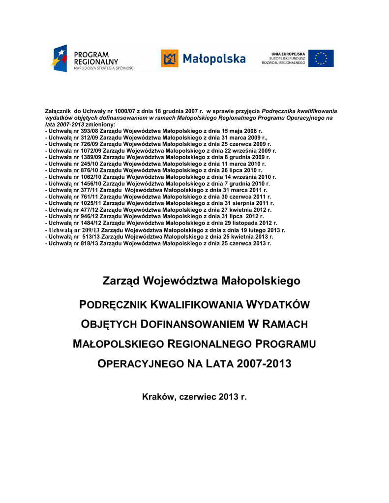 Załącznik do Uchwały nr 1000/07 z dnia 18 grudnia 2007 r. w sprawie przyjęcia Podręcznika kwalifikowania wydatków objętych dofinansowaniem w ramach Małopolskiego Regionalnego Programu Operacyjnego na lata 2007-2013 zmieniony: - Uchwałą nr 393/08 Zarządu Województwa Małopolskiego z dnia 15 maja 2008 r. - Uchwałą nr 312/09 Zarządu Województwa Małopolskiego z dnia 31 marca 2009 r., - Uchwałą nr 726/09 Zarządu Województwa Małopolskiego z dnia 25 czerwca 2009 r. - Uchwała nr 1072/09 Zarządu Województwa Małopolskiego z dnia 22 września 2009 r. - Uchwała nr 1389/09 Zarządu Województwa Małopolskiego z dnia 8 grudnia 2009 r. - Uchwała nr 245/10 Zarządu Województwa Małopolskiego z dnia 11 marca 2010 r. - Uchwała nr 876/10 Zarządu Województwa Małopolskiego z dnia 26 lipca 2010 r. - Uchwała nr 1062/10 Zarządu Województwa Małopolskiego z dnia 14 września 2010 r. - Uchwałą nr 1456/10 Zarządu Województwa Małopolskiego z dnia 7 grudnia 2010 r. - Uchwałą nr 377/11 Zarządu Województwa Małopolskiego z dnia 31 marca 2011 r. - Uchwałą nr 761/11 Zarządu Województwa Małopolskiego z dnia 30 czerwca 2011 r. - Uchwałą nr 1025/11 Zarządu Województwa Małopolskiego z dnia 31 sierpnia 2011 r. - Uchwałą nr 477/12 Zarządu Województwa Małopolskiego z dnia 27 kwietnia 2012 r. - Uchwałą nr 946/12 Zarządu Województwa Małopolskiego z dnia 31 lipca 2012 r. - Uchwałą nr 1484/12 Zarządu Województwa Małopolskiego z dnia 29 listopada 2012 r. - Uchwałą nr 209/13 Zarządu Województwa Małopolskiego z dnia z dnia 19 lutego 2013 r. - Uchwałą nr 513/13 Zarządu Województwa Małopolskiego z dnia 25 kwietnia 2013 r. - Uchwałą nr 818/13 Zarządu Województwa Małopolskiego z dnia 25 czerwca 2013 r. Zarząd Województwa Małopolskiego PODRĘCZNIK KWALIFIKOWANIA WYDATKÓW OBJĘTYCH DOFINANSOWANIEM W RAMACH MAŁOPOLSKIEGO REGIONALNEGO PROGRAMU OPERACYJNEGO NA LATA 2007-2013 Kraków, czerwiec 2013 r. 2 Podręcznik kwalifikowania wydatków objętych dofinansowaniem w ramach MRPO na lata 2007-2013 SPIS TREŚCI Skróty występujące w Podręczniku................................................................................................................. Najważniejsze pojęcia występujące w Podręczniku ...................................................................................... Podstawa prawna .......................................................................................................................................... Główne akty prawne i dokumenty regulujące zagadnienia kwalifikowalności wydatków ............................... 5 5 7 7 CZEŚĆ I. ZASADY OGÓLNE 1. 2. 3. 4. 5. 6. Zasady kwalifikowania projektu ........................................................................................................ Zasięg terytorialny ............................................................................................................................ Trwałość projektu ............................................................................................................................. Zasady kwalifikowania wydatków ..................................................................................................... Ogólne warunki uznania wydatku za kwalifikowany ......................................................................... Kwalifikowalność wydatków w ramach projektów objętych schematami pomocy publicznej ......................................................................................................................................... 7. Podmiot ponoszący wydatki ............................................................................................................. 8. Uznanie wydatku za poniesiony ....................................................................................................... 9. Termin poniesienia wydatku ............................................................................................................. 10. Zakaz podwójnego finansowania ..................................................................................................... 11. Cross-financing – elastyczne finansowanie ..................................................................................... 12. Projekty generujące dochód ............................................................................................................ CZEŚĆ II. WARUNKI WYDATKÓW UZNANIA ZA KWALIFIKOWANE POSZCZEGÓLNYCH 8 8 9 9 11 13 14 15 15 17 18 18 RODZAJÓW Wydatki związane z przygotowaniem projektu A. 13. Wydatki na przygotowanie projektu ................................................................................................. 19 Wydatki związane bezpośrednio z realizacją projektu B. 14. 15. 16. 17. 18. 19. 20. 21. 22. 23. 24. C. Nabycie nieruchomości........................................................................................................................ Zakup środków trwałych ................................................................................................................... Zakup wartości niematerialnych i prawnych ..................................................................................... Leasing oraz inne techniki finansowania nieruchomości, środków trwałych i wartości niematerialnych i prawnych............................................................................................................... .......................... Instalacja środków trwałych oraz wartości niematerialnych i prawnych ........................................... Amortyzacja ...................................................................................................................................... Roboty budowlane ........................................................................................................................... Instrumenty finansowe ...................................................................