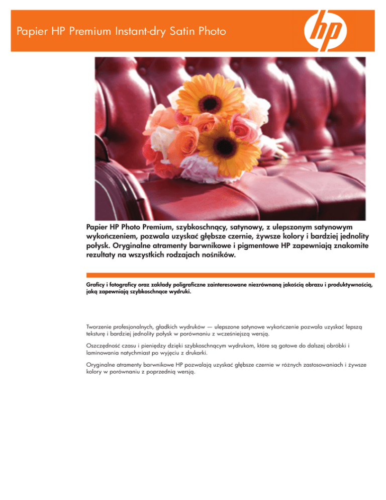Papier HP Premium Instant-dry Satin Photo Papier HP Photo Premium, szybkoschnący, satynowy, z ulepszonym satynowym wykończeniem, pozwala uzyskać głębsze czernie, żywsze kolory i bardziej jednolity połysk. Oryginalne atramenty barwnikowe i pigmentowe HP zapewniają znakomite rezultaty na wszystkich rodzajach nośników. Graficy i fotograficy oraz zakłady poligraficzne zainteresowane niezrównaną jakością obrazu i produktywnością, jaką zapewniają szybkoschnące wydruki. Tworzenie profesjonalnych, gładkich wydruków — ulepszone satynowe wykończenie pozwala uzyskać lepszą teksturę i bardziej jednolity połysk w porównaniu z wcześniejszą wersją. Oszczędność czasu i pieniędzy dzięki szybkoschnącym wydrukom, które są gotowe do dalszej obróbki i laminowania natychmiast po wyjęciu z drukarki. Oryginalne atramenty barwnikowe HP pozwalają uzyskać głębsze czernie w różnych zastosowaniach i żywsze kolory w porównaniu z poprzednią wersją. Papier HP Premium Instant-dry Satin Photo Zgodność Najnowsze informacje na temat zgodności materiałów eksploatacyjnych do drukarek wielkoformatowych można znaleźć na stronie www.hp.com/go/designjet/supplies Najnowsze profile ICC dla nośników można znaleźć pod adresem www.hp.com/go/designjet/supplies (należy kliknąć profile ICC i wybrać model drukarki). W przypadku drukarek niepostscriptowych informacji na ten temat można zasięgnąć u dostawcy procesora RIP. Dane techniczne produktu Waga Grubość Nieprzejrzystość Jasność Biel Laminowanie Wykończenie Temperatura pracy Wilgotność podczas pracy Odporność na blaknięcie (pomieszczenia biurowe lub domowe, atrament barwnikowy) Odporność na blaknięcie (pomieszczenia biurowe lub domowe, atrament pigmentowy) Wodotrwałość Czas suszenia Okres trwałości Temperatura przechowywania Wilgotność przechowywania Kraj pochodzenia Informacje o zamawianiu 260 g/m² wg metody testowej ISO 536 260 µm wg metody testowej ISO 534 97% wg metody testowej TAPPI T-425 92% wg metody testowej TAPPI T-452 104 wg metody testowej CIE Ganz 82 Tak, na gorąco i na zimno. Więcej informacji na temat partnerów HP zajmujących się laminowaniem można znaleźć na stronie: www.hp.moc/go/designjet/supplies Satynowy 15-30°C Wilgotność względna od 30 do 80% Przy użyciu drukarki Designjet 5000/5500 i atramentów HP 81: ponad 4 miesiące Z drukarką Designjet 5000/5500 i atramentami HP 83: ponad 100 lat Wymagane laminowanie Poniżej 2 min (w temperaturze 23°C, przy wilgotności względnej 50%) 2 lata w oryginalnym, fabrycznie zamkniętym opakowaniu Od 18 do 30° C Od 35 do 65% wilgotności względnej Produkt wytwarzany w Niemczech Numer produktu Q7992A Q7994A Q7996A Q8000A Gwarancja Wymiary rolki 610 mm x 22,8 914 mm x 30,5 1067 mm x 30,5 1 524 mm x 30,5 m m m m Kod UPC 882780085671 882780085695 882780085718 882780085756 HP gwarantuje, że wielkoformatowe materiały drukarskie HP są wolne od wad produkcyjnych i są tak zaprojektowane, by przy właściwym użytkowaniu nie powodować zacięć drukarki. © 2010 Hewlett-Packard Development Company L.P. Wszystkie gwarancje udzielane w odniesieniu do Produktów i Usług HP określone zostały w oświadczeniach gwarancyjnych załączanych do każdego produktu i usługi. Żaden zapis niniejszego dokumentu nie może być uważany za dodatkową gwarancję. HP nie ponosi odpowiedzialności za błędy techniczne lub drukarskie w niniejszym dokumencie. Aby uzyskać więcej informacji na temat materiałów do wydruków HP w dużym formacie, odwiedź http://www.hp.com/go/designjet/supplies Publikacja na region EMEA 4AA1-1709 PLE