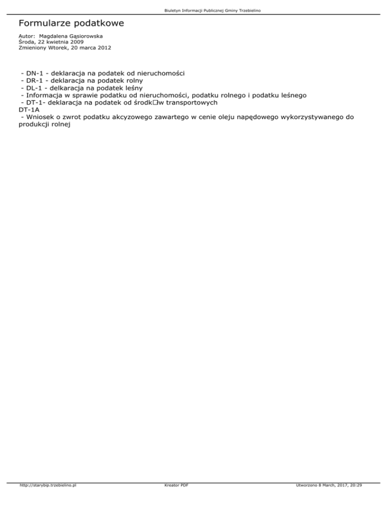 Biuletyn Informacji Publicznej Gminy Trzebielino Formularze podatkowe Autor: Magdalena Gąsiorowska Środa, 22 kwietnia 2009 Zmieniony Wtorek, 20 marca 2012 - DN-1 - deklaracja na podatek od nieruchomości - DR-1 - deklaracja na podatek rolny - DL-1 - delkaracja na podatek leśny - Informacja w sprawie podatku od nieruchomości, podatku rolnego i podatku leśnego - DT-1- deklaracja na podatek od środkÃłw transportowych DT-1A - Wniosek o zwrot podatku akcyzowego zawartego w cenie oleju napędowego wykorzystywanego do produkcji rolnej http://starybip.trzebielino.pl Kreator PDF Utworzono 8 March, 2017, 20:29