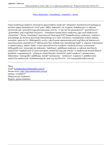 Dane pochodzą ze strony: http://www.ogloszenia-goleniow.pl/. Wygenerowano dnia: 08-03-2017. Prace doktorskie - konsultacje - materia?y - korek Nasza korporacja naukowa zrzeszaj?ca pracowników nauki jak i ekspertów dziedzinowych pomaga na ka?dym etapie skonsultowa? swoj? prac? MBA, doktorsk? czy rozpraw? habilitacyjn? w zakresie merytoryki jak i prawid?owego procedowania ca?o?ci. U nas mo?na skonsultowa?: prawid?owo?? „konstruktu” pod wzgl?dem rzeczowo – formalnym tematu pracy naukowej, jego cech naukowych / „brzmienia” i formy, konstrukcj? merytoryczn? koncepcji b?d? konspektu pracy naukowej / rozprawy – potrzebnego do otwarcia przewodu doktorskiego (a w nim: celu pracy, uzasadnienia wyboru tematu, metodyki, spisu tre?ci i bibliografii), wst?p i zako?czenie opracowania pod wzgl?dem sk?adniowym i merytorycznym, prawid?owo?? doboru narz?dzi, technik oraz metodologii bada? w zakresie wskazanym w temacie pracy, analiz? bada? w tym: prawid?owo?ci wyników i dyskusji do niej, rozszerzenie bibliografii (tzw. kwerenda) do doktoratu / habilitacji i publikacji naukowej w zakresie dost?pu do materia?ów znajduj?cych si? poza zasi?giem zamawiaj?cego jak równie? w naukowych bazach danych (polskich i zagranicznych – p?atnych i bezp?atnych), niezale?n? opini? naukow? o pisanej pracy doktorskiej / monografii i publikacji, korekt? stylistyczno – techniczn?, wsparcie w publikowaniu artyku?ów naukowych i konferencyjnych, inne wg. mo?liwo?ci. www.pracedoktorskie.com.pl Dane: email: [email protected] Strona www: http://pracedoktorskie.com.pl telefon: 513484515 Miejscowość: Goleniów Region: gmina Goleniów