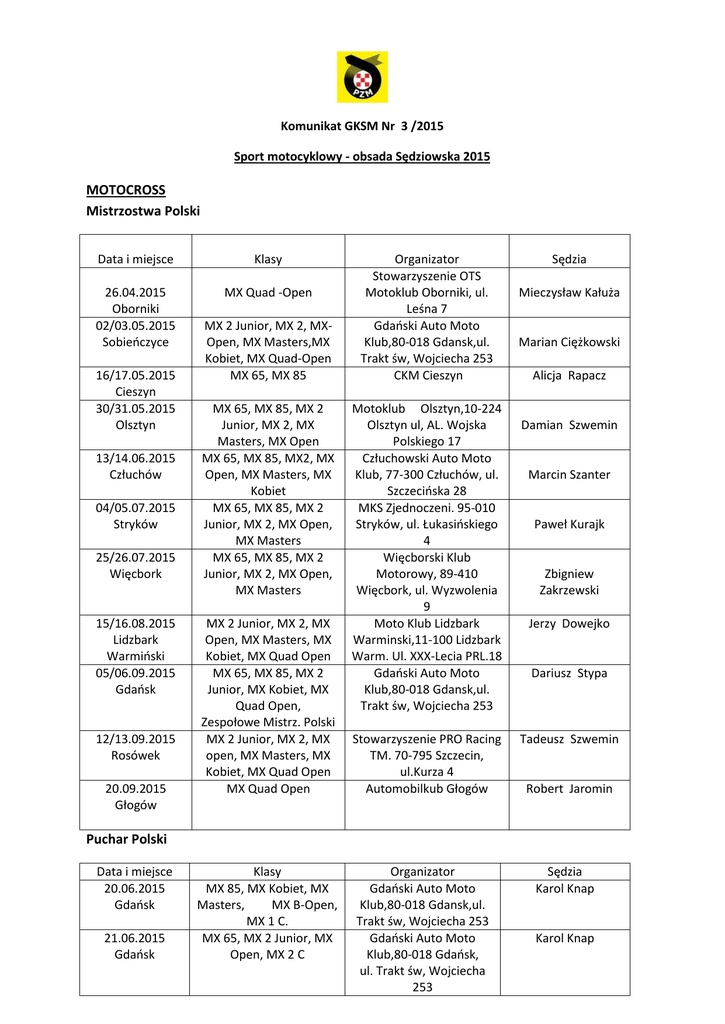 Komunikat GKSM Nr 3 /2015 Sport motocyklowy - obsada Sędziowska 2015 MOTOCROSS Mistrzostwa Polski Data i miejsce Klasy 26.04.2015 Oborniki 02/03.05.2015 Sobieńczyce MX Quad -Open 16/17.05.2015 Cieszyn 30/31.05.2015 Olsztyn 13/14.06.2015 Człuchów 04/05.07.2015 Stryków 25/26.07.2015 Więcbork 15/16.08.2015 Lidzbark Warmiński 05/06.09.2015 Gdańsk 12/13.09.2015 Rosówek 20.09.2015 Głogów MX 2 Junior, MX 2, MXOpen, MX Masters,MX Kobiet, MX Quad-Open MX 65, MX 85 MX 65, MX 85, MX 2 Junior, MX 2, MX Masters, MX Open MX 65, MX 85, MX2, MX Open, MX Masters, MX Kobiet MX 65, MX 85, MX 2 Junior, MX 2, MX Open, MX Masters MX 65, MX 85, MX 2 Junior, MX 2, MX Open, MX Masters MX 2 Junior, MX 2, MX Open, MX Masters, MX Kobiet, MX Quad Open MX 65, MX 85, MX 2 Junior, MX Kobiet, MX Quad Open, Zespołowe Mistrz. Polski MX 2 Junior, MX 2, MX open, MX Masters, MX Kobiet, MX Quad Open MX Quad Open Organizator Stowarzyszenie OTS Motoklub Oborniki, ul. Leśna 7 Gdański Auto Moto Klub,80-018 Gdansk,ul. Trakt św, Wojciecha 253 CKM Cieszyn Motoklub Olsztyn,10-224 Olsztyn ul, AL. Wojska Polskiego 17 Człuchowski Auto Moto Klub, 77-300 Człuchów, ul. Szczecińska 28 MKS Zjednoczeni. 95-010 Stryków, ul. Łukasińskiego 4 Więcborski Klub Motorowy, 89-410 Więcbork, ul. Wyzwolenia 9 Moto Klub Lidzbark Warminski,11-100 Lidzbark Warm. Ul. XXX-Lecia PRL.18 Gdański Auto Moto Klub,80-018 Gdansk,ul. Trakt św, Wojciecha 253 Stowarzyszenie PRO Racing TM. 70-795 Szczecin, ul.Kurza 4 Automobilkub Głogów Sędzia Mieczysław Kałuża Marian Ciężkowski Alicja Rapacz Damian Szwemin Marcin Szanter Paweł Kurajk Zbigniew Zakrzewski Jerzy Dowejko Dariusz Stypa Tadeusz Szwemin Robert Jaromin Puchar Polski Data i miejsce 20.06.2015 Gdańsk 21.06.2015 Gdańsk Klasy MX 85, MX Kobiet, MX Masters, MX B-Open, MX 1 C. MX 65, MX 2 Junior, MX Open, MX 2 C Organizator Gdański Auto Moto Klub,80-018 Gdansk,ul. Trakt św, Wojciecha 253 Gdański Auto Moto Klub,80-018 Gdańsk, ul. Trakt św, Wojciecha 253 Sędzia Karol Knap Karol Knap ENDURO Mistrzostwa Polski i Puchar Polski Data Runda Miejsce 23-24.05. 2015 I, II runda Nowy Sącz 13-14.06. 2015 III, IV runda Wałbrzych 18-19.07. 2015 V, VI runda Malechowo 22-23.08. 2015 VII, VIII runda Morawica 26-27.09. 2015 IX, X runda Kwidzyn Organizator Stowarzyszenie Grupa 4x4 33-300 Nowy Sącz, ul. Flisaków 1 WSM Chełmiec 58-309 Wałbrzych, ul. Kruczkowskiego 5/4 MotoCross Klub Darłowo 76-150 Darłowo, ul. Polna 53 Kielecki Klub Motocyklowy „Wena” 25-108 Kielce, ul. Jana Chryzostoma Paska 1 Kwidzyński Klub Motorowy 82-500 Kwidzyn, ul. Mickiewicza 23 Sędzia Marek Kopczyński Waldemar Iracki Marek Sikora Damian Dąbrowski Roman Umiastowski SUPERENDURO Mistrzostwa Polski i Puchar Polski Data Runda Miejsce 12.04. I Dąbrowa Górnicza 21.06. II Oborniki Wlkp. 28.06. III Buczek 12.07. IV Wałbrzych 25.07. V Strzelinko 9.08. VI Rzgów Organizator Łódzki Klub Motorowy 93-419 Łódź, ul. Rzemieślnicza 20 Motoklub Oborniki 64-600 Oborniki ul. Droga Leśna 7 Łódzki Klub Motorowy 93-419 Łódź, ul. Rzemieślnicza 20 WSM Chełmiec 58-309 Wałbrzych, ul. Kruczkowskiego 5/4 Gdyński Klub Motorowy Kamionka 81-553 Gdynia, ul. Bernadowska 1 Łódzki Klub Motorowy 93-419 Łódź, ul. Rzemieślnicza 20 Sędzia Andrzej Frankowski Tomasz Smorczewski Tomasz Leoniuk Marek Brygider Tadeusz Ulenberg Paweł Słowikowski CROSS COUNTRY Mistrzostwa Polski i Puchar Polski DATA RUNDA MIEJSCE 1112.04. I, II Kwidzyn ORGANIZATOR Kwidzyński Klub Motorowy 82-500 Kwidzyn, ul. Mickiewicza 23 Sędzia Damian Dąbrowski 2526.04. III, IV Żagań 9-10.05. V, VI Radom 2324.05. VII, VIII Chełmno 6-7.06. IX, X Lidzbark Warm. 2021.06. XI, XII Biedrusko 1516.08. XIII, XIV Oborniki 2930.08. XV, XVI Szczecin 1213.09. XVII-XVIII Romanówka 3-4.10. XIX-XX Wałbrzych Stowarzyszenie „Grupa 4x4” 33-300 Nowy Sącz, ul. Flisaków 1 RTM Radom 26-612 Radom, ul. Limanowskiego 95E Klub Motorowy Wisła Chełmno 86-200 Chełmno, ul. Toruńska 14 Warmiński Auto-MotoKlub 11-100 Lidzbark Warm., ul. Medyny 48 Motoklub Unia Poznań 61-858 Poznań, ul. Grobla 30 Motoklub Oborniki 64-600 Oborniki, Droga Leśna 7 Klub Motorowy Szczecin 71-256 Szczecin, Al. Wojska Polskiego 237a Klub Motorowy Quercus 17-300 Siemiatycze, Romanówka 44 WSM Chełmiec 58-309 Wałbrzych, ul. Kruczkowskiego 5/4 Andrzej Nalepka Roman Umiastowski Waldek Iracki Tomasz Leoniuk Robert Kramer Mieczysław Kałuża Bogdan Rudnicki Lech Wiśniewski Ryszard Obst Warszawa, marzec 2015 Główna Komisja Sportu Motocyklowego
