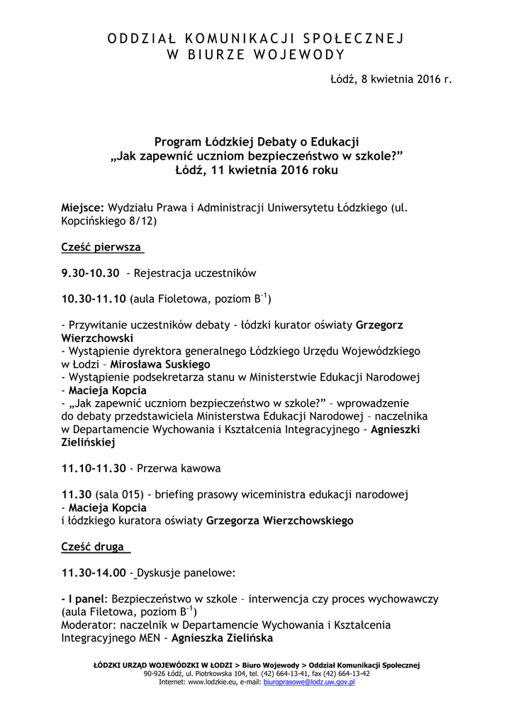 ODDZIAŁ KOMUNIKACJI SPOŁECZNEJ W BIURZE WOJEWODY Łódź, 8 kwietnia 2016 r. Program Łódzkiej Debaty o Edukacji „Jak zapewnić uczniom bezpieczeństwo w szkole?” Łódź, 11 kwietnia 2016 roku Miejsce: Wydziału Prawa i Administracji Uniwersytetu Łódzkiego (ul. Kopcińskiego 8/12) Cześć pierwsza 9.30-10.30 - Rejestracja uczestników 10.30-11.10 (aula Fioletowa, poziom B-1) - Przywitanie uczestników debaty - łódzki kurator oświaty Grzegorz Wierzchowski - Wystąpienie dyrektora generalnego Łódzkiego Urzędu Wojewódzkiego w Łodzi – Mirosława Suskiego - Wystąpienie podsekretarza stanu w Ministerstwie Edukacji Narodowej - Macieja Kopcia - „Jak zapewnić uczniom bezpieczeństwo w szkole?” – wprowadzenie do debaty przedstawiciela Ministerstwa Edukacji Narodowej – naczelnika w Departamencie Wychowania i Kształcenia Integracyjnego - Agnieszki Zielińskiej 11.10-11.30 - Przerwa kawowa 11.30 (sala 015) - briefing prasowy wiceministra edukacji narodowej - Macieja Kopcia i łódzkiego kuratora oświaty Grzegorza Wierzchowskiego Cześć druga 11.30-14.00 - Dyskusje panelowe: - I panel: Bezpieczeństwo w szkole – interwencja czy proces wychowawczy (aula Filetowa, poziom B-1) Moderator: naczelnik w Departamencie Wychowania i Kształcenia Integracyjnego MEN - Agnieszka Zielińska ŁÓDZKI URZĄD WOJEWÓDZKI W ŁODZI > Biuro Wojewody > Oddział Komunikacji Społecznej 90-926 Łódź, ul. Piotrkowska 104, tel. (42) 664-13-41, fax (42) 664-13-42 Internet: www.lodzkie.eu, e-mail: [email protected] ODDZIAŁ KOMUNIKACJI SPOŁECZNEJ W BIURZE WOJEWODY Moderator II: główny specjalista w Departamencie Wychowania i Kształcenia Integracyjnego MEN - Teresa Szopińska Grodzka naczelnik Wydziału Edukacji Kultury i Sportu w Pabianicach Waldemar Boryń dyrektor XII LO w Łodzi - Tomasz Derecki przedstawiciel Liceum UŁ, były pracownik Biura Rzecznika Praw Dziecka - Mirosław Kaczmarek - II panel: Bariery w realizacji wychowawczo-profilaktycznej funkcji szkoły – jak je pokonać (aula Niebieska, poziom B2) Moderator: wicedyrektor Ośrodka Rozwoju Edukacji (ORE) - Dorota Żyro Wsparcie merytoryczne: kierownik Wydziału Wychowania i Profilaktyki w ORE - Anna Borkowska konsultant w Wydziale Wychowania i Profilaktyki w ORE - Dorota Macander psycholog, Instytut Psychologii Uniwersytetu Łódzkiego - Magdalena Kobylarczyk dyrektor Szkoły Podstawowej nr 91 w Łodzi - Konrad Kurczewski dyrektor Poradni Psychologiczno-Pedagogicznej nr 5 w Łodzi - Ewa Szafraniec zastępca dyrektora Departamentu Podręczników, Programów i Innowacji - Rafał Lew-Starowicz 14.00-14.30 - Przerwa kawowa Cześć trzecia 14.30-15.30 (aula Fioletowa, poziom B-1) - Podsumowanie debaty - Prezentacja efektów pracy poszczególnych grup panelowych – wnioski, postulaty do MEN - Podsumowanie debaty przez przedstawiciela MEN - Zakończenie debaty ŁÓDZKI URZĄD WOJEWÓDZKI W ŁODZI > Biuro Wojewody > Oddział Komunikacji Społecznej 90-926 Łódź, ul. Piotrkowska 104, tel. (42) 664-13-41, fax (42) 664-13-42 Internet: www.lodzkie.eu, e-mail: [email protected]