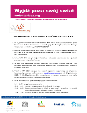REGULAMIN IV EDYCJI WROCŁAWSKICH TARGÓW WOLONTARIATU 2016 1. IV Edycja Wrocławskich Targów Wolontariatu 2016 (WTW 2016) jest organizowana przez Wrocławskie Centrum Wolontariatu w ramach projektu Pozarządowy Program Rozwoju Wolontariatu we Wrocławiu „WOLONTARIUSZ.ORG”. 2. IV Edycja Wrocławskich Targów Wolontariatu 2016 odbędzie się dn. 21 października 2016 r. w godzinach 10.00 – 17.00 w Sali Gimnastycznej Gimnazjum nr 13 im. Unii Europejskiej przy ul. Reja we Wrocławiu. 3. Celem WTW 2016 jest promocja wolontariatu i rekrutacja wolontariuszy do organizacji pozarządowych i instytucji publicznych. 4. W WTW 2016 prezentować się mogą organizacje pozarządowe, instytucje publiczne i inne podmioty współpracujące bądź zamierzające współpracować z wolontariuszami działające na terenie Wrocławia. 5. Udział w WTW 2016 następuje na podstawie zgłoszenia wypełnionego na załączonym formularzu i przesłanego mailem na adres [email protected] do dnia 19 października 2016 r. W dniu 20 października 2016 r. organizatorzy na wskazany w zgłoszeniu adres wyślą maila z najważniejszymi informacjami organizacyjnymi. 6. WTW 2016 odbędą się zgodnie z następującym harmonogramem: 8.00 – 11.00 – przygotowanie wystawców 10.00 – 11.00 – warsztaty przygotowawcze do konferencji Open Space 11.00 – 14.00 – konferencja Open Space pt. „Moda na wolontariat? – perspektywy i trudności w rozwoju wolontariatu młodzieżowego we Wrocławiu” 11.00 – 17.00 – stoiska, prezentacje, animacje itp. przygotowane przez wystawców 7. Podczas WTW 2016 możliwe są następujące formy promocji: - stoiska wystawiennicze, oferty wolontariatu na tablicy ogłoszeń, indywidualne prezentacje dobrych praktyk (wystąpień z prezentacją multimedialną, filmów, itp.), ekspozycje wystaw dotyczących wolontariatu, inne ustalone z Organizatorami działania indywidualne. Możliwe jest uczestnictwo zarówno we wszystkich jak i w wybranych formach promocji. Organizatorzy zastrzegają sobie prawo do ograniczenia zakresu form promocji. 8. Wystawcy mogą przygotować stoisko indywidualne lub grupowe. 9. Stoiska wystawiennicze będą zorganizowane w przestrzeni zamkniętej zgodnie z planem opracowanym przez organizatorów. Wystawcy będą dysponować powierzchnią ok. 4 m2, stolikiem i dwoma krzesłami. Ewentualny dostęp do prądu będzie uzgadniany indywidualnie. Organizacja zapewnia sobie we własnym zakresie innego rodzaju sprzęt niezbędny do wyposażenia stoiska wystawienniczego. Organizacja ponosi odpowiedzialność za użyczony od Organizatorów sprzęt i może zostać pociągnięta do odpowiedzialności finansowej za wyrządzone szkody. Stoiska służyć będą przede wszystkim promocji wolontariatu i prezentacji ofert dla wolontariuszy. 10.Podczas imprezy odbywać się będzie gra targowa, w ramach której wystawcy mogą przyznawać uczestnikom do 3 pkt. za spełnienie opracowanych przez siebie wymogów. Potwierdzeniem przyznania punktów będzie wpis na formularzu gry pod przyporządkowanym wystawcy numerem wraz z pieczątką. Wskazane jest, aby przyznawanie punktów było powiązane z poznawaniem podmiotu i jego ofert wolontariatu. 11.Montaż stoisk wystawienniczych odbywać się będzie w dniu imprezy od godz. 8.00, a demontaż po jej zakończeniu. Wszyscy wystawcy zobowiązani są do prowadzenia stoiska wystawienniczego przez cały czas trwania Targów oraz posprzątanie użytkowanej przestrzeni przed jej opuszczeniem. 12. Liczba stoisk wystawienniczych jest ograniczona. 13.Oferty wolontariatu prezentowane będą na tablicy ogłoszeń w widocznym miejscu. Oferta wolontariatu powinna mieć format jednej kartki A4 i dotyczyć pojedynczego działania przewidzianego dla wolontariuszy. Oferta powinna zawierać: - nazwę oferty, - charakterystykę oferty (opis działań), - zadania dla wolontariuszy, - oferowane korzyści dla wolontariusza, - charakterystykę wolontariuszy (liczba, preferowany wiek, umiejętności, kwalifikacje, itp.), - dane kontaktowe oferenta. Ponadto oferty mogą zawierać zdjęcia, znaki graficzne oferenta i inne indywidualnie przygotowane treści. Każdy oferent może zgłosić dowolną ilość ofert. Oferty należy przesyłać wraz z formularzem zgłoszeniowym w formacie JPG lub PDF. Organizatorzy zastrzegają sobie prawo do ograniczenia ilości ofert bądź negocjowania ich treści i sposobu prezentacji. 14. Indywidualne formy uczestnictwa w WTW 2016, jak: prezentacja dobrych praktyk, ekspozycja wystaw dotyczących wolontariatu, organizacja warsztatów, spotkań z ciekawymi wolontariuszami i innych wymaga indywidualnego uzgodnienia z organizatorem. 15. Prowadzenie innych niż przewidziane w Regulaminie form promocji każdorazowo wymaga szczegółowego uzgodnienia z organizatorami. 16. Udział w WTW 2016 jest bezpłatny. 17. Organizatorzy nie zapewniają transportu osób i sprzętu. Organizatorzy nie zapewniają również miejsc parkingowych, noclegów oraz wyżywienia dla wystawców. 18. Organizatorzy nie ponoszą odpowiedzialności za prezentowane treści oraz materiały i sprzęt uczestników. 19. Organizatorzy zastrzegają sobie prawo do odwołania imprezy bez podania przyczyny. 20. Szczegółowych informacji nt udziału w Targach udziela Jacek Bednarek, tel. 695 599 468.