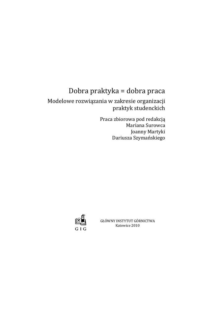 Dobra praktyka = dobra praca Modelowe rozwiązania w zakresie organizacji praktyk studenckich Praca zbiorowa pod redakcją Mariana Surowca Joanny Martyki Dariusza Szymańskiego GŁÓWNY INSTYTUT GÓRNICTWA Katowice 2010 3 SPIS TREŚCI 1. Wprowadzenie (J. Martyka, M. Surowiec) ........................................................................... 7 2. Stan prawny praktyk studenckich (M. Surowiec, J. Loska) ............................................... 9 3. Charakterystyka organizacji praktyk studenckich przed wdrożeniem wzorcowych rozwiązań (M. Majer, J. Martyka, K. Nowak, K. Tausz, M. Zielińska) ........................................................................................................................ 12 3.1. Metodologia badań .................................................................................................... 12 3.2. Praktyki studenckie w świetle danych empirycznych ................................................ 15 3.3. Merytoryczny aspekt praktyk..................................................................................... 15 3.4. Organizacyjny aspekt praktyk .................................................................................... 18 3.5. Formalny aspekt praktyk............................................................................................ 24 3.6. Podsumowanie ........................................................................................................... 29 4. Wzorcowe praktyki studenckie – podstawowe założenia (M. Surowiec, J. Loska) ....................................................................................................... 30 4.1. Opracowanie rozwiązań w obszarze merytorycznym ................................................ 30 4.1.1. 4.1.2. 4.1.3. 4.1.4. 4.2. Wytyczne dla osób zaangażowanych w organizację i realizację praktyk .................. 30 Wytyczne dla opiekunów praktyk w firmie .............................................................. 30 Wytyczne dla opiekunów praktyk na uczelni ............................................................ 32 Wytyczne dla studentów ........................................................................................... 33 Opracowanie rozwiązań w obszarze formalnym ....................................................... 34 4.2.1. 4.2.2. 4.2.3. Opracowanie wzorów dokumentów .......................................................................... 34 Instrukcja praktyki .................................................................................................... 35 Opracowanie metody monitorowania praktyk........................................................... 35 5. Informatyczna metoda monitorowania praktyk – platforma internetowa (P. Kasprowski, A. Osyra) ................................................................................................... 38 5.1. Wymagania funkcjonalne .......................................................................................... 38 5.2. Wymagania niefunkcjonalne...................................................................................... 40 5.3. Projekt systemu .......................................................................................................... 42 5.4. Specyfikacja zewnętrzna ............................................................................................ 46 6. Realizacja praktyk objętych projektem (K. Baranowska, B. Bartoszek, E. Kimel, R. Wierzbicki, K. Łuczak, T. Niedziela, D. Szymański) ........................................ 73 6.1. Wdrożenie wzorcowych praktyk studenckich............................................................ 73 6.2. Portal WWW.PRAKTYKUJ.COM ........................................................................... 75 6.3. Przebieg praktyk ........................................................................................................ 76 6.4. Analiza sprawozdań studenta ..................................................................................... 77 Podsumowanie ..................................................................................................................... 86 6.5. Wnioski opiekunów praktyk ...................................................................................... 87 6.6. Sugestie zakładów pracy ............................................................................................ 89 7. Wzorcowe rozwiązania w zakresie praktyk studenckich – modyfikacja opracowanego modelu (K. Łuczak, T. Niedziela, D. Szymański) ....................................... 93 Podsumowanie (M. Surowiec) .................................................................................................. 96 Załączniki ................................................................................................................................. 99 5
